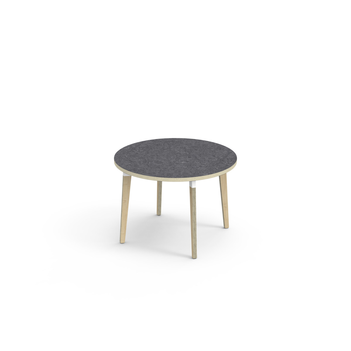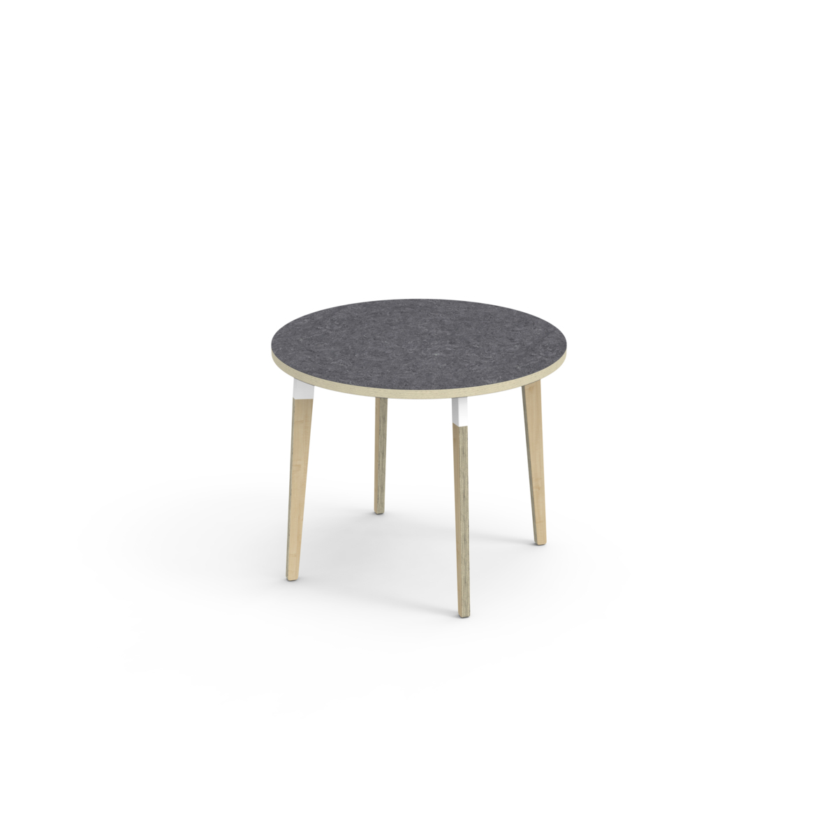 Bordsskiva belagd med akustik linoleum, vilket ger en mjuk och behaglig yta samtidigt som det bidrar till en bättre ljudmiljö. Med en hörnradie på 40 mm får bordet en modern och stilren design. Benen har en rektangulär form och är tillverkade av klarlackad björkplywood som är monterade i en robust svart metallhylsa. Denna konstruktion garanterar både stabilitet och hållbarhet. Benen är något snett vinklade ut mot bordsskivans hörn. Monteringen är enkel och smidig – du behöver bara fästa metallhylsorna i de förberedda fästpunkterna i bordsskivan.