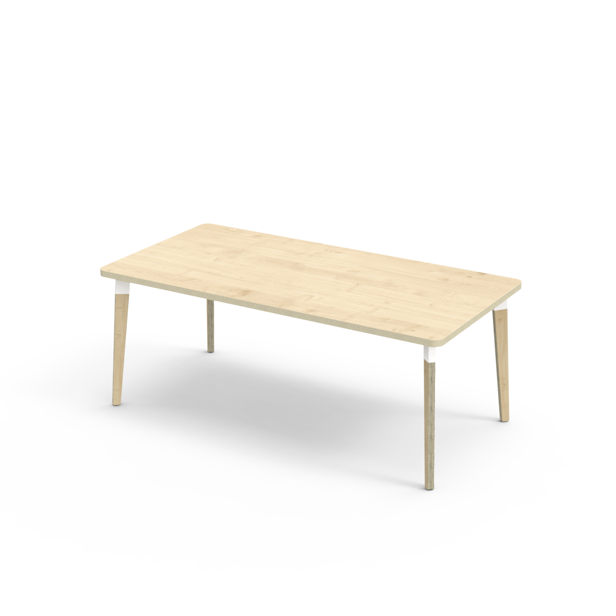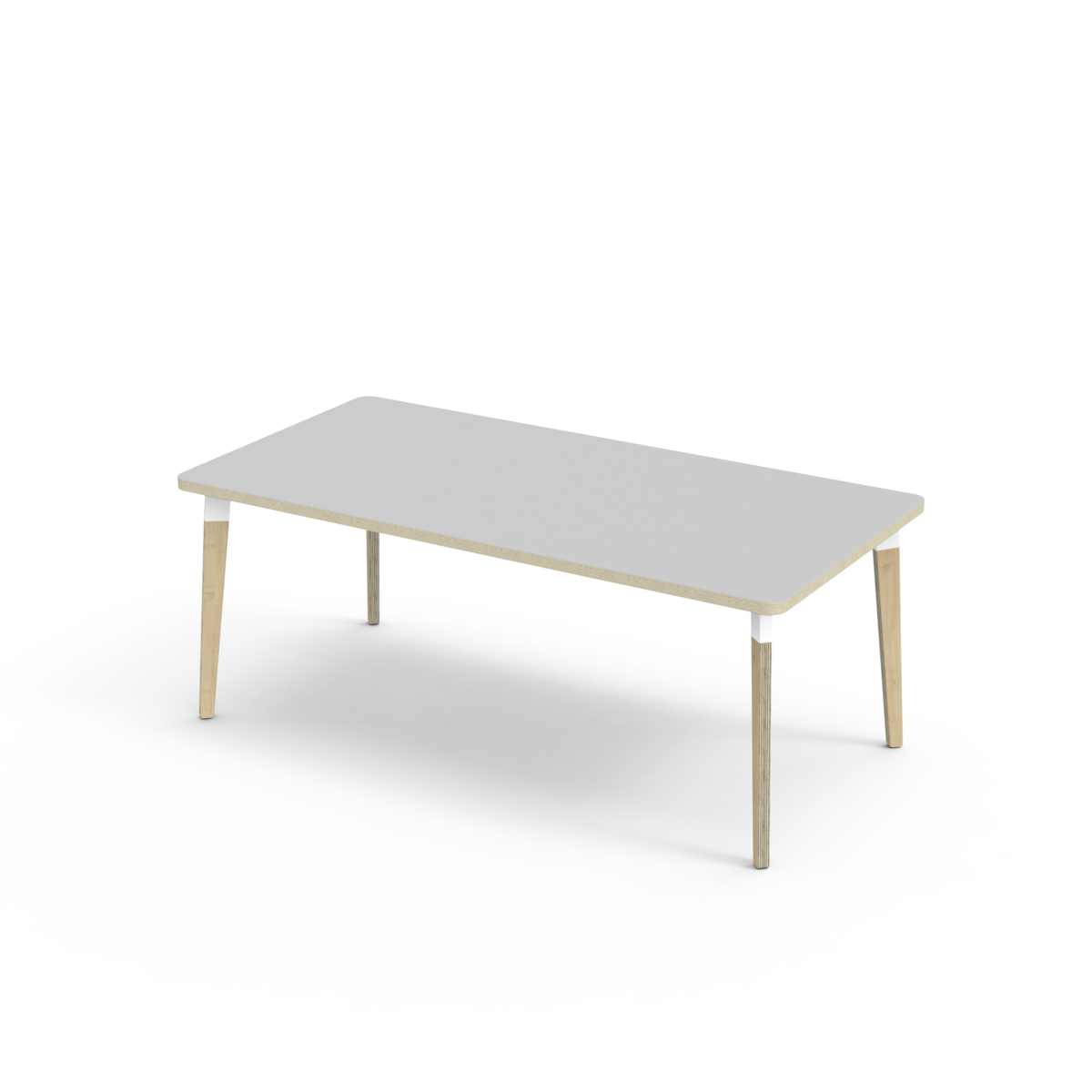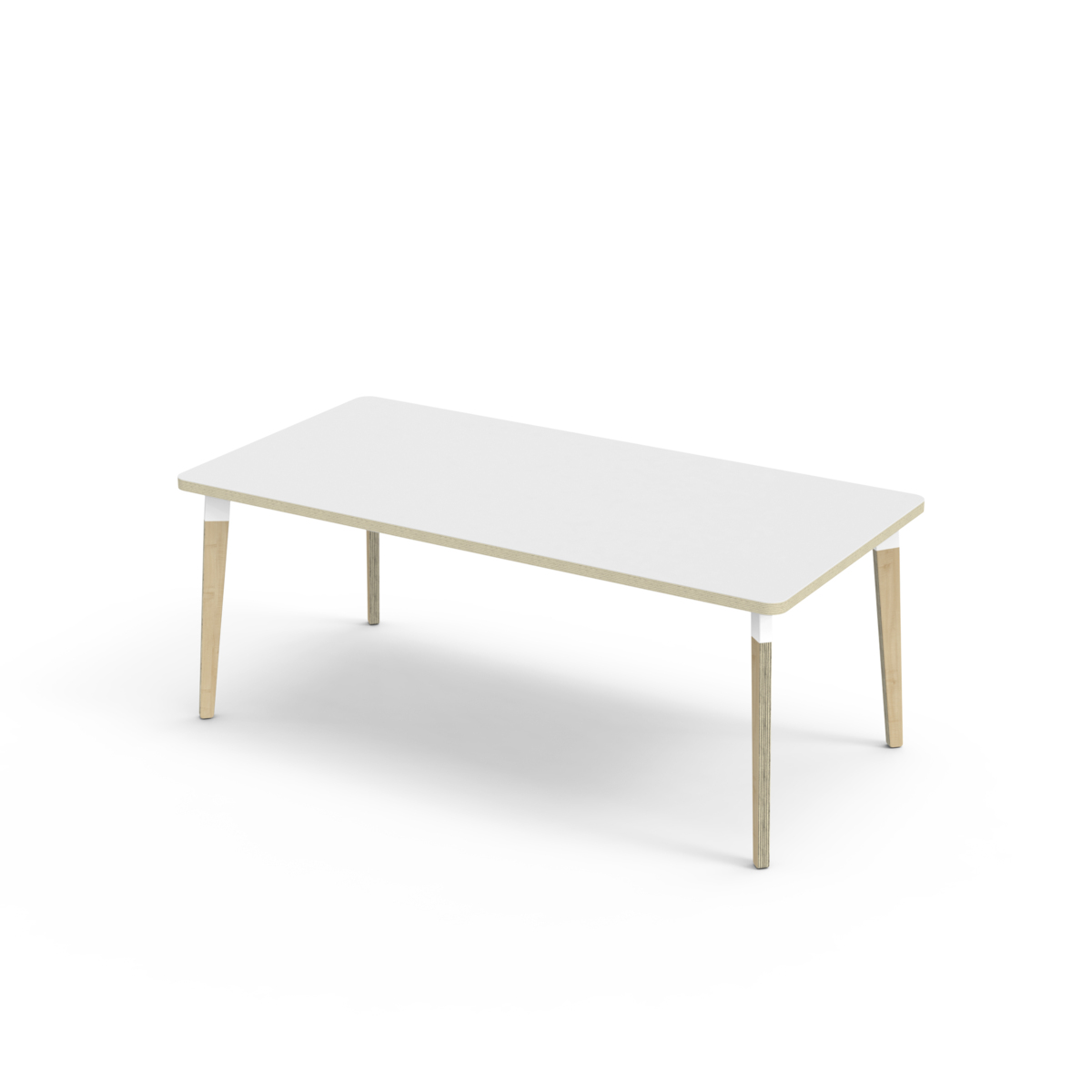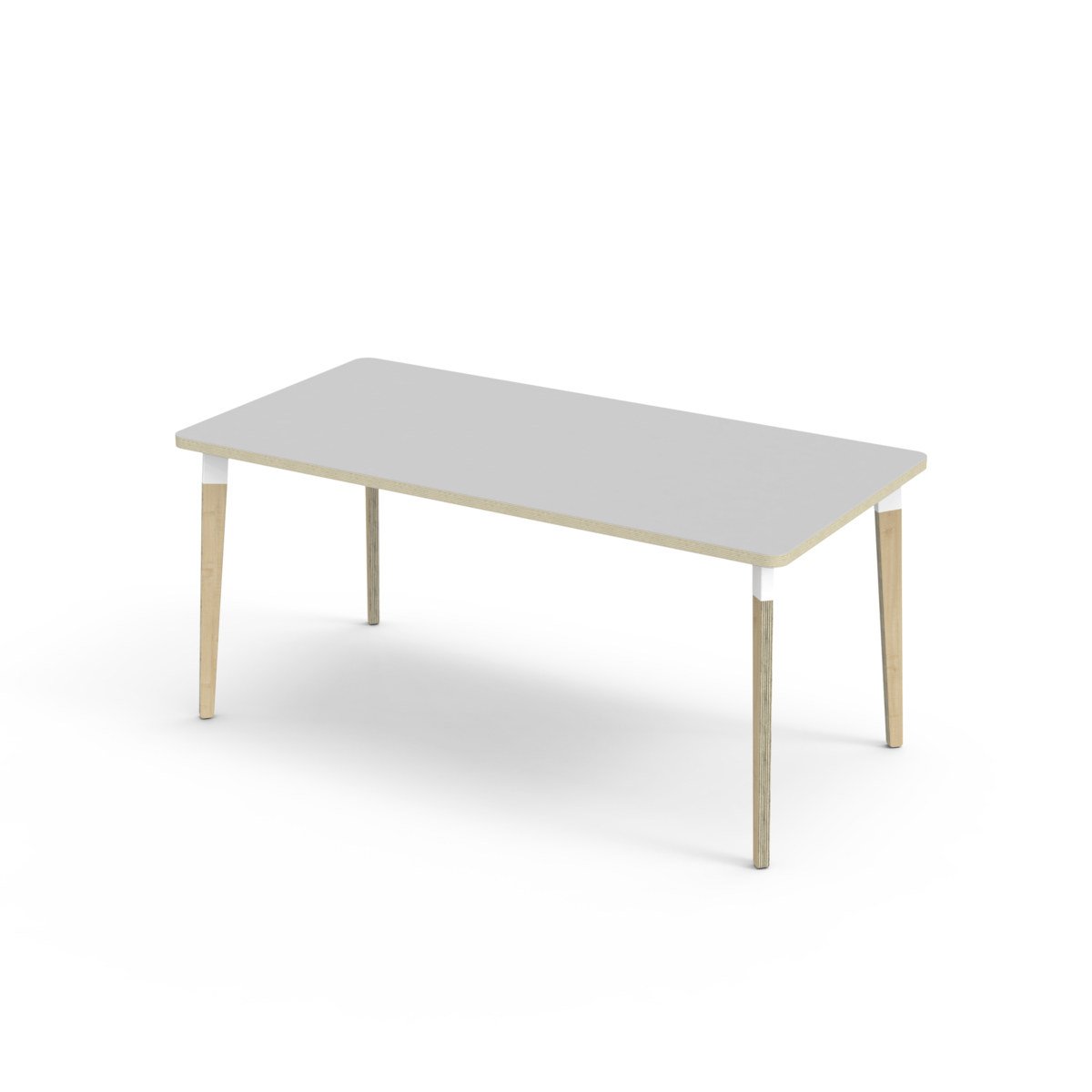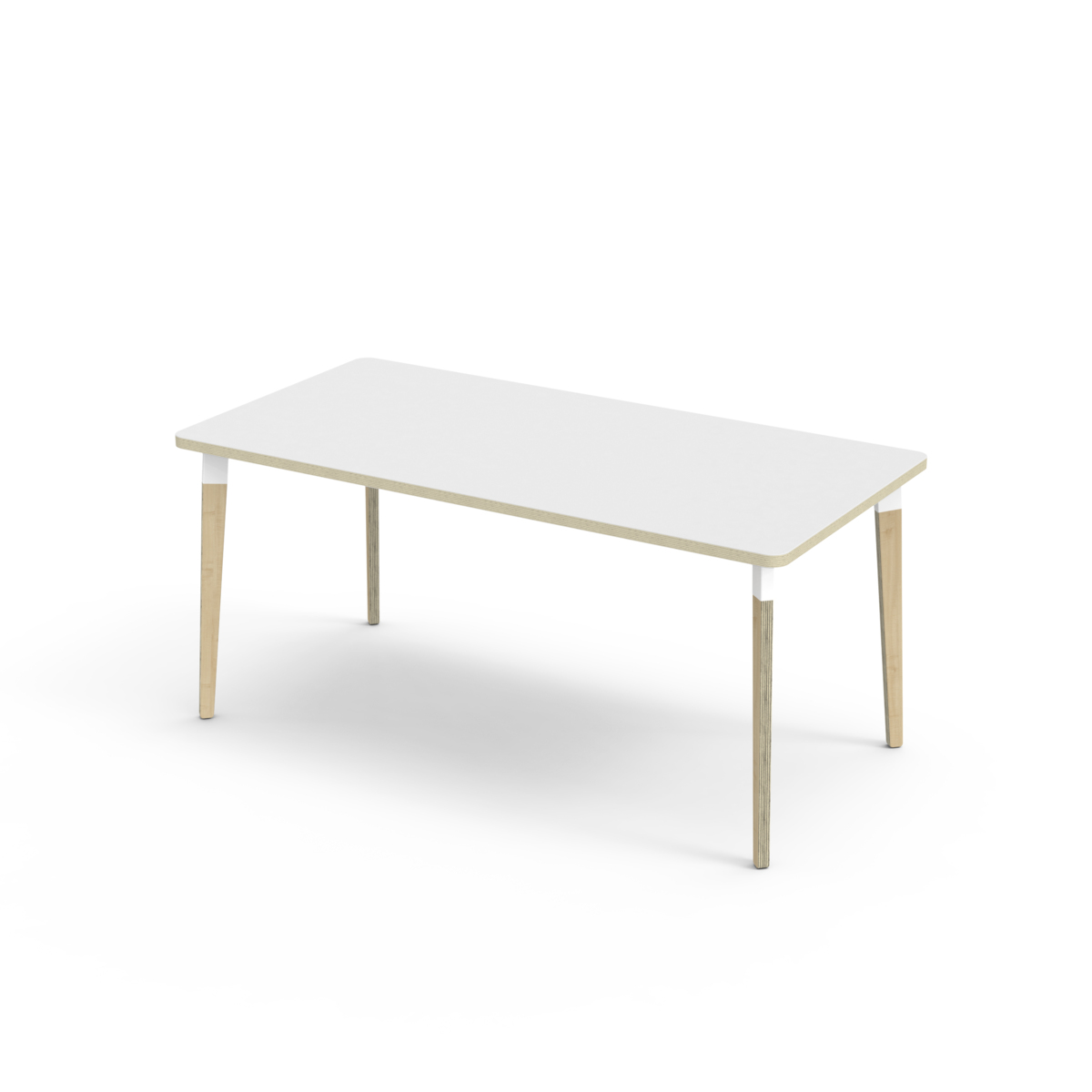 Bordsskiva belagd med laminat. Med en hörnradie på 40 mm får bordet en modern och stilren design. Benen har en rektangulär form och är tillverkade av klarlackad björkplywood som är monterade i en robust vit metallhylsa. Denna konstruktion garanterar både stabilitet och hållbarhet. Benen är något snett vinklade ut mot bordsskivans hörn. Monteringen är enkel och smidig – du behöver bara fästa metallhylsorna i de förberedda fästpunkterna i bordsskivan.