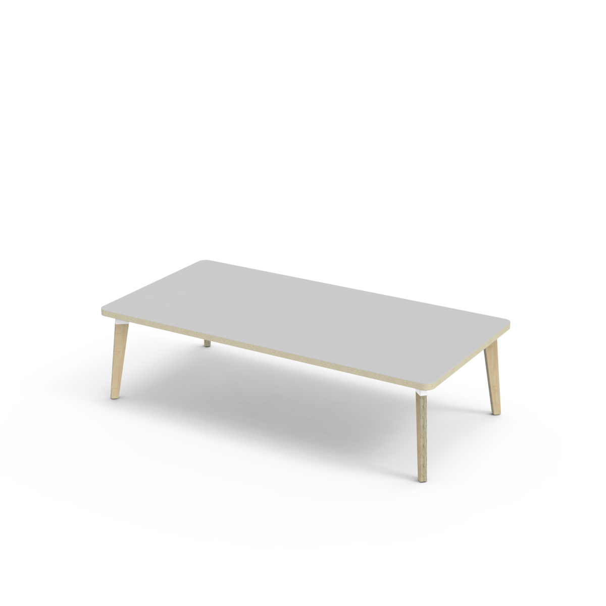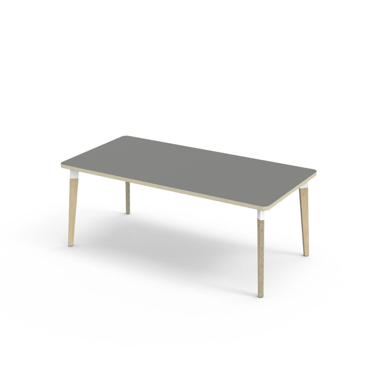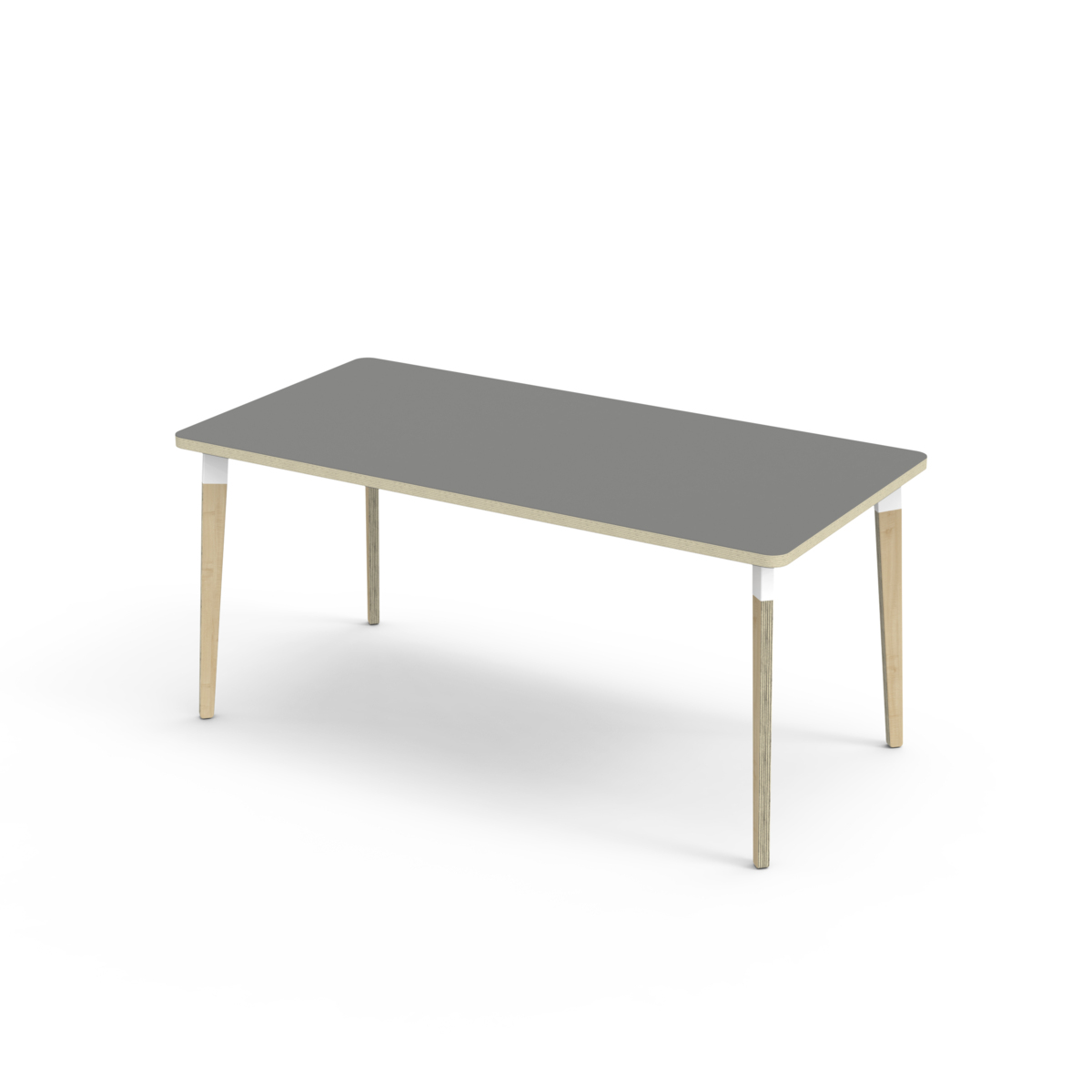 Bordsskiva belagd med akustik linoleum, vilket ger en mjuk och behaglig yta samtidigt som det bidrar till en bättre ljudmiljö. Med en hörnradie på 40 mm får bordet en modern och stilren design. Benen har en rektangulär form och är tillverkade av klarlackad björkplywood som är monterade i en robust vit metallhylsa. Denna konstruktion garanterar både stabilitet och hållbarhet. Benen är något snett vinklade ut mot bordsskivans hörn. Monteringen är enkel och smidig – du behöver bara fästa metallhylsorna i de förberedda fästpunkterna i bordsskivan.