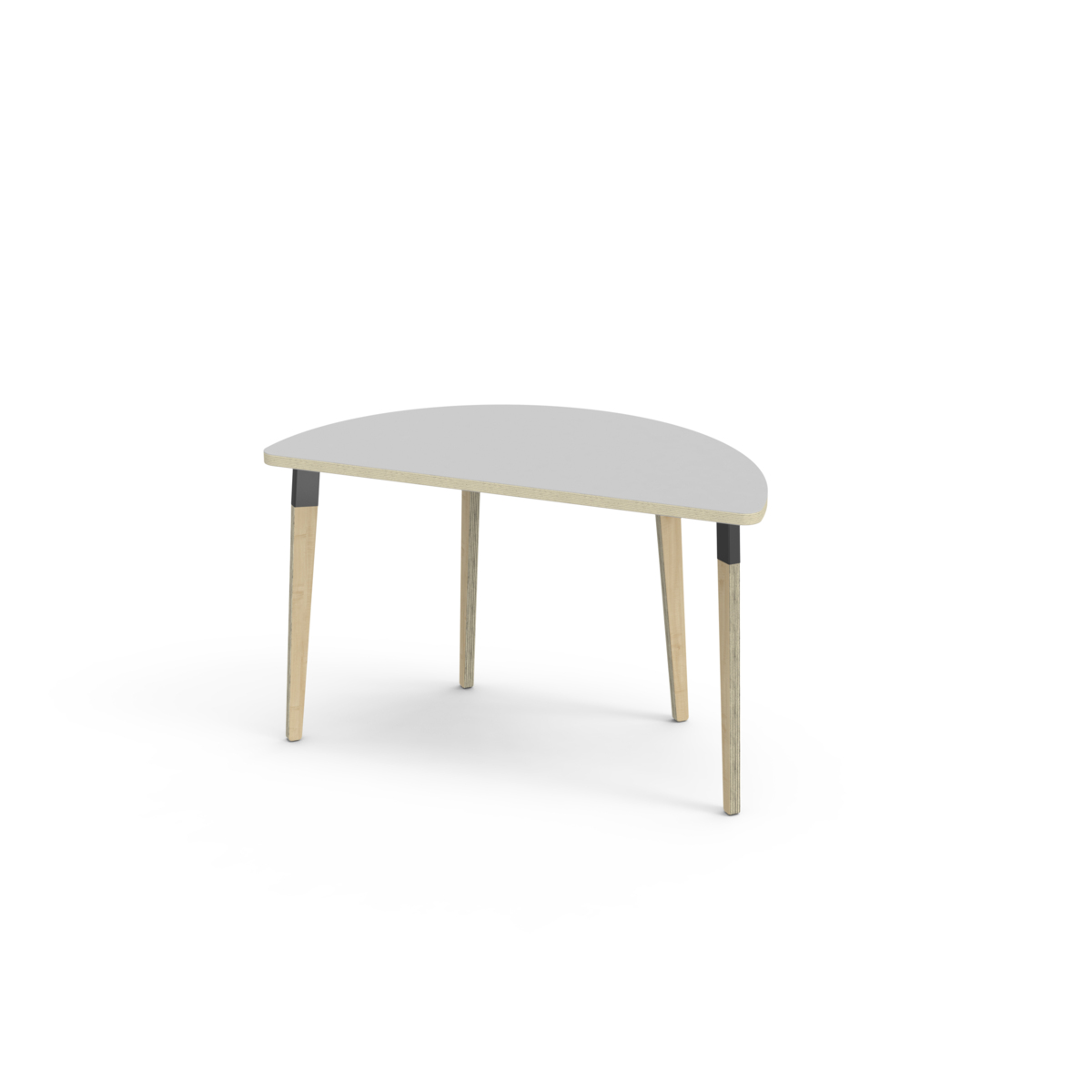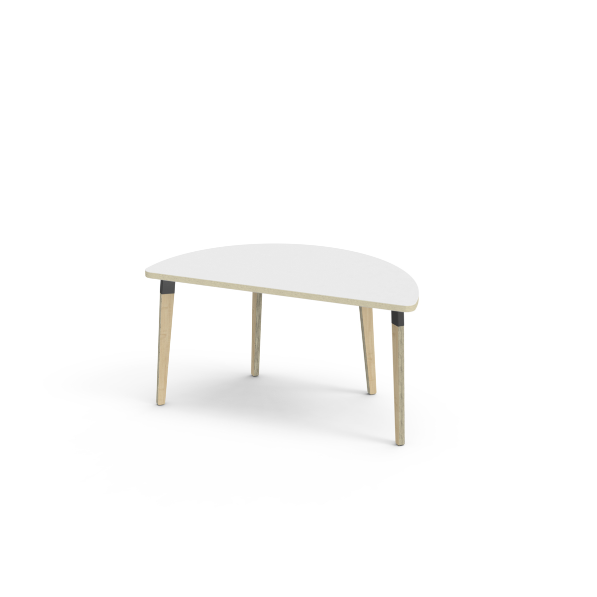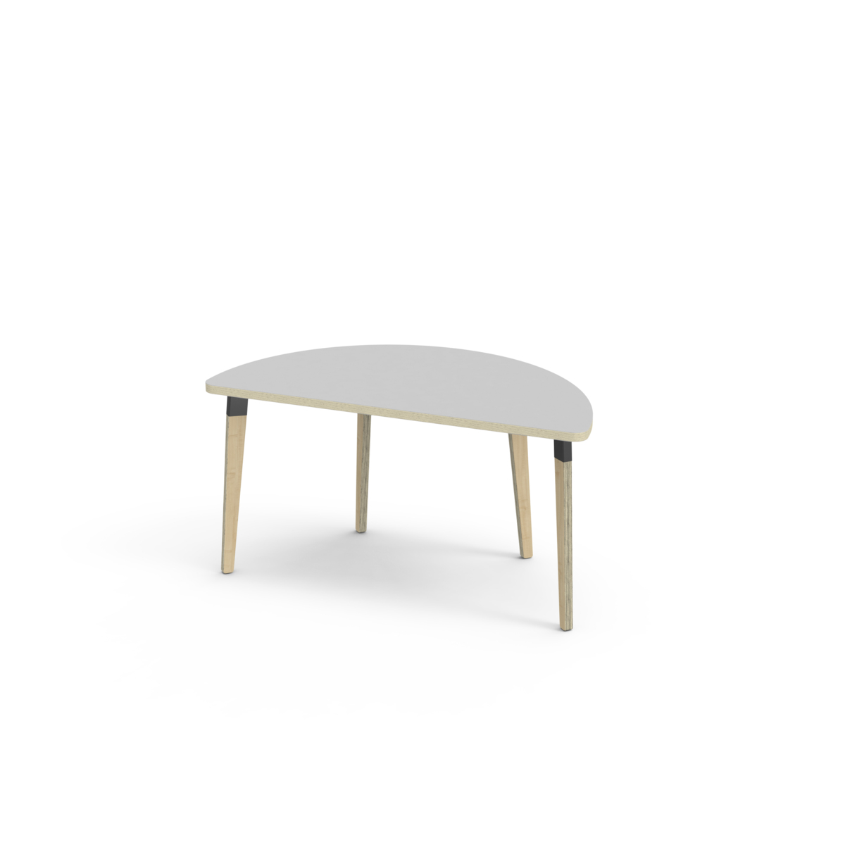 Bordsskiva belagd med akustik linoleum, vilket ger en mjuk och behaglig yta samtidigt som det bidrar till en bättre ljudmiljö. Med en hörnradie på 40 mm får bordet en modern och stilren design. Benen har en rektangulär form och är tillverkade av klarlackad björkplywood som är monterade i en robust vit metallhylsa. Denna konstruktion garanterar både stabilitet och hållbarhet. Benen är något snett vinklade ut mot bordsskivans hörn. Monteringen är enkel och smidig – du behöver bara fästa metallhylsorna i de förberedda fästpunkterna i bordsskivan.