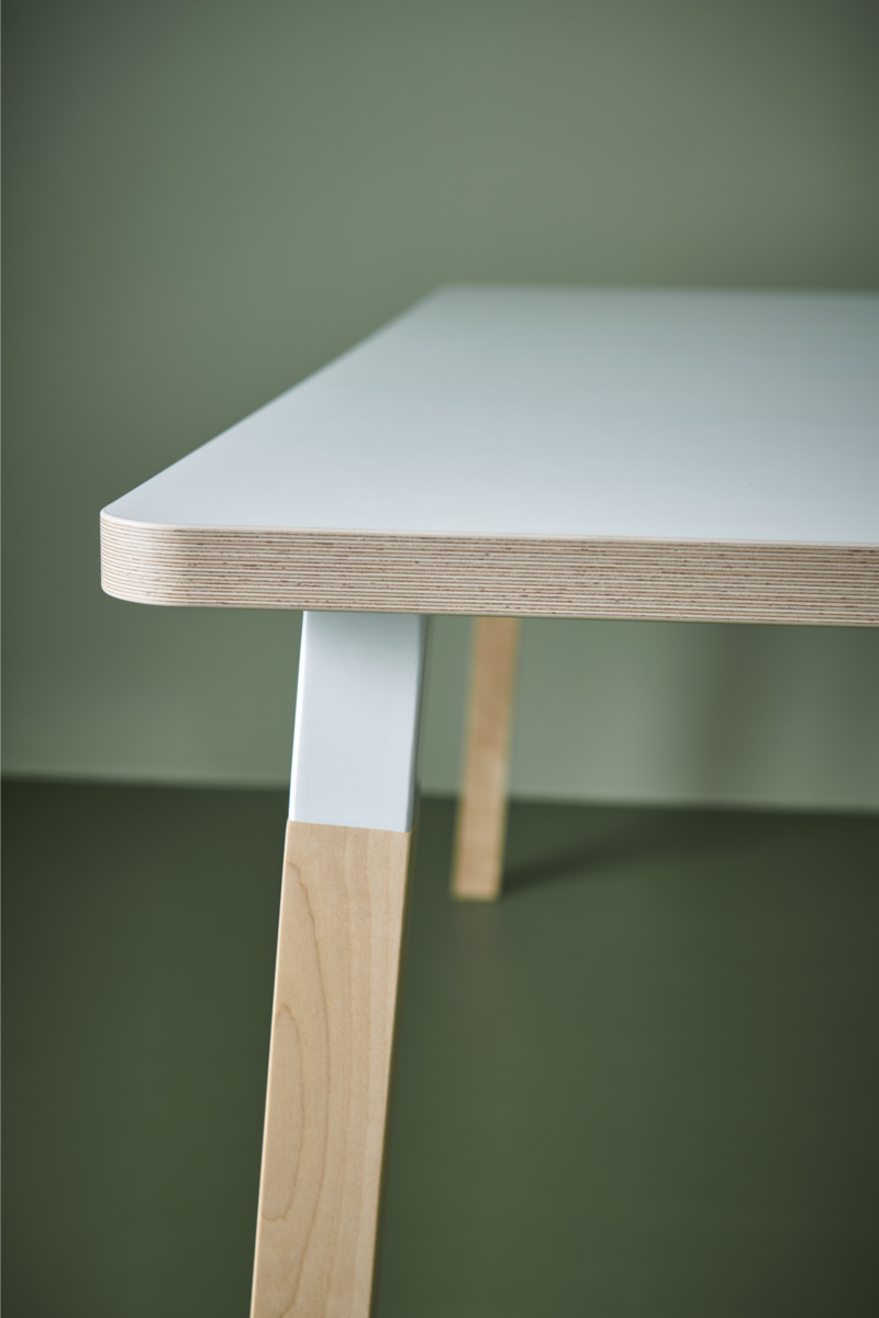 Ljuddämpande bordsskiva belagd med högtryckslaminat, vilket ger en tålig yta. Med en hörnradie på 40 mm får bordet en modern och stilren design. Benen är tillverkade av klarlackad massiv björk och monterade i en robust vit metallhylsa. Denna konstruktion garanterar både stabilitet och hållbarhet. Benen är något snett vinklade ut mot bordsskivans hörn. Monteringen är enkel och smidig – du behöver bara fästa metallhylsorna i de förberedda fästpunkterna i bordsskivan.
