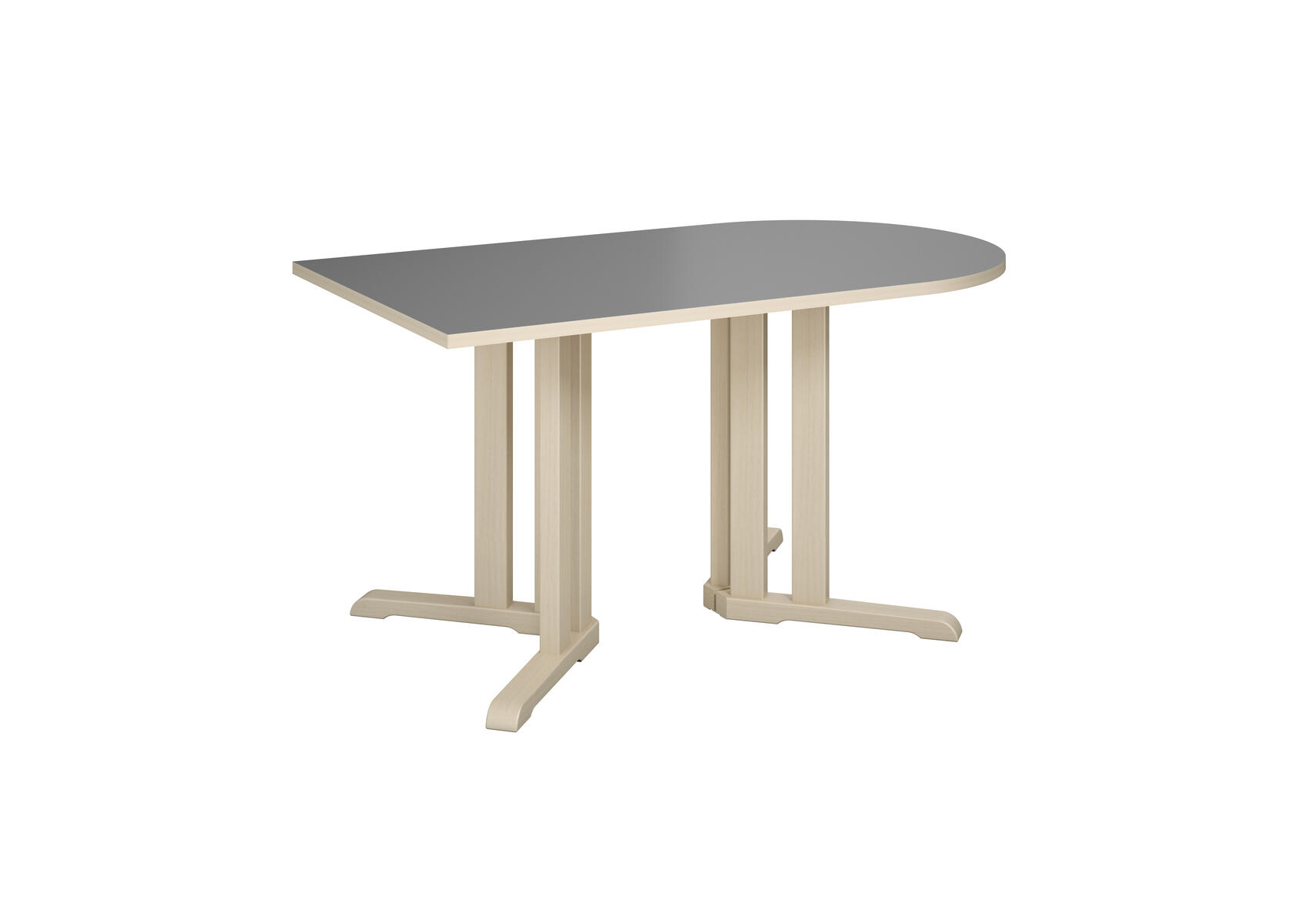 Tack vare den smarta designen på stativet ges det plats för fler barn runt bordet. Skiva belagd med ljuddämpande linoleum, som är ett tåligt och ljuddämpande naturmaterial helt fritt från PVC och ftalater. Stativ i klarlackerad, massiv björk.