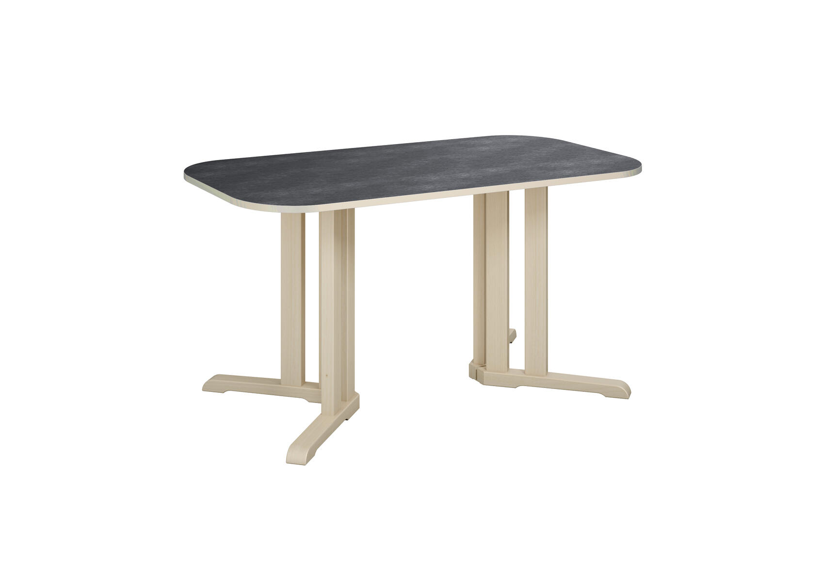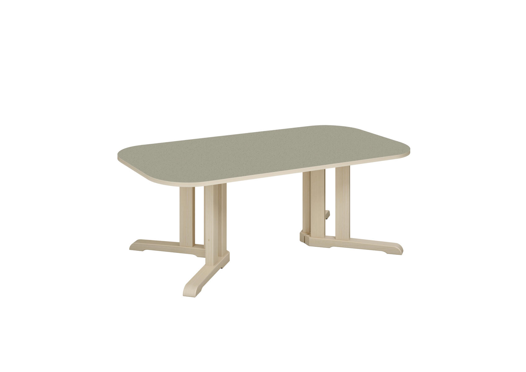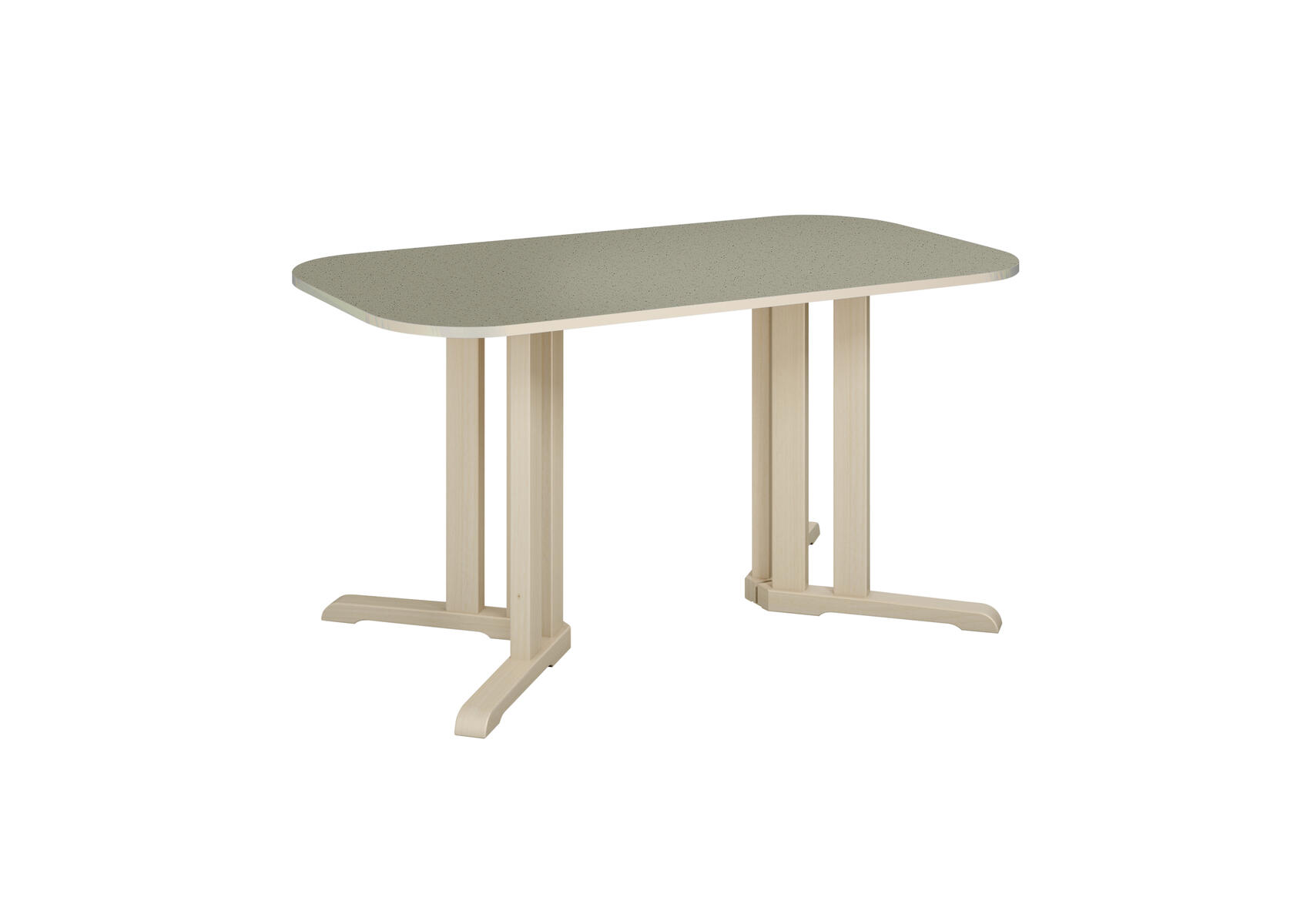 Tack vare den smarta designen på stativet ges det plats för fler barn runt bordet. Skiva belagd med ljuddämpande linoleum, som är ett tåligt och ljuddämpande naturmaterial helt fritt från PVC och ftalater. Stativ i klarlackerad, massiv björk. Avrundade hörn.