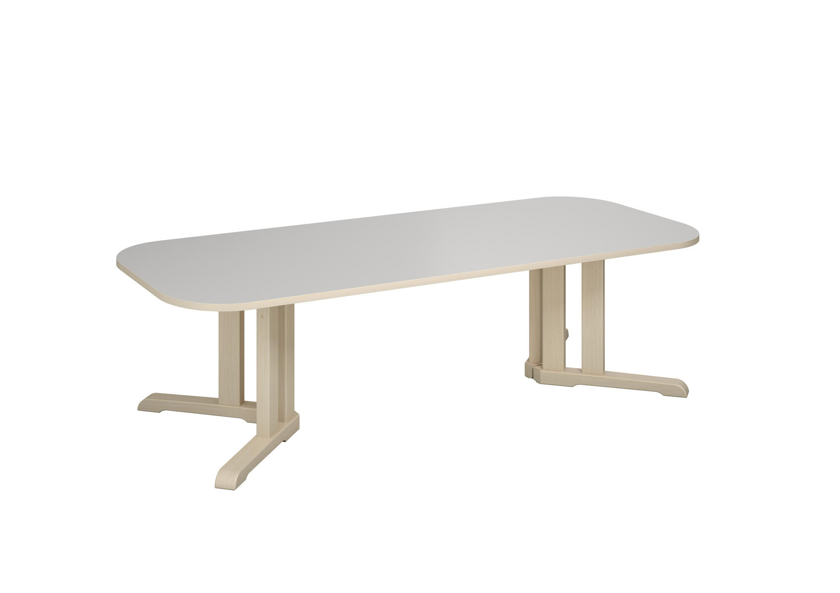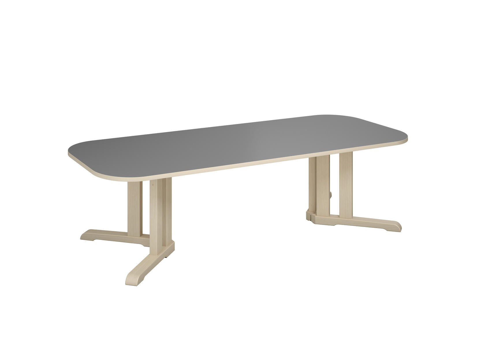 Tack vare den smarta designen på stativet ges det plats för fler barn runt bordet. Skiva belagd med ljuddämpande linoleum, som är ett tåligt och ljuddämpande naturmaterial helt fritt från PVC och ftalater. Stativ i klarlackerad, massiv björk. Avrundade hörn.