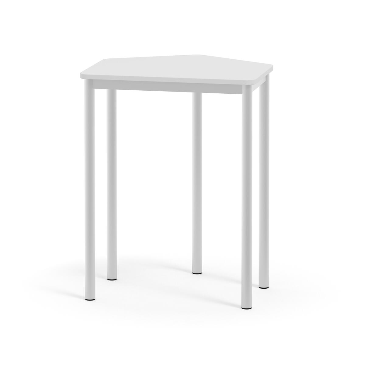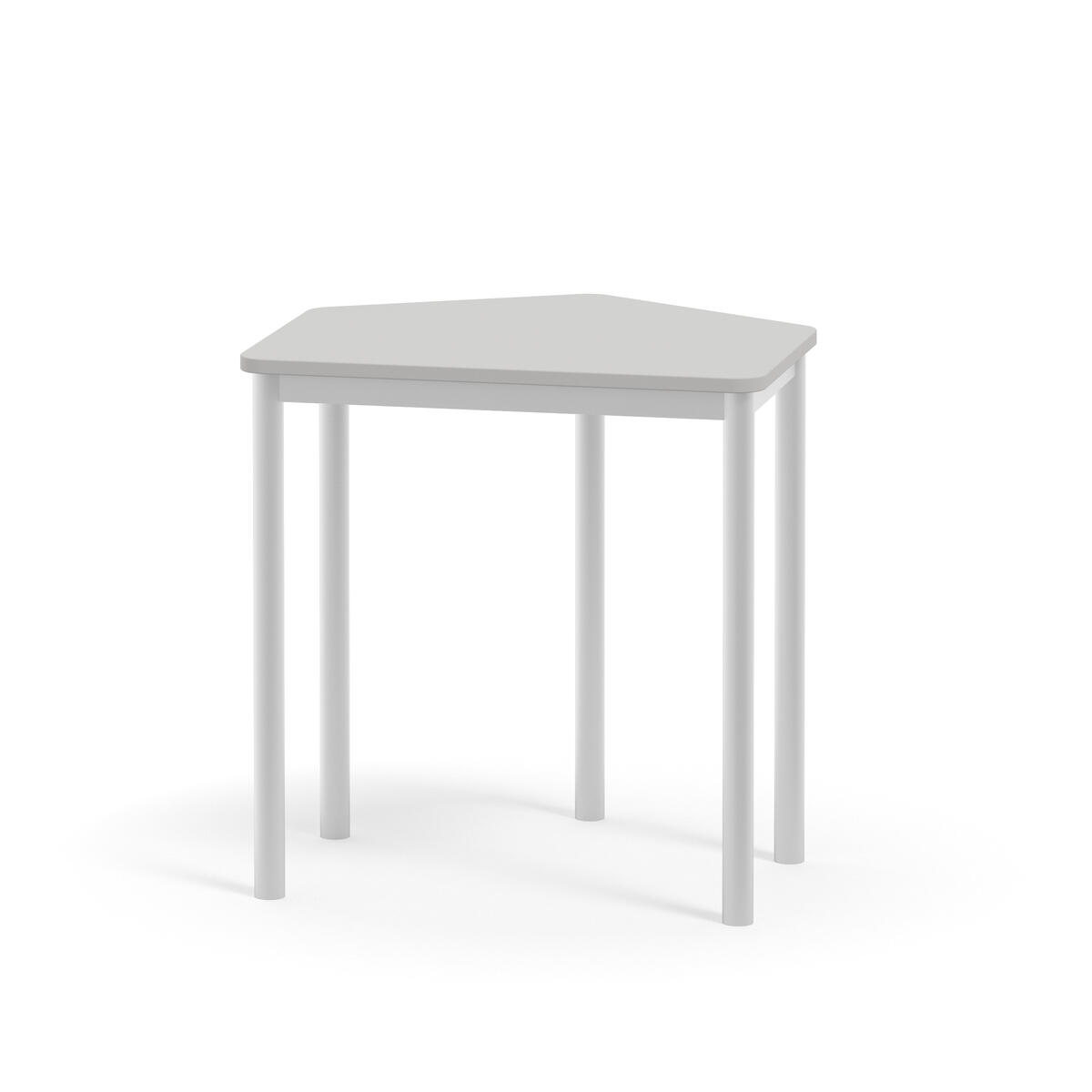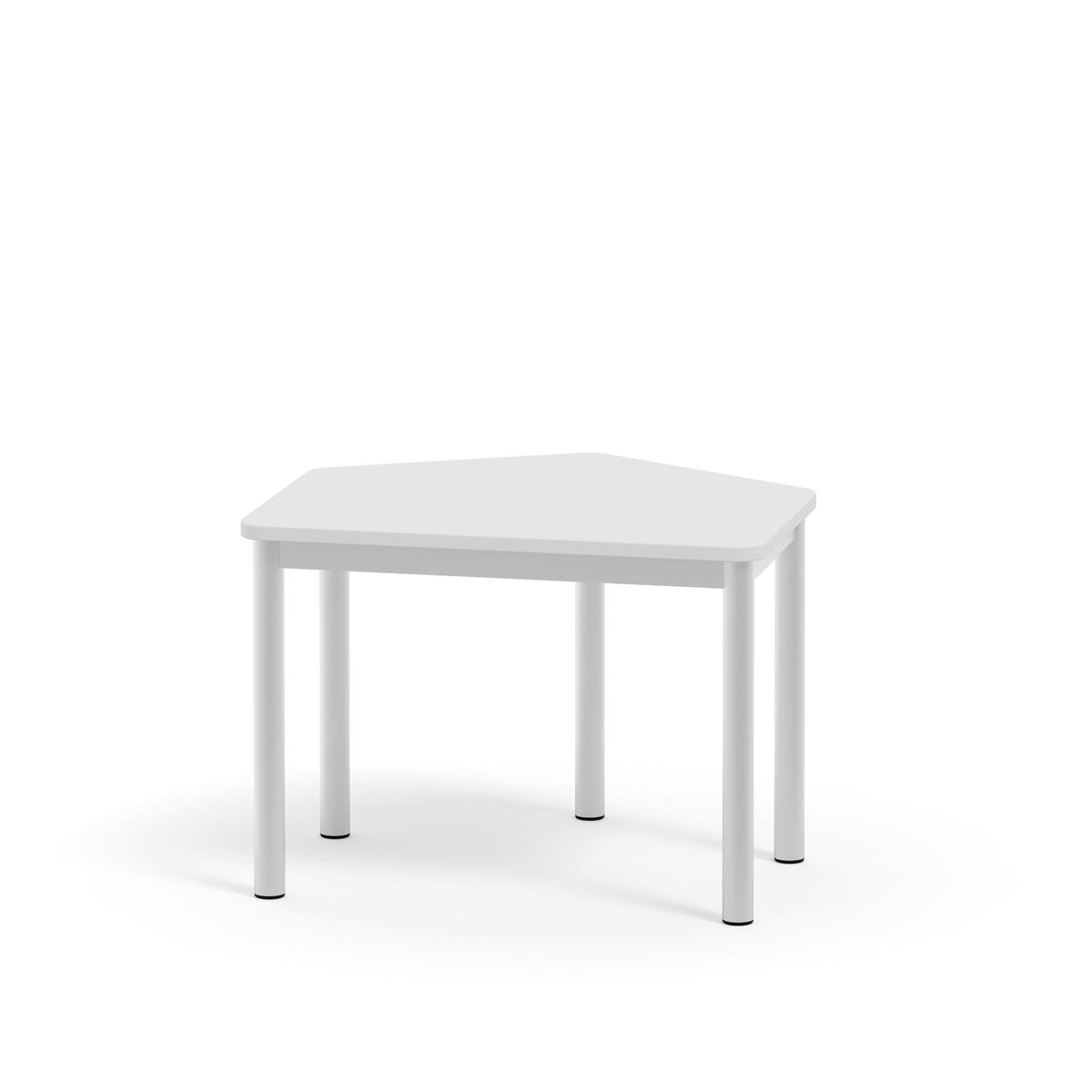 Bordsskiva i hexagonform belagd med ljuddämpande högtryckslaminat och ljudabsorbent på undersidan. Ställbara tassar för anpassning till ojämna ytor. Stativet lackerat i vitt RAL 9003.