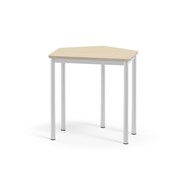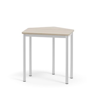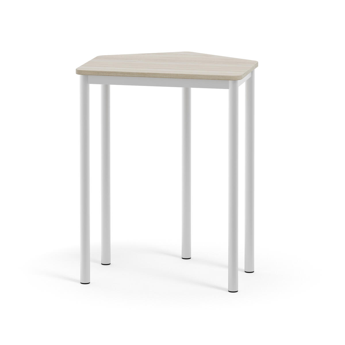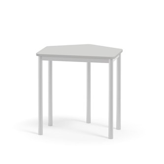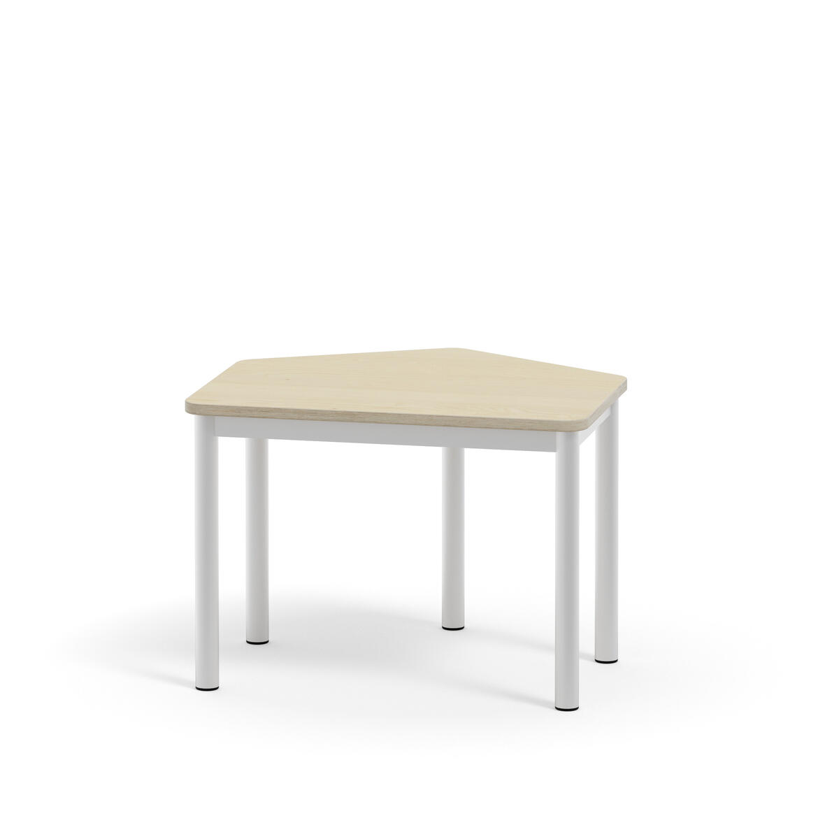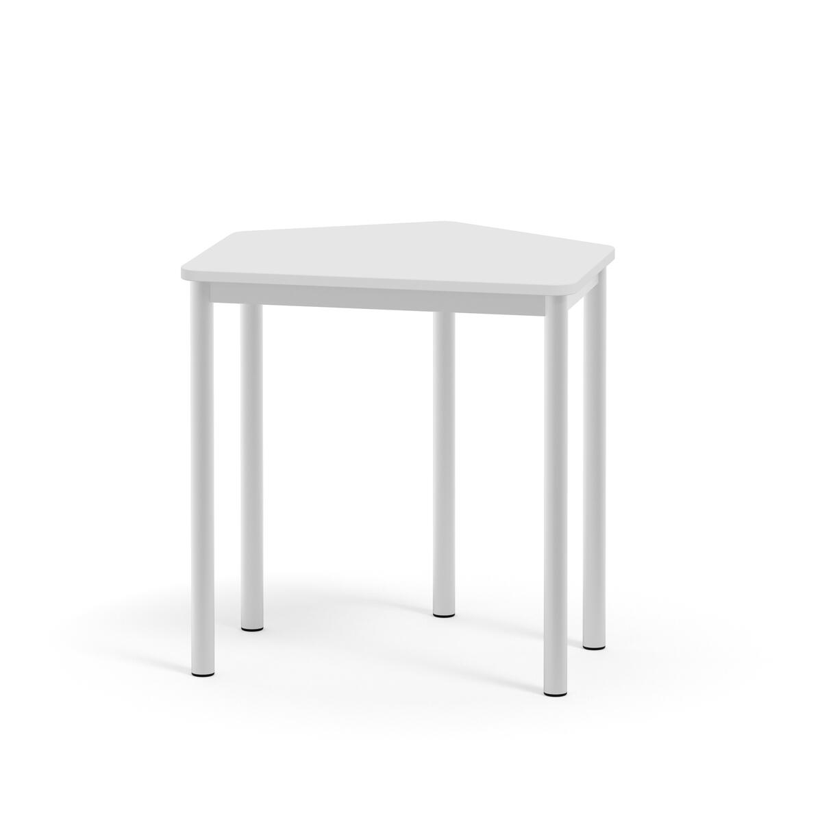 Bordsskiva i hexagonform belagd med ljuddämpande högtryckslaminat och ljudabsorbent på undersidan. Ställbara tassar för anpassning till ojämna ytor. Stativet lackerat i vitt RAL 9003.