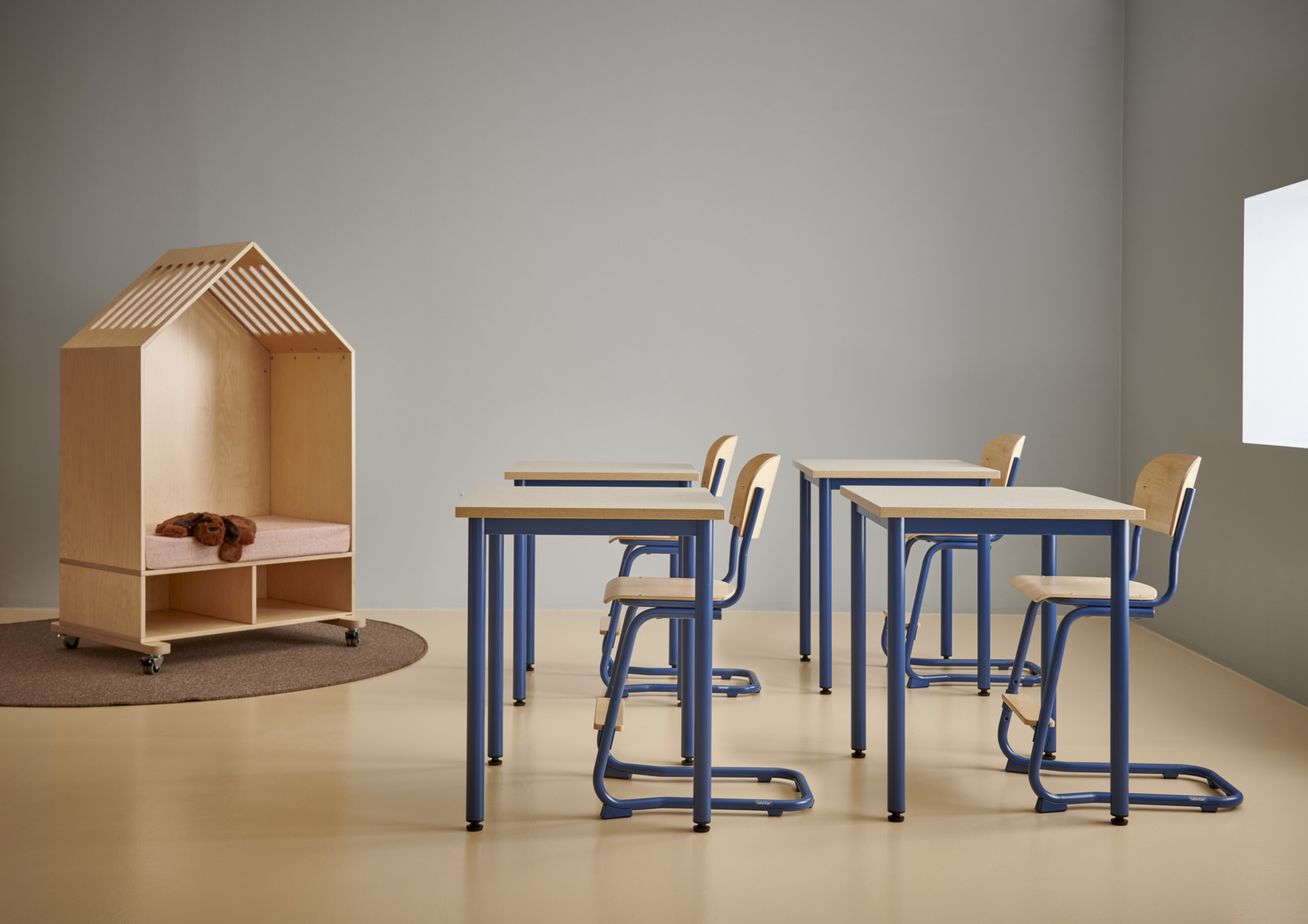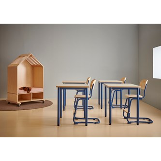 Bordsskiva med ljuddämpande yta i linoleum och ljudabsorbent på undersidan. Ställbara tassar för anpassning till ojämna ytor. Stativet lackerat i silver RAL 9006.