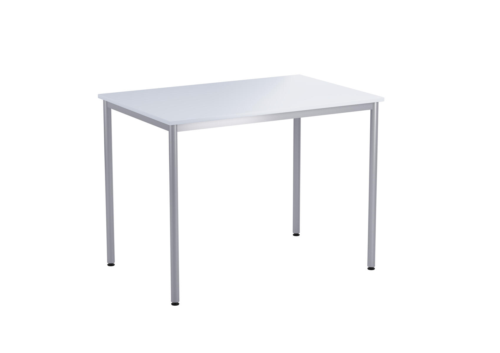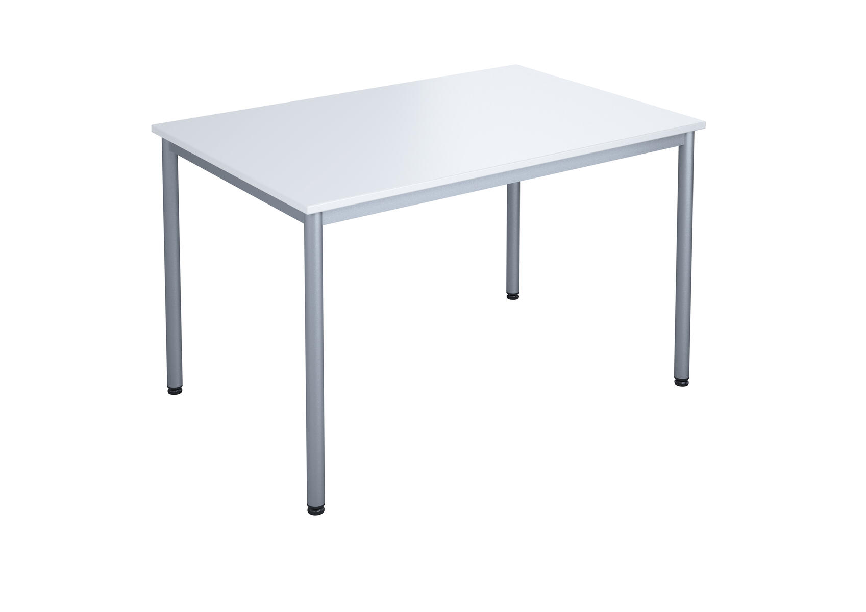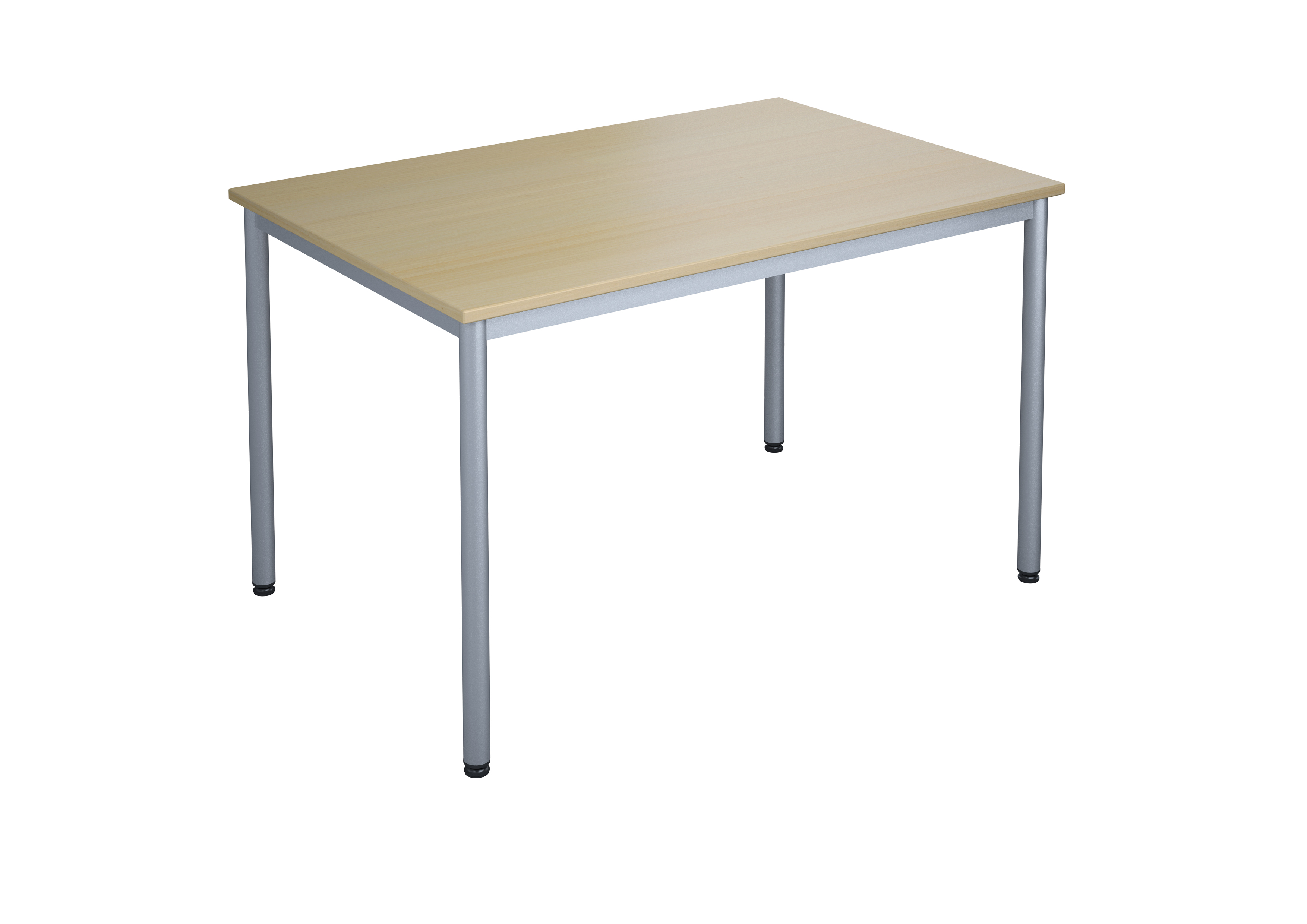 Bordsskiva i melamin. Ställbara tassar för anpassning till ojämna ytor. Stativet lackerat i silver RAL 9006.