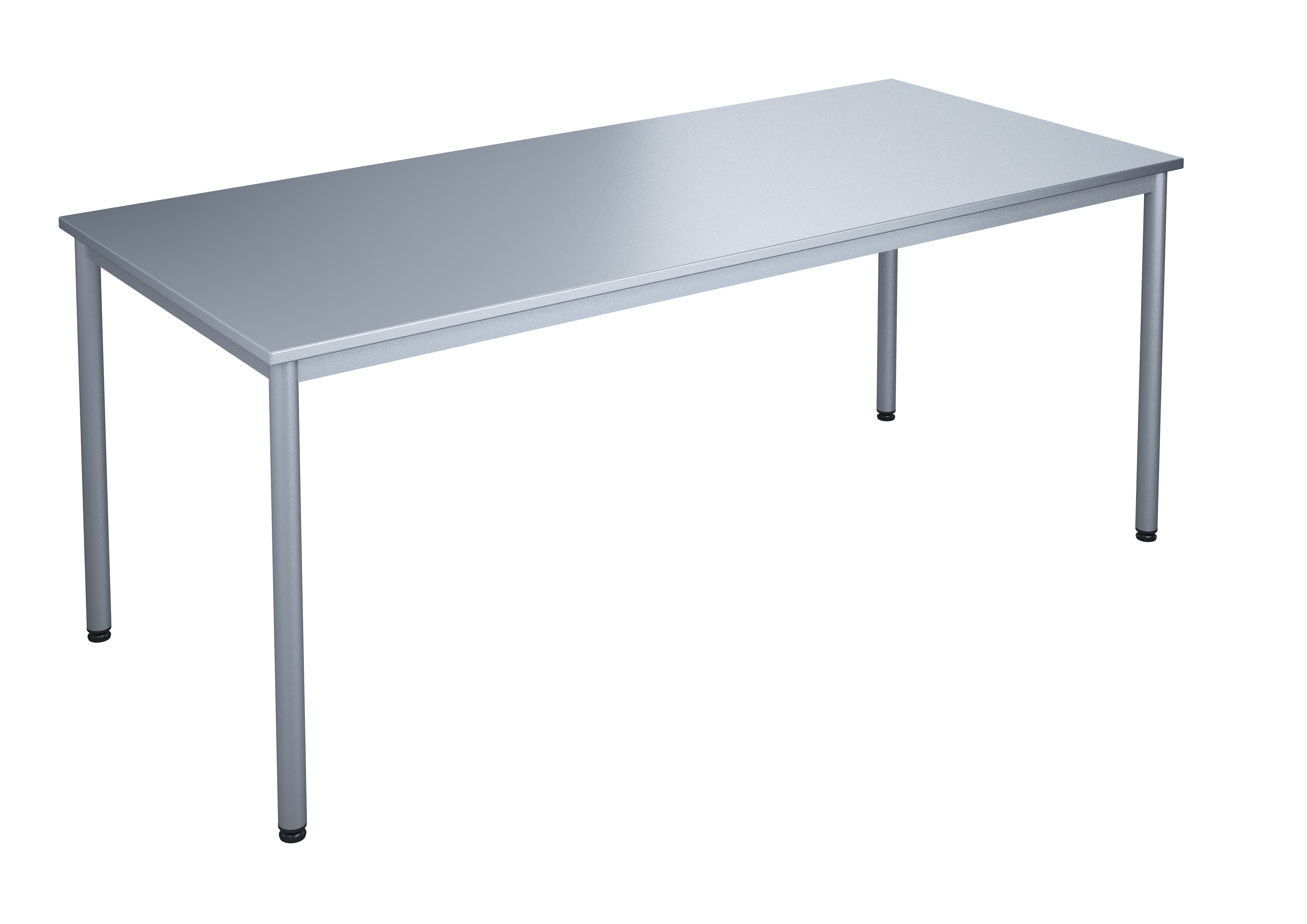 Bordsskiva i laminat. Ställbara tassar för anpassning till ojämna ytor. Stativet lackerat i silver RAL 9006.