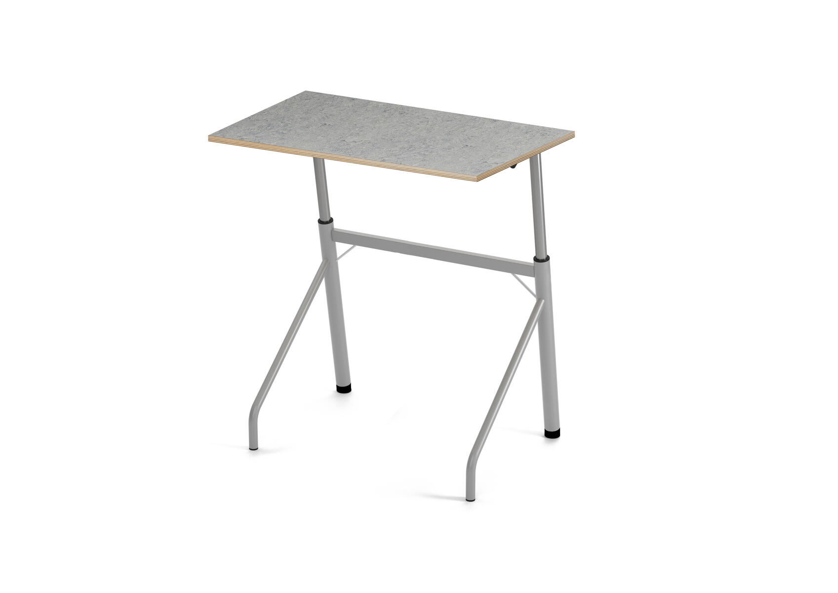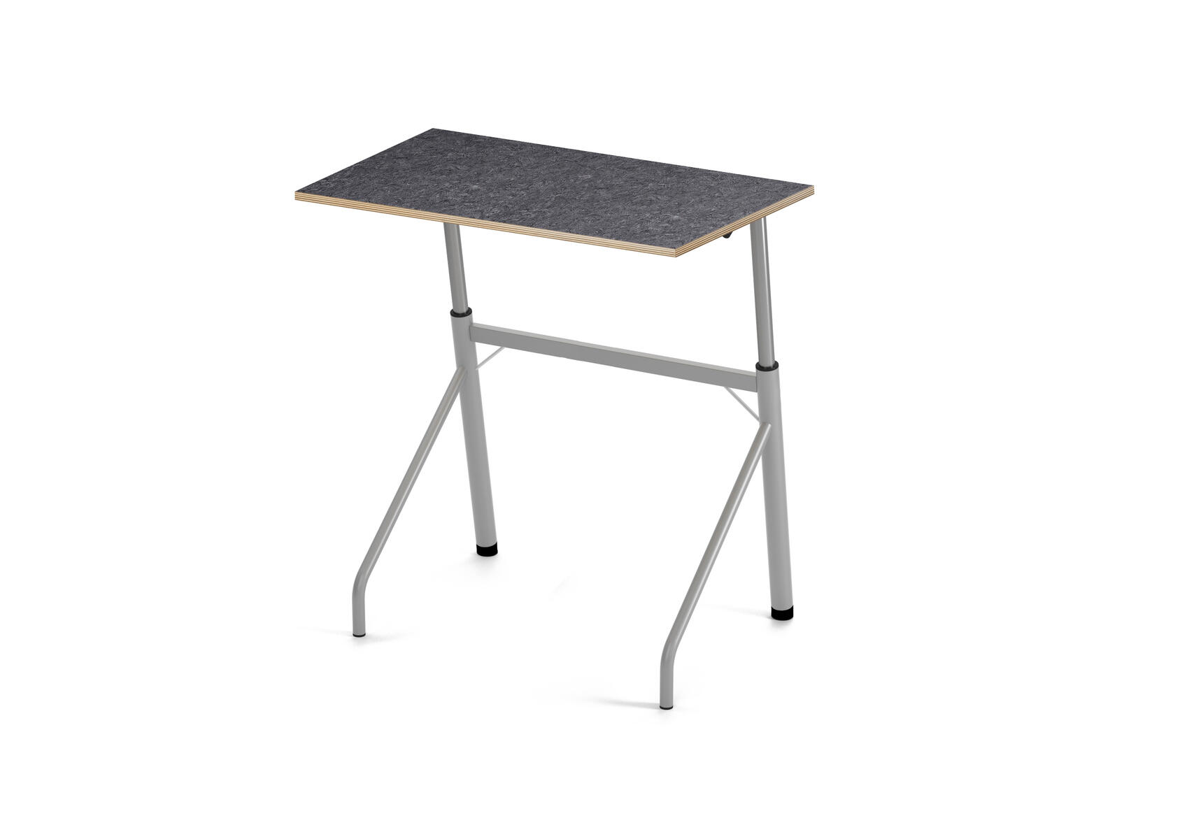 Ett praktiskt elevbord med ställbara tassar på de bakre benen. Välj mellan ställbara tassar och hjul på de främre benen. Pulverlackerat metallstativ. Bordsskiva i akustik linoleum.