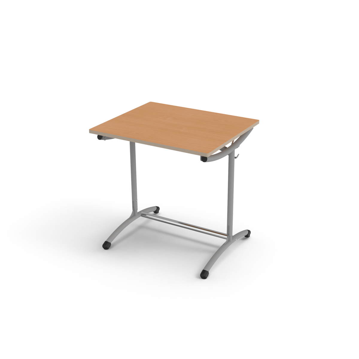Ställskruvar på alla ben. Dubbla väskkrokar. Tillval: reglerbart fotstöd. Mått: B70xD60 cm. Arbetshöjden justerbar mellan 64 och 88 cm. Bordsskiva i massivt trä. Stativ i silver, RAL 9006.