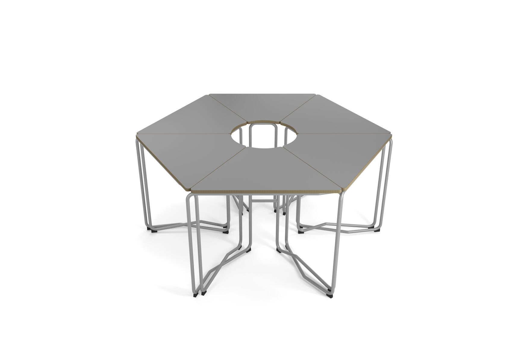 Staplingsbart och lätt elevbord som är enkelt att flytta. Borden kan kopplas ihop med varandra på sidorna. 6 bord bildar en hexagon. Skiva i högtryckslaminat. Svart skiva är i Fenixlaminat som är extra tåligt mot repor och fingeravtryck.