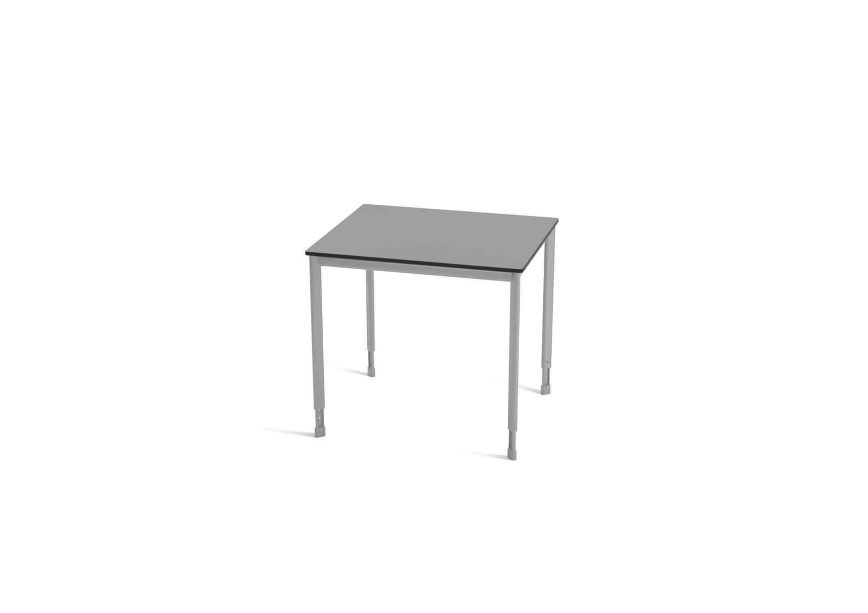 Skiva i kompaktlaminat med svart kant. Helsvetsat stativ i RAL 9006. Ställbart i höjderna 57-60-63-66-69 cm.