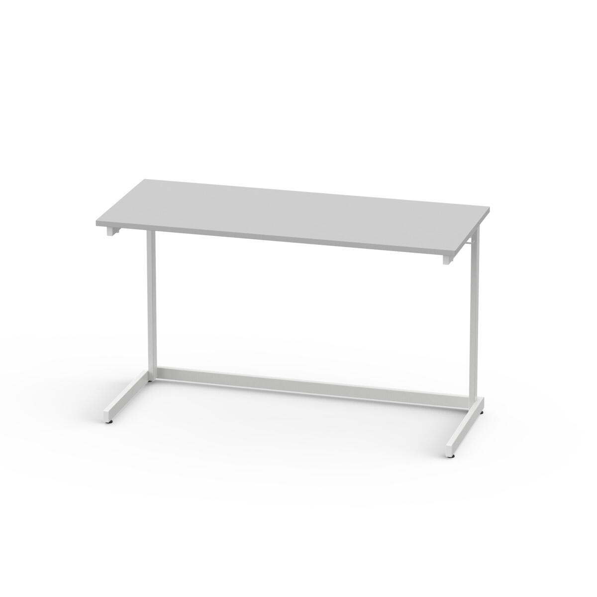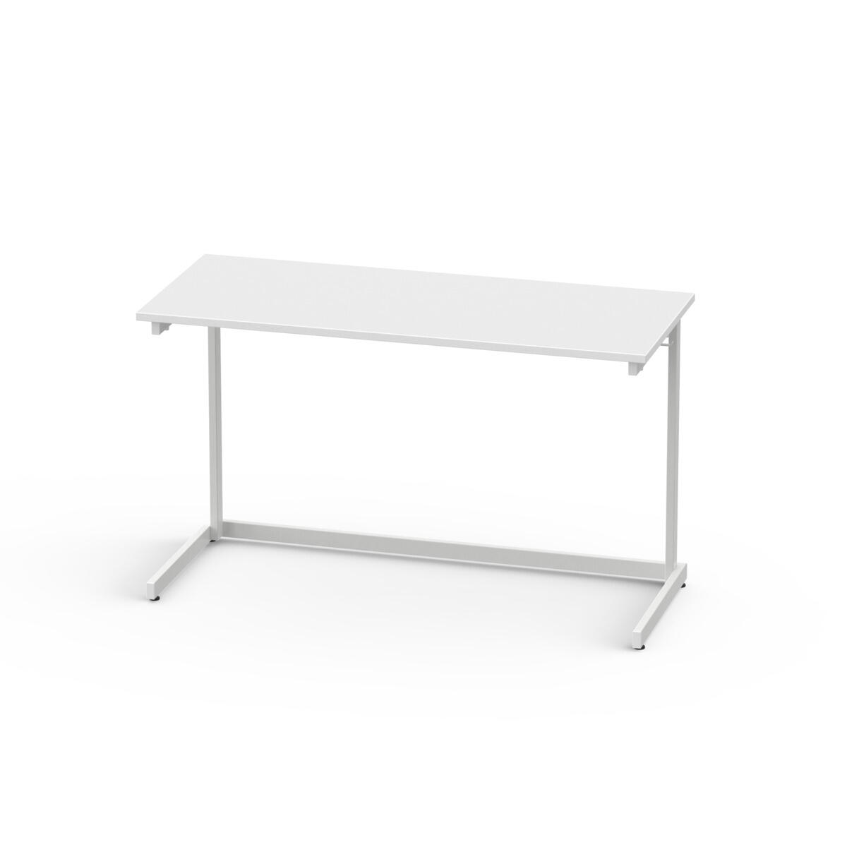 L-formad design på stativet gör det möjligt att stapla borden (max 6 st) på varandra. Helsvetsat stativ i vitt, RAL 9003. Bordsskiva i laminat. Fyra ställbara fötter. Väskkrok. Välj till monterade lådskenor under bordsskivan för förvaringslåda, art.nr 23416.
