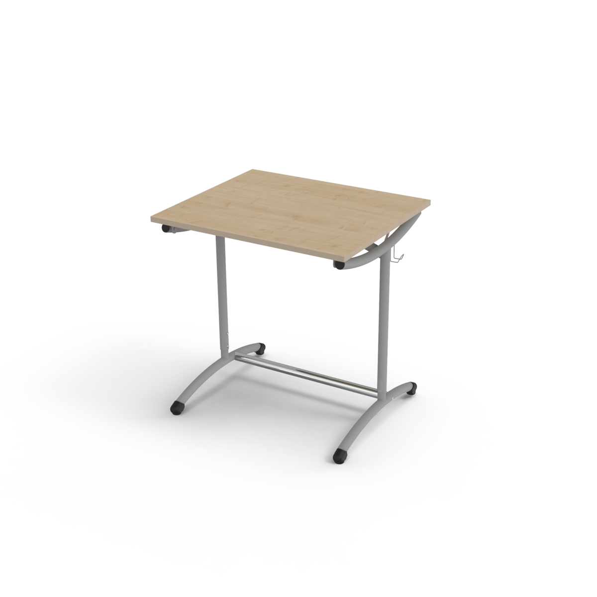 Skivan kan vinklas 8, 12 eller 16 grader. Ställskruvar på främre ben. Dubbla väskkrokar. Mått: L70xD60 cm. Arbetshöjden justerbar mellan 70 och 100 cm. Bordsskiva i högtryckslaminat. Stativ i silver, RAL 9006.