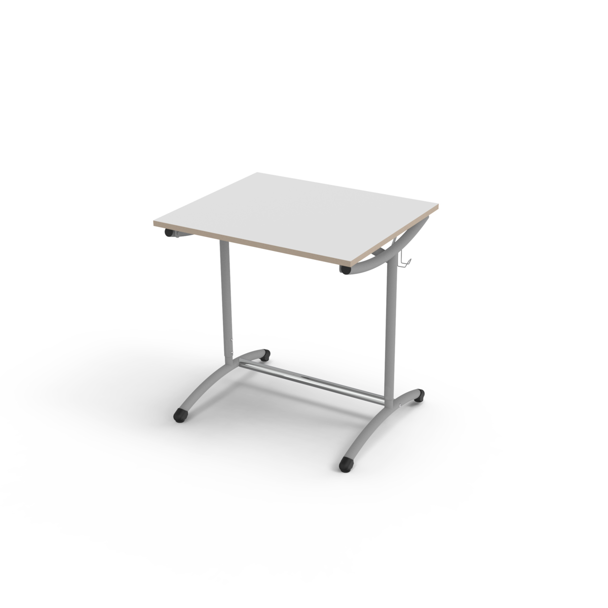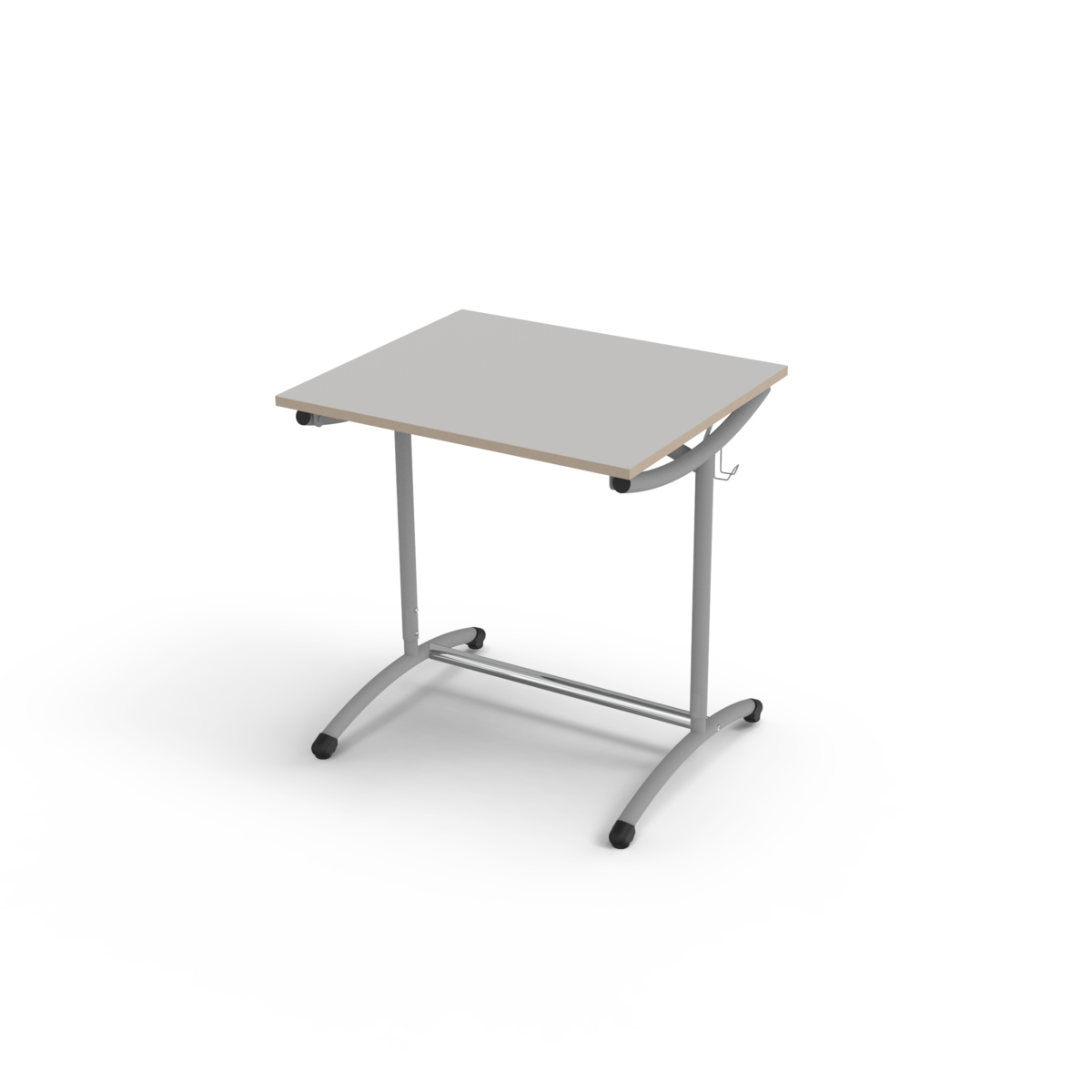 Ställskruvar på främre ben. Dubbla väskkrokar. Mått: L70xD60 cm. Arbetshöjden justerbar mellan 70 och 100 cm. Fast bordsskiva i högtryckslaminat. Stativ i silver, RAL 9006.