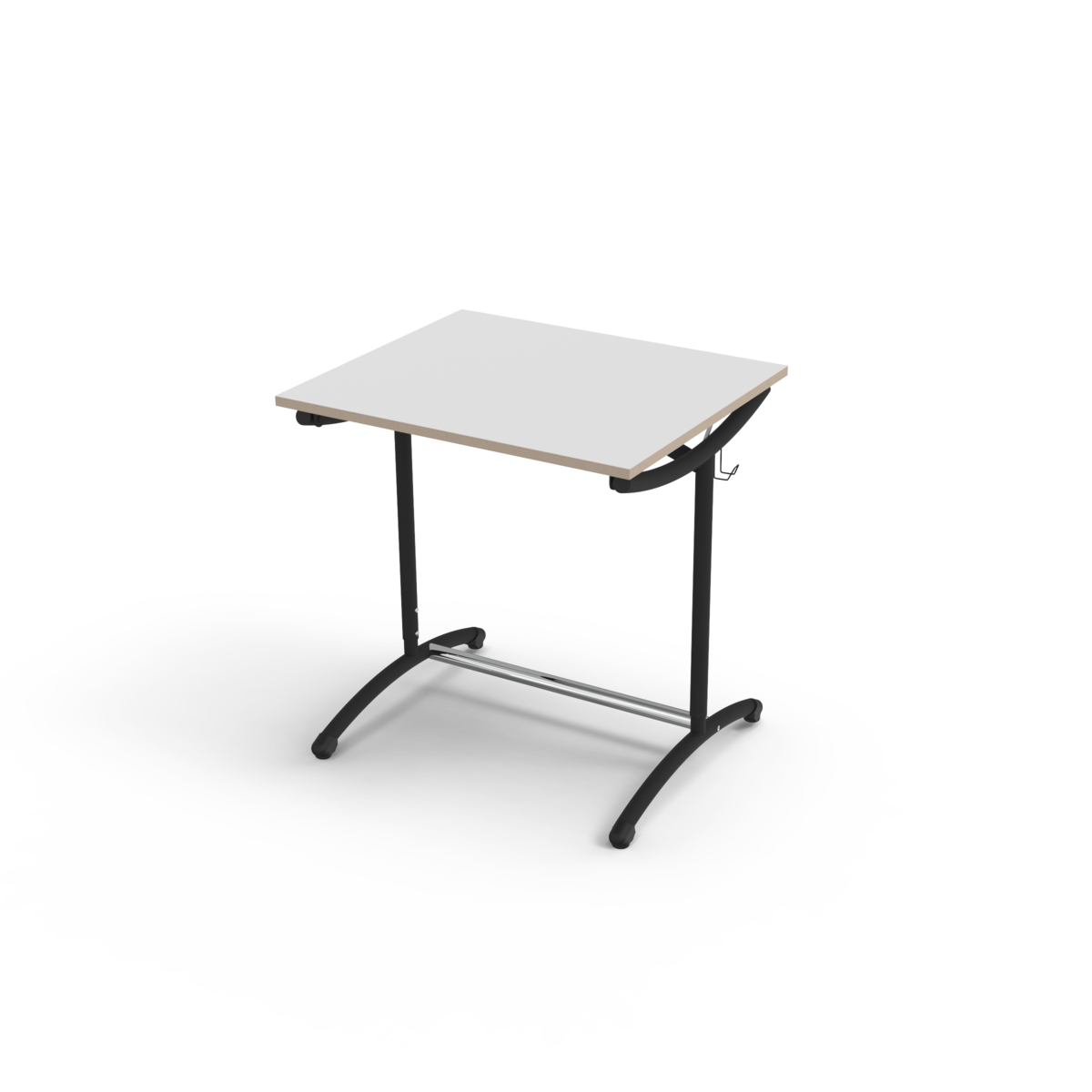 Skivan kan vinklas 8, 12 eller 16 grader. Ställskruvar på främre ben. Dubbla väskkrokar. Mått: L70xD60 cm. Arbetshöjden justerbar mellan 70 och 100 cm. Bordsskiva i högtryckslaminat. Stativ i svart, RAL 9005.