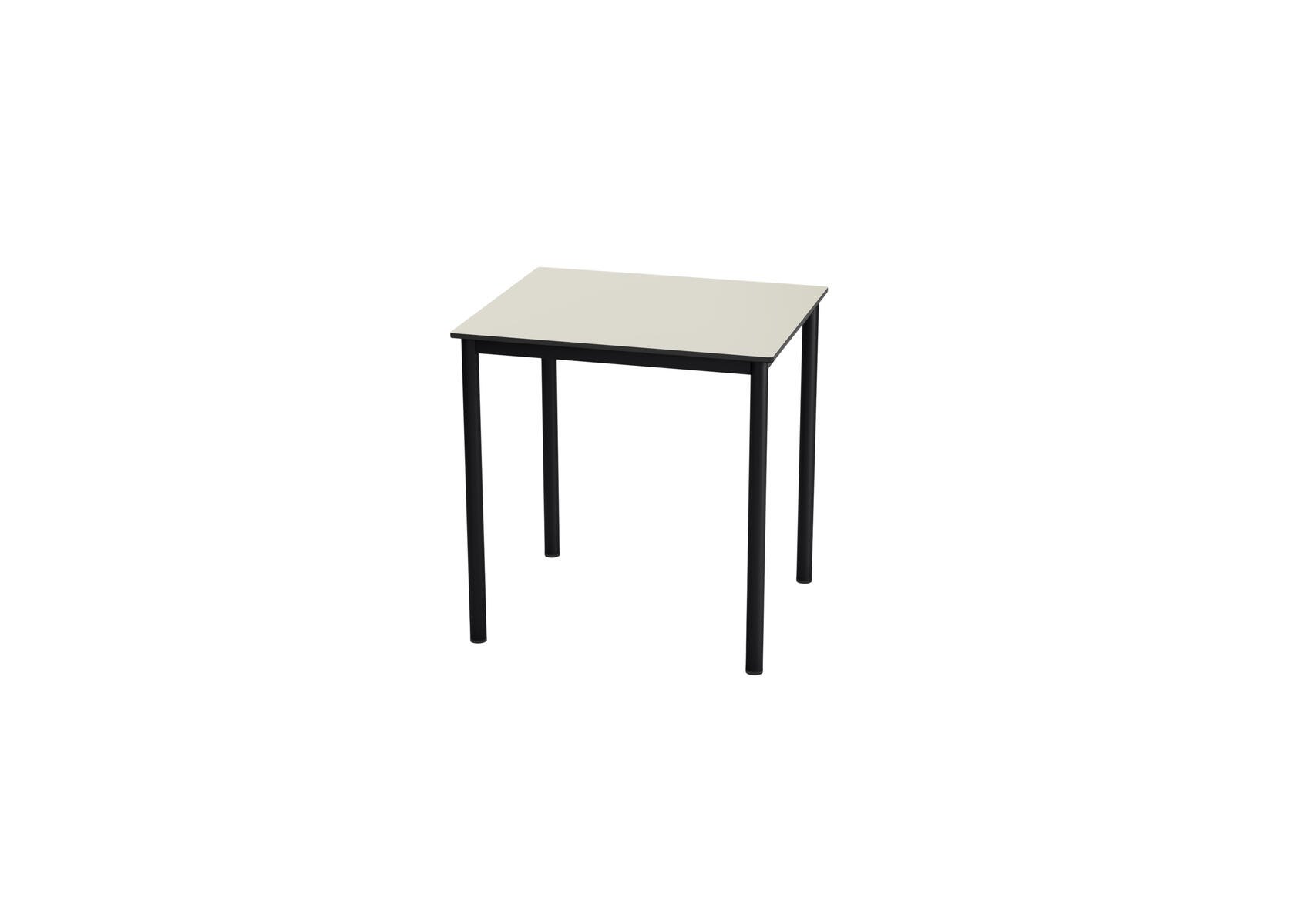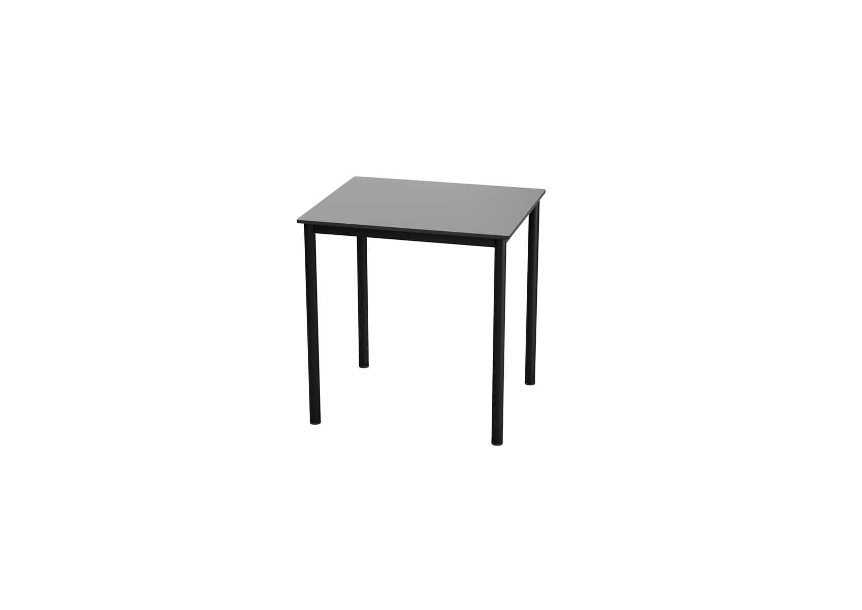 Skiva med högtryckslaminat. Bordets utformning gör det stapelbart utan att påverka möjligheten att sätta borden kloss i kloss. Fyra ställfötter. Helsvetsat stativ lackerat i RAL 9006. Det går att stapla max 6 bord.