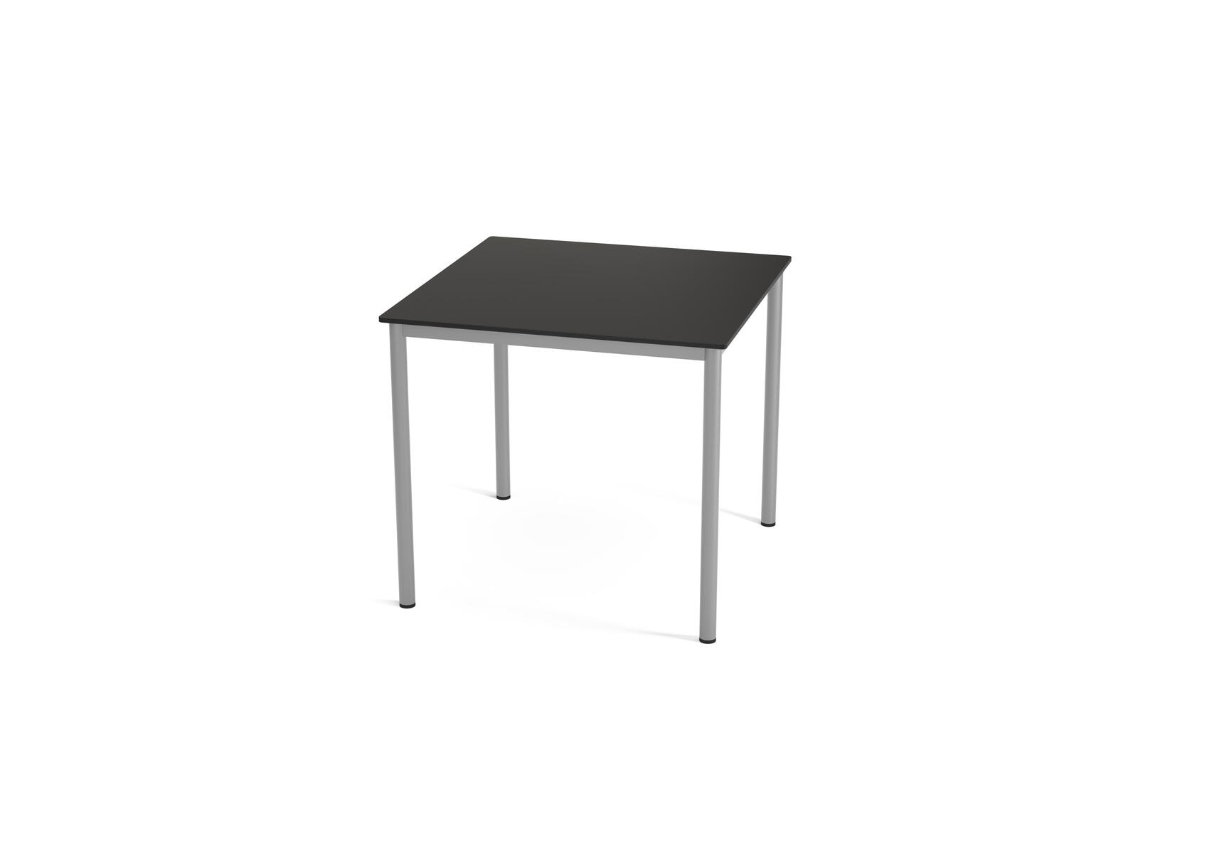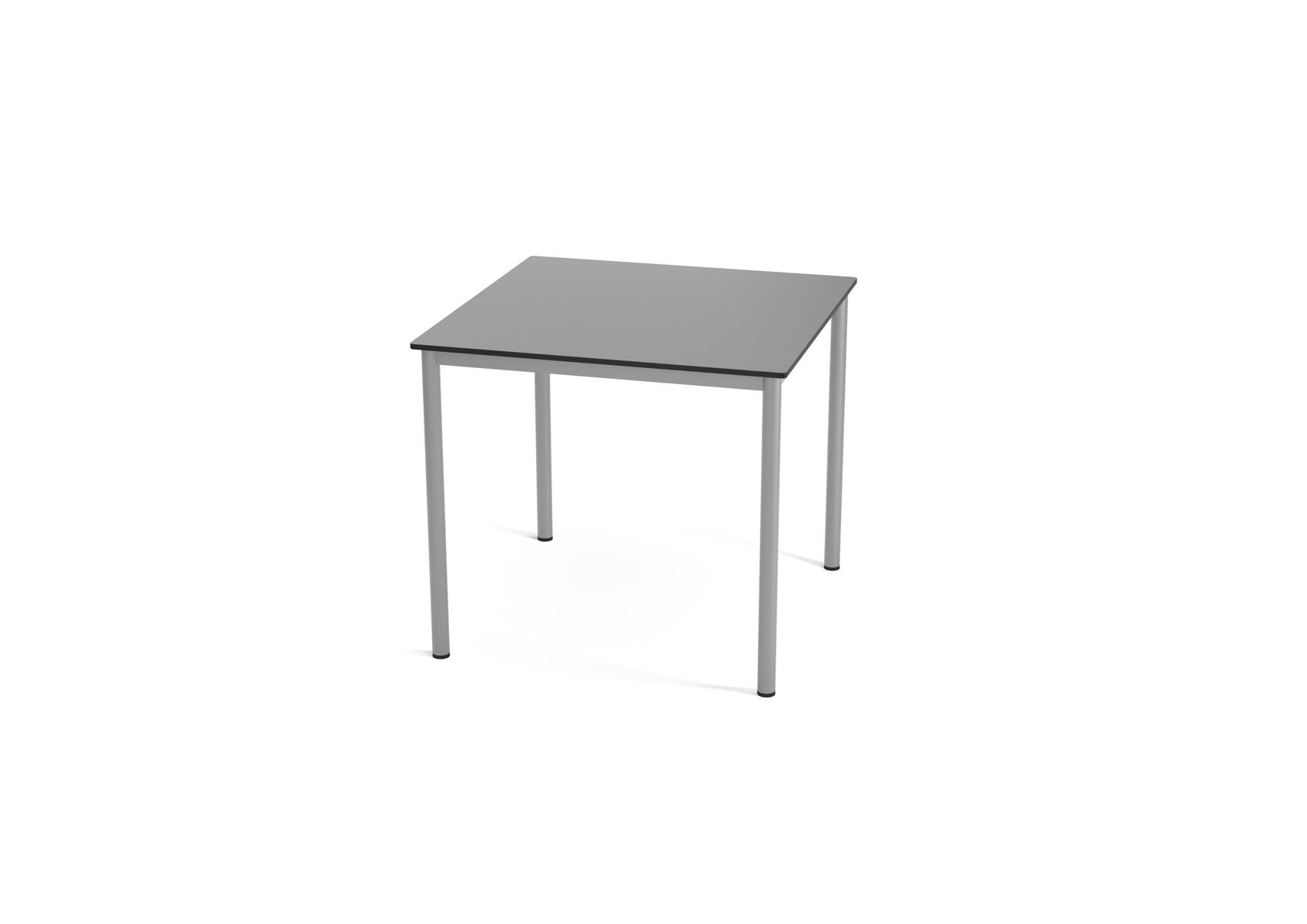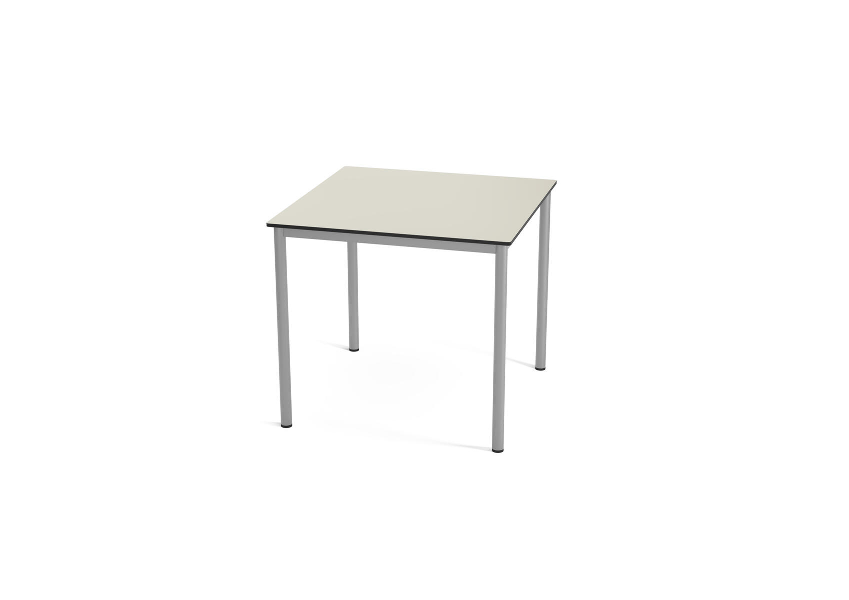 Skiva i kompaktlaminat. Helsvetsat stativ i RAL 9006. Levereras monterat. Välj antingen 2 ben med ställbar fot och 2 ben med hjul, eller alla ben med fast fot.