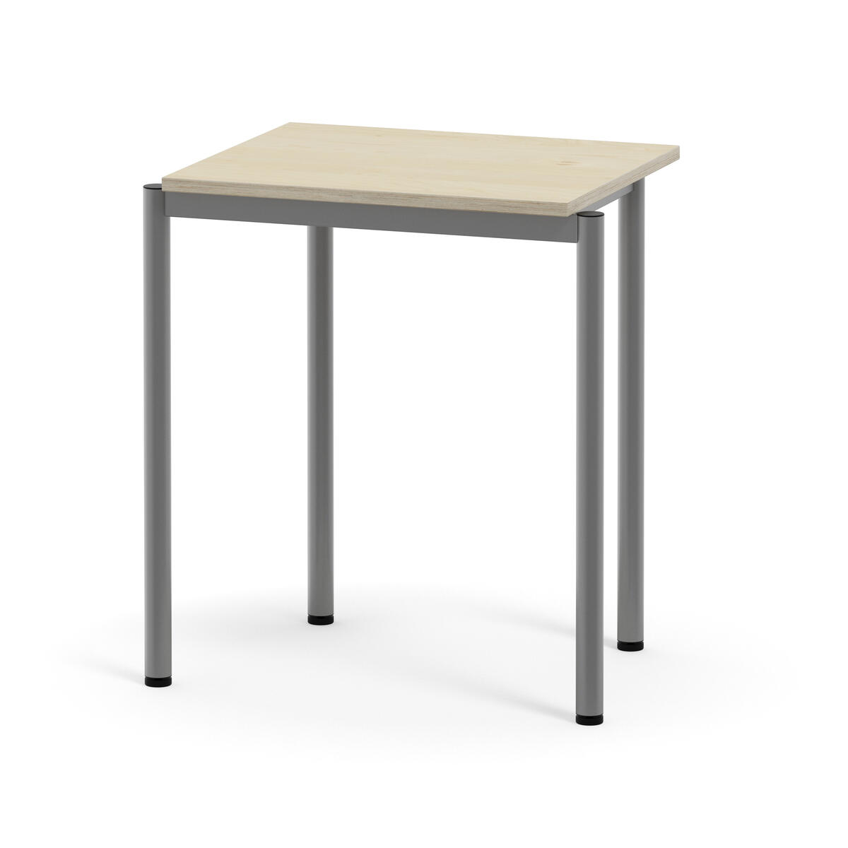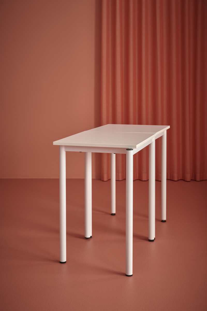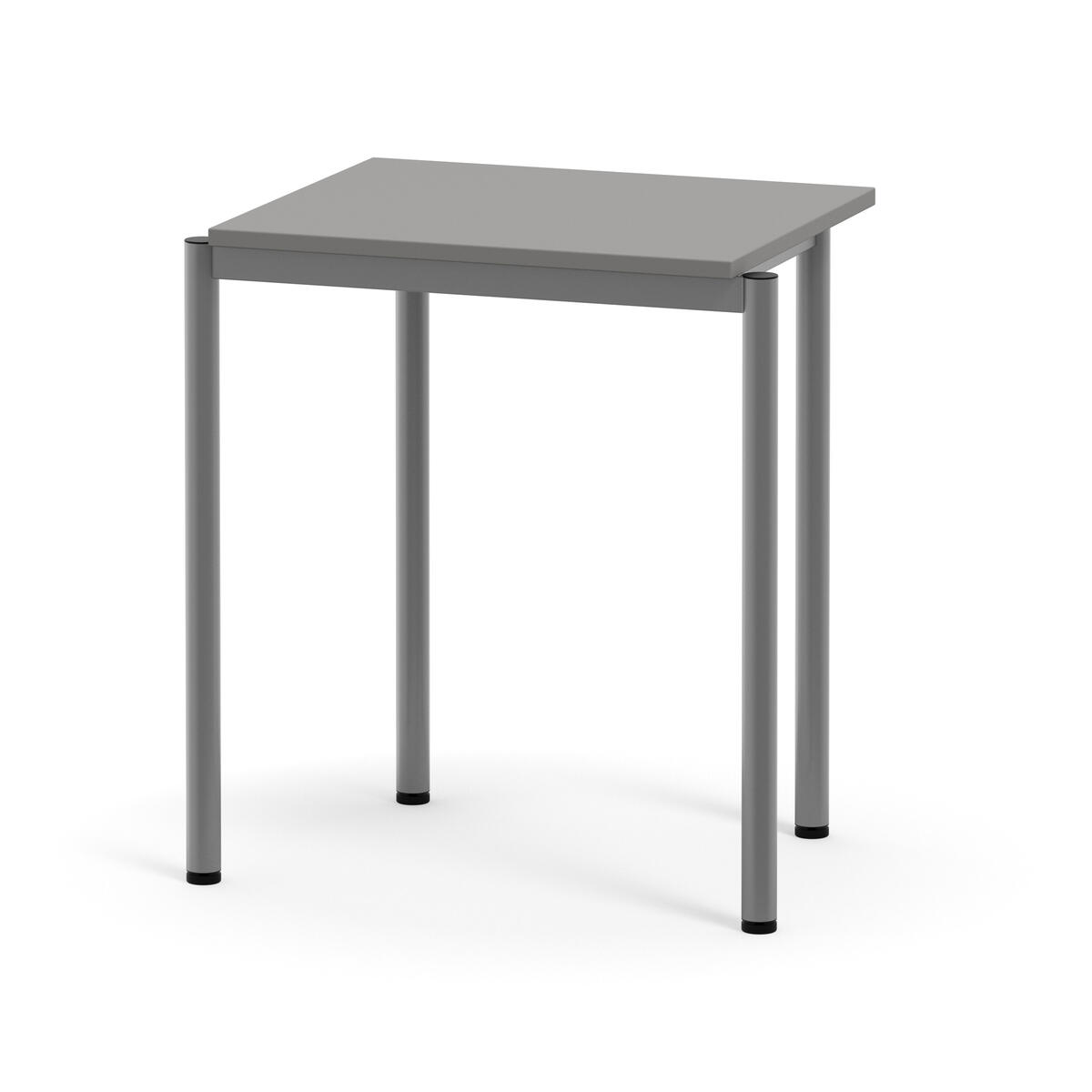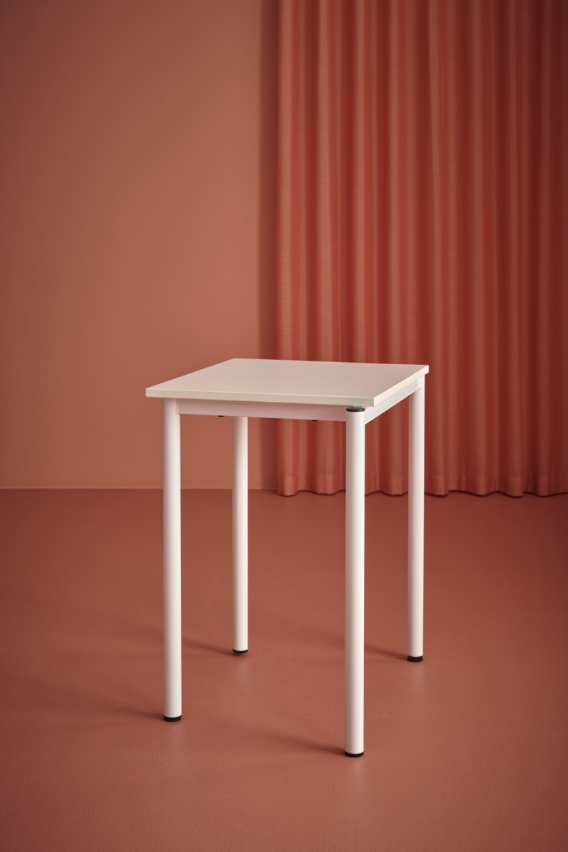 Skiva i plywood med högtryckslaminat. Helsvetsat stativ i RAL 9006. Välj antingen 2 ben med ställbar fot och 2 ben med hjul, eller alla ben med fast fot.