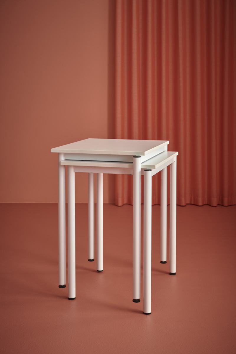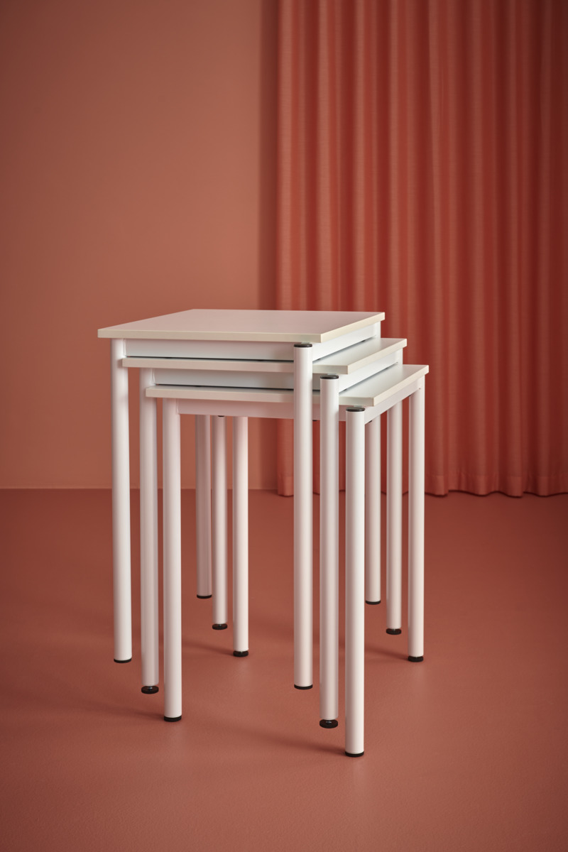 Skiva med högtryckslaminat. Bordets utformning gör det stapelbart utan att påverka möjligheten att sätta borden kloss i kloss. Fyra ställfötter. Helsvetsat stativ lackerat i RAL 9006. Det går att stapla max 6 bord.