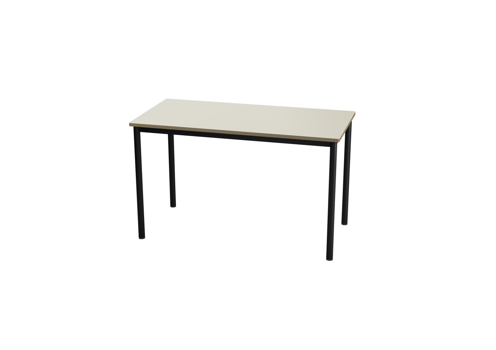 Skiva i plywood med högtryckslaminat. Helsvetsat stativ i RAL 9005. Välj antingen 2 ben med ställbar fot och 2 ben med hjul, eller alla ben med fast fot.