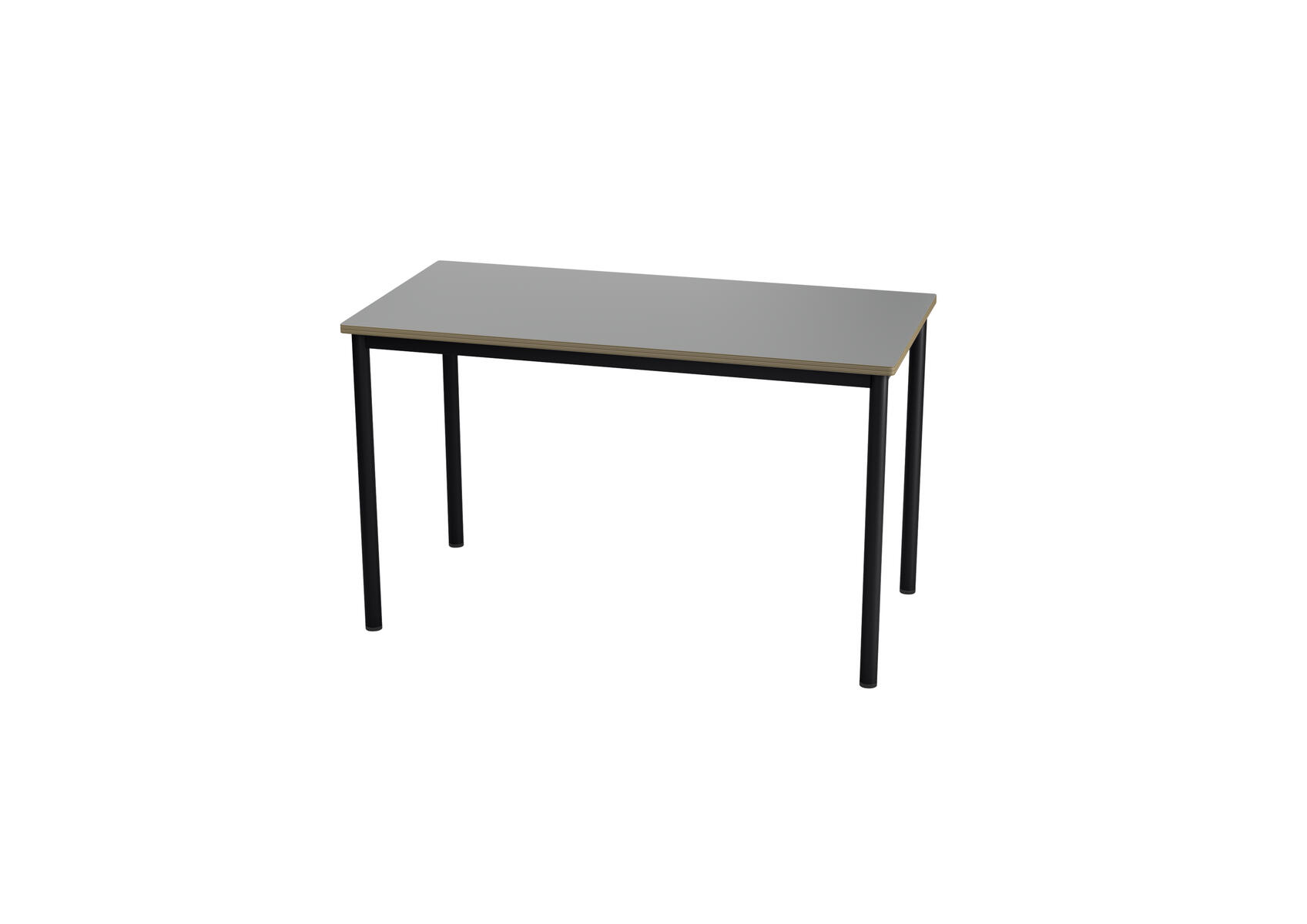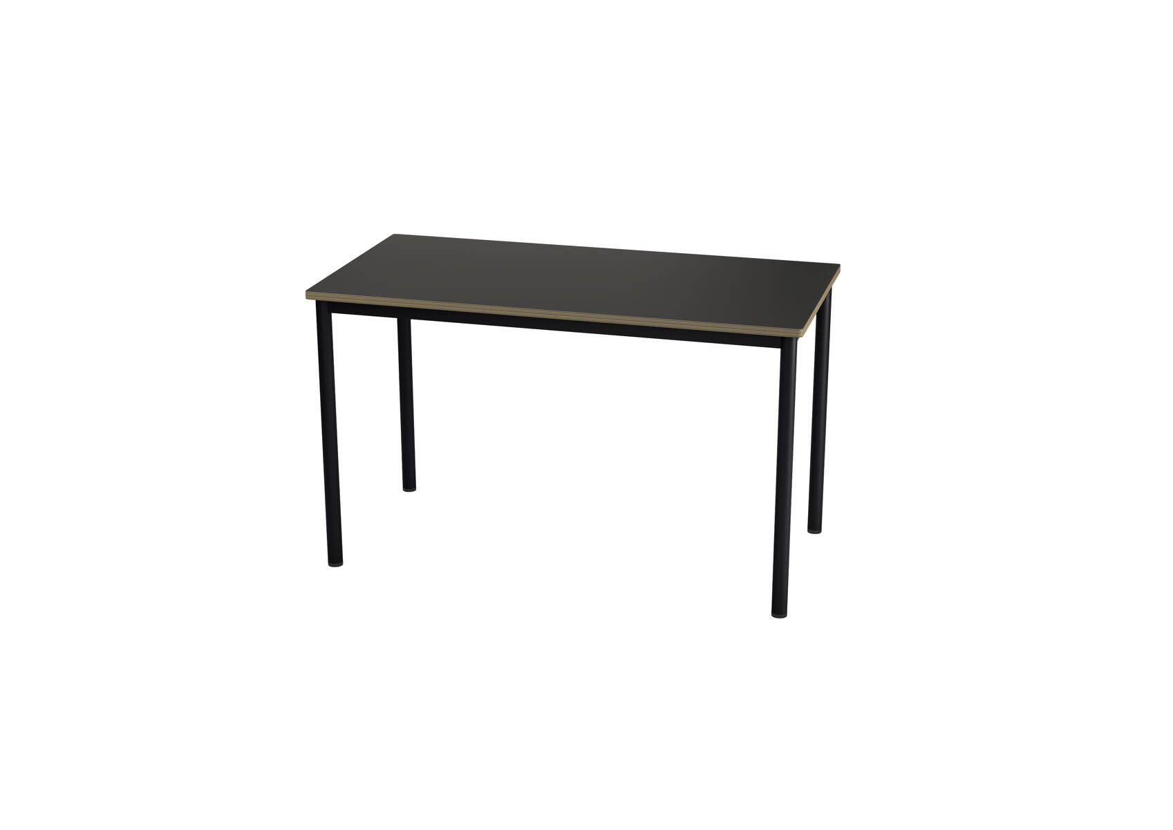 Skiva i plywood med högtryckslaminat. Helsvetsat stativ i RAL 9005. Välj antingen 2 ben med ställbar fot och 2 ben med hjul, eller alla ben med fast fot.