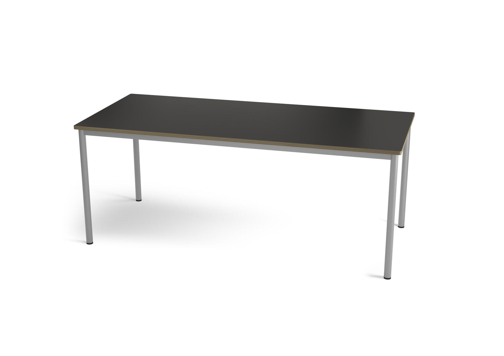 Skiva med högtryckslaminat. Bordets utformning gör det stapelbart utan att påverka möjligheten att sätta borden kloss i kloss. Fyra ställfötter. Helsvetsat stativ lackerat i RAL 9006. Det går att stapla max 6 bord.