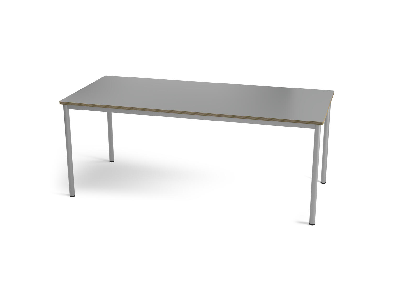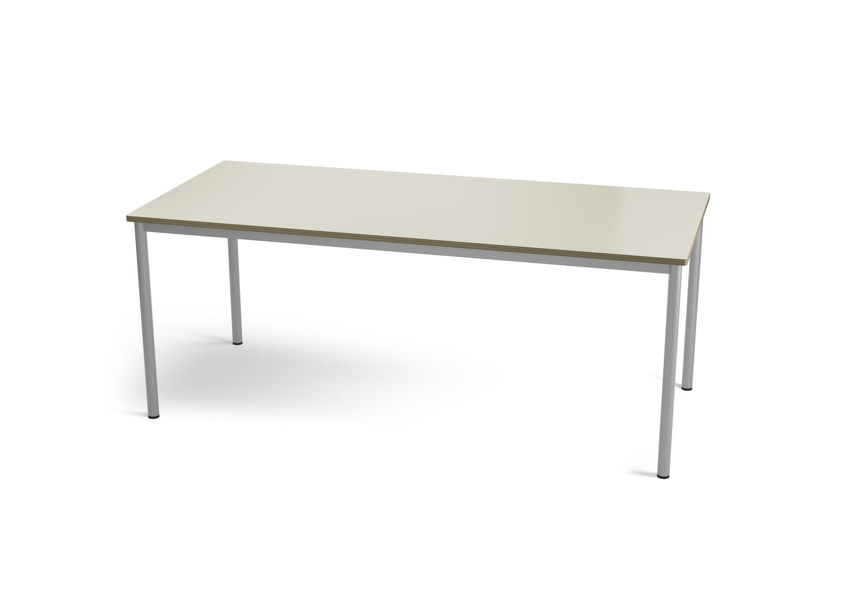 Skiva i plywood med högtryckslaminat. Helsvetsat stativ i RAL 9006. Välj antingen 2 ben med ställbar fot och 2 ben med hjul, eller alla ben med fast fot.