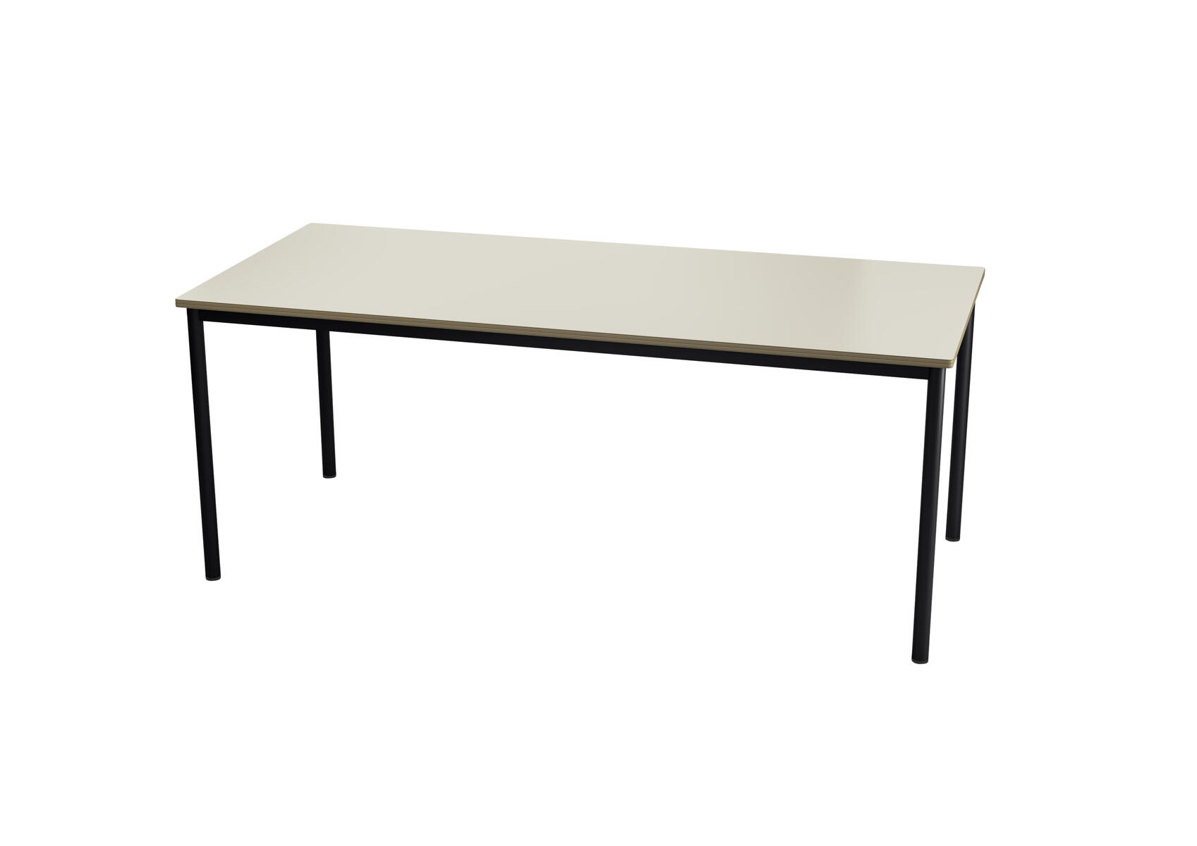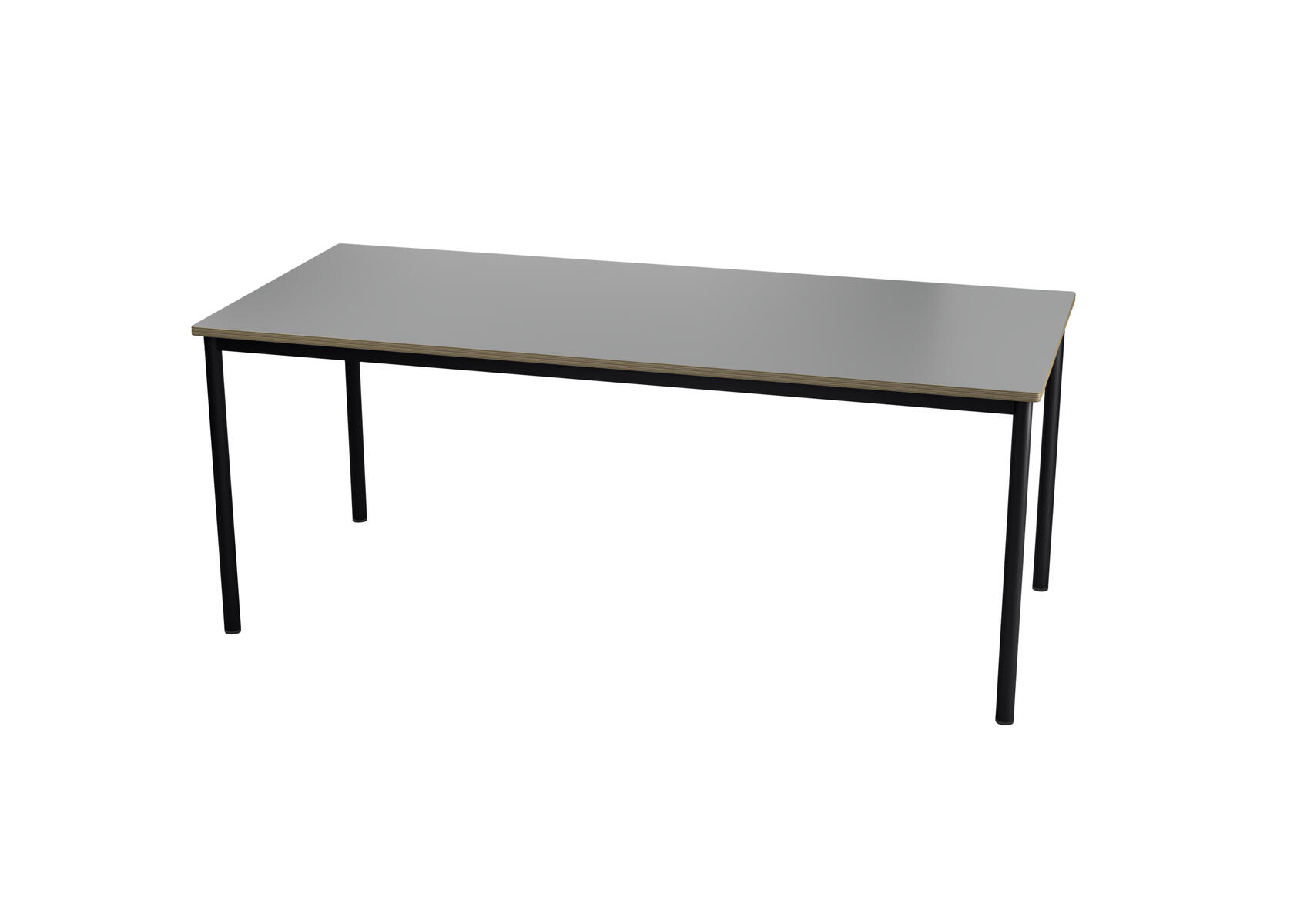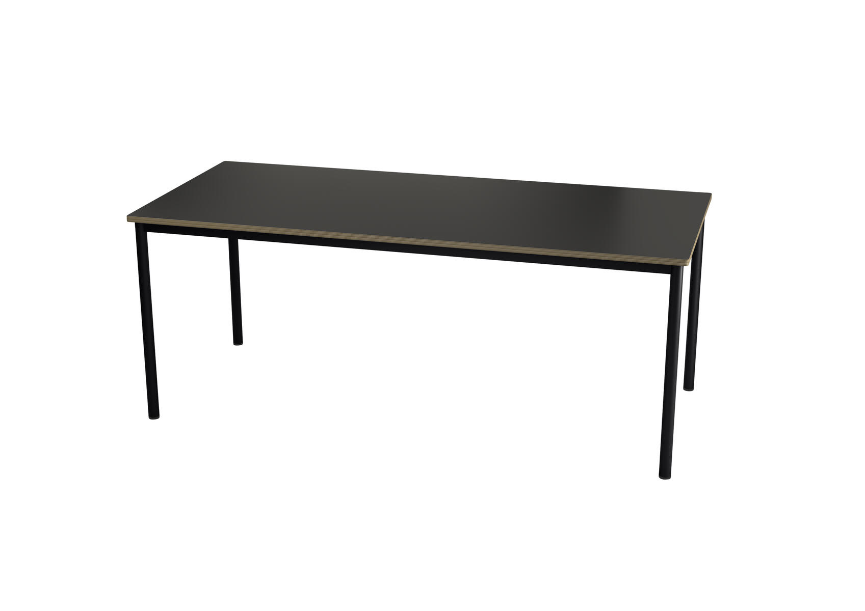 Skiva i plywood med högtryckslaminat. Helsvetsat stativ i RAL 9005. Välj antingen 2 ben med ställbar fot och 2 ben med hjul, eller alla ben med fast fot.