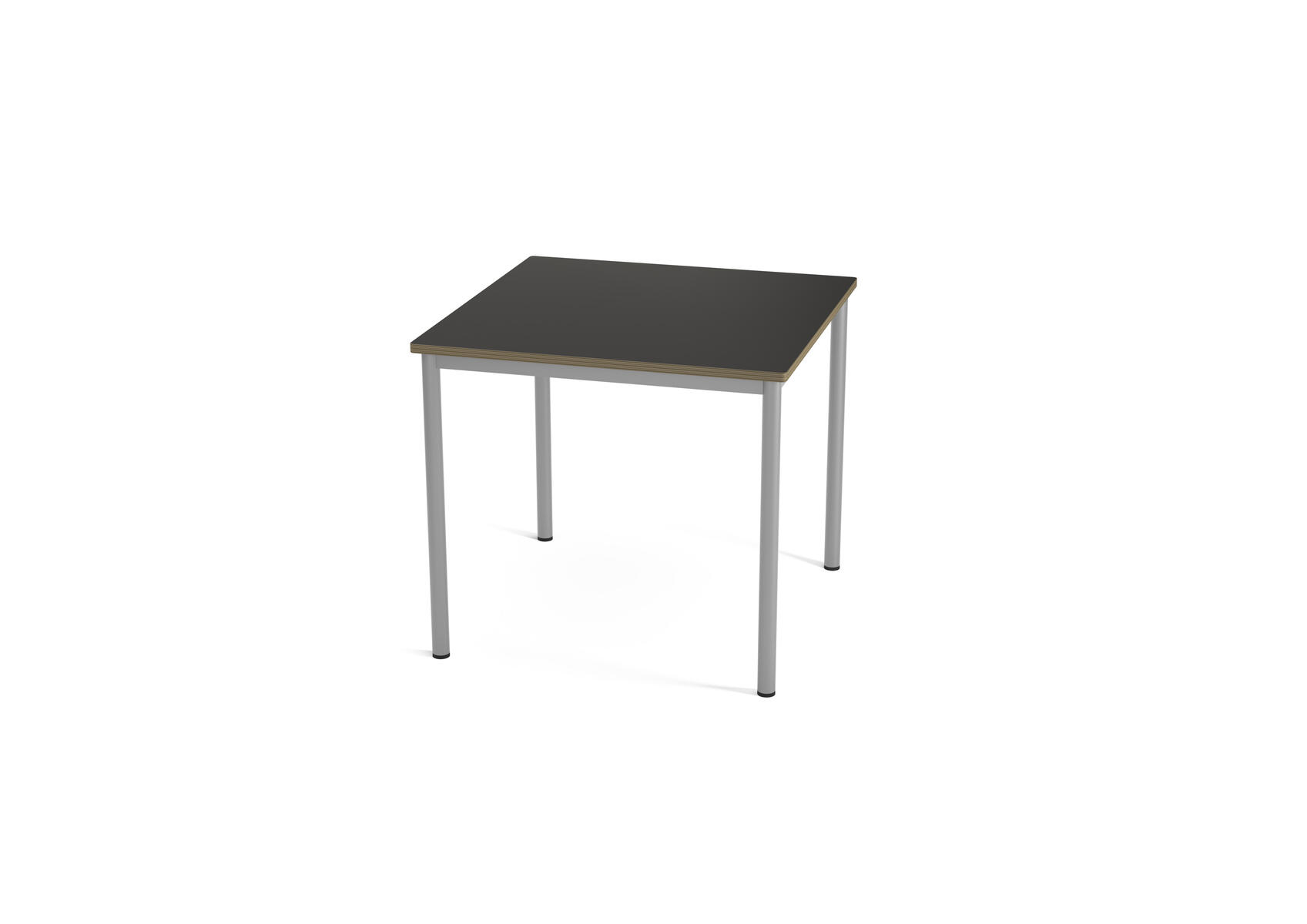 Skiva med högtryckslaminat. Bordets utformning gör det stapelbart utan att påverka möjligheten att sätta borden kloss i kloss. Fyra ställfötter. Helsvetsat stativ lackerat i RAL 9006. Det går att stapla max 6 bord.