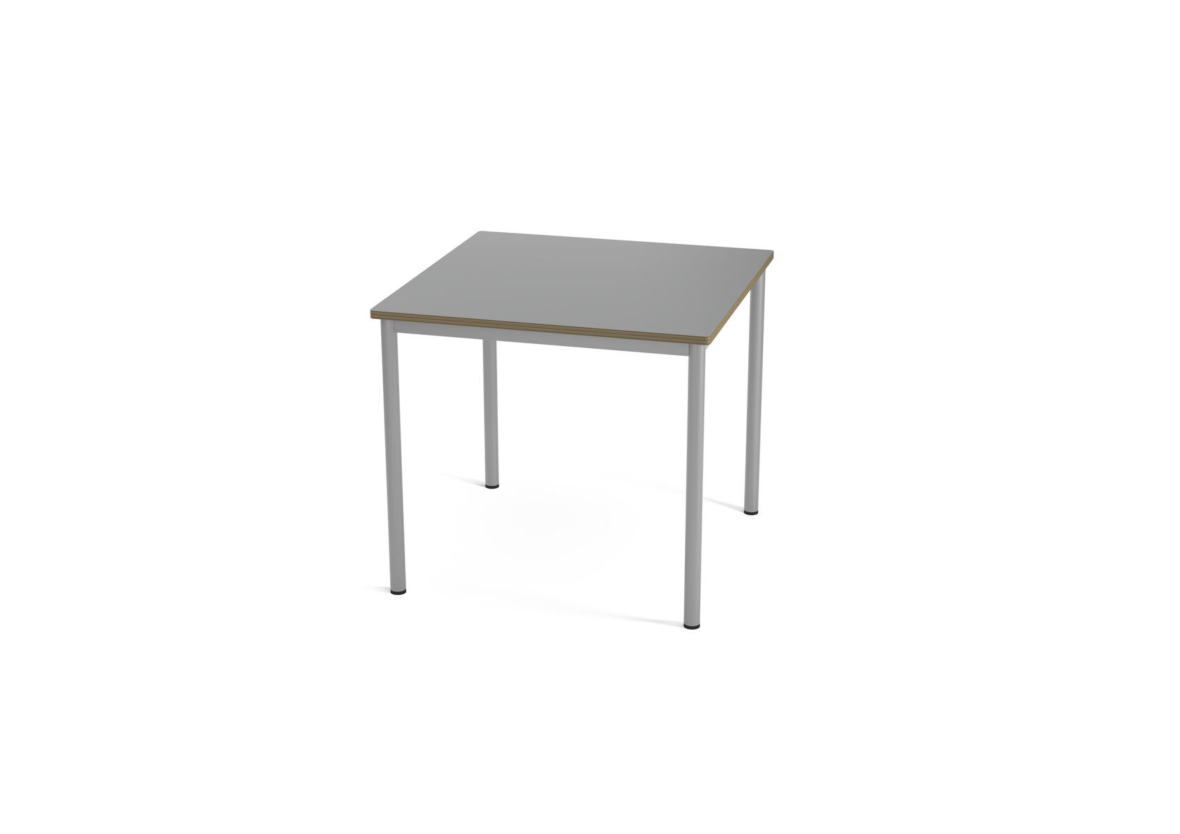 Skiva i plywood med högtryckslaminat. Helsvetsat stativ i RAL 9006. Välj antingen 2 ben med ställbar fot och 2 ben med hjul, eller alla ben med fast fot.