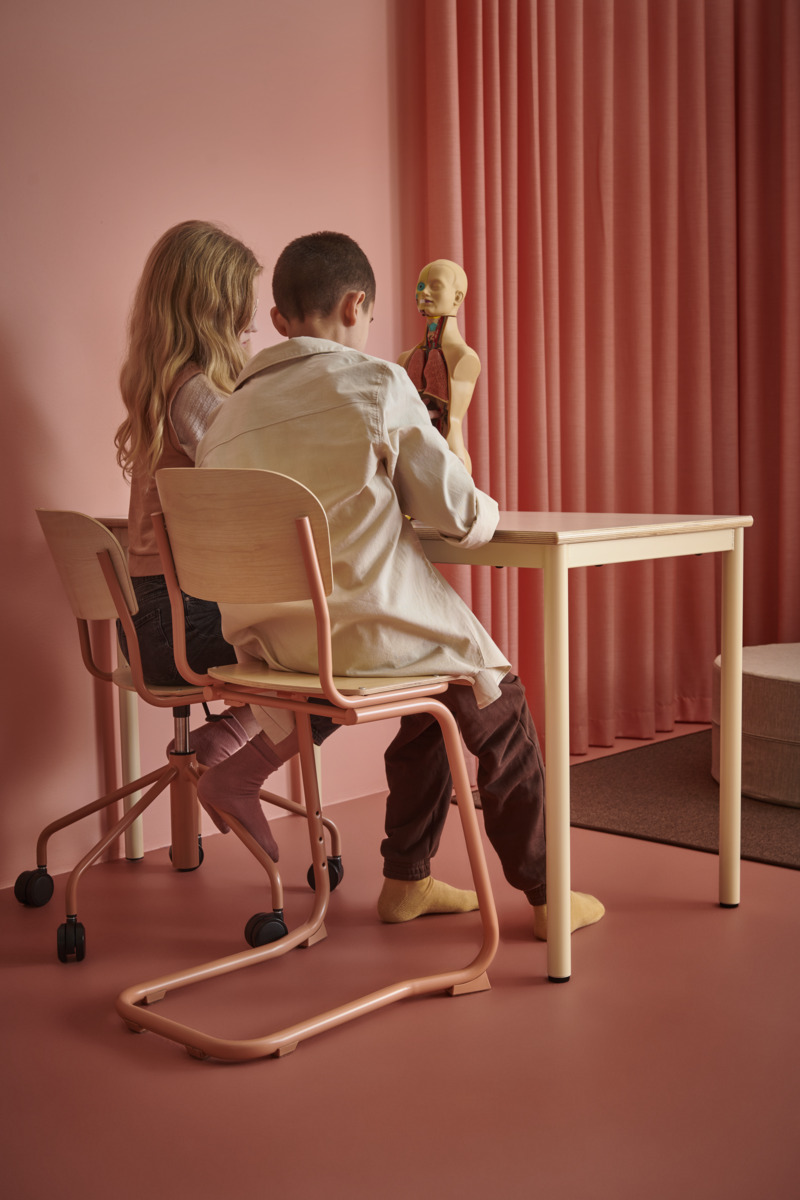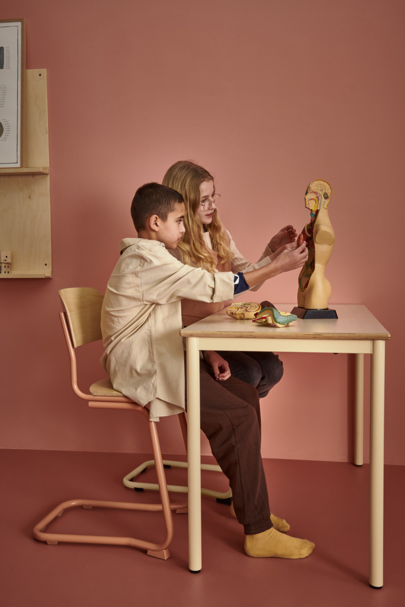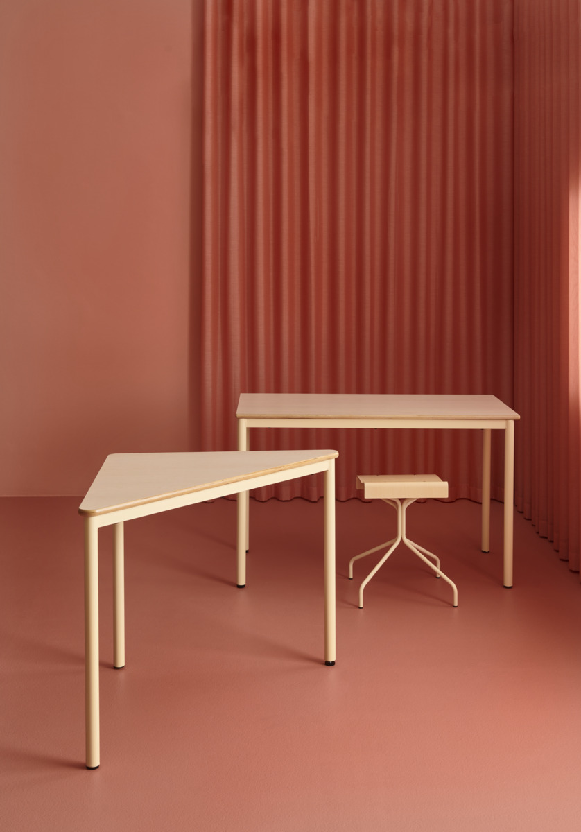 Skiva i plywood med högtryckslaminat. Helsvetsat stativ i RAL 9006. Välj antingen 2 ben med ställbar fot och 2 ben med hjul, eller alla ben med fast fot.