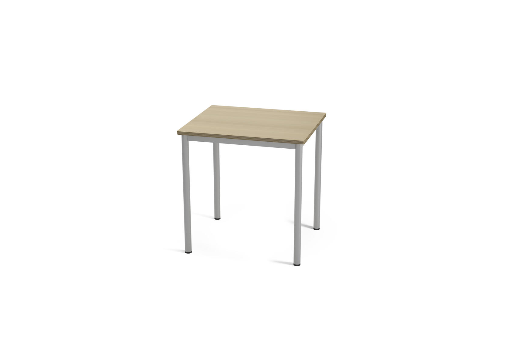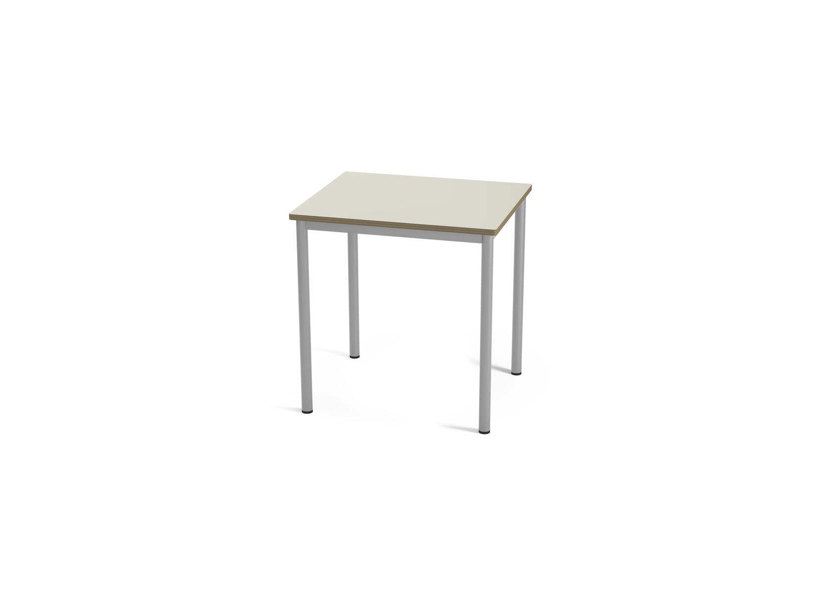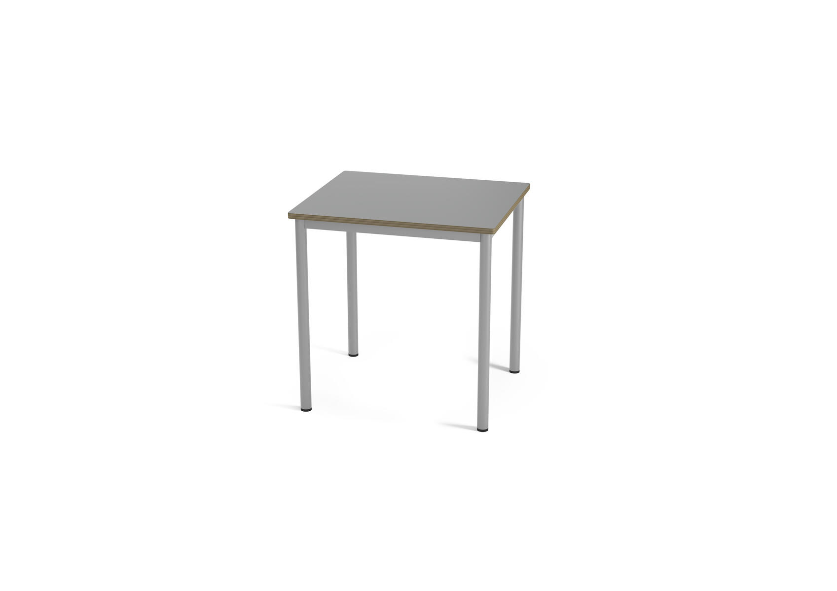 Skiva i plywood med högtryckslaminat. Helsvetsat stativ i RAL 9006. Välj antingen 2 ben med ställbar fot och 2 ben med hjul, eller alla ben med fast fot.