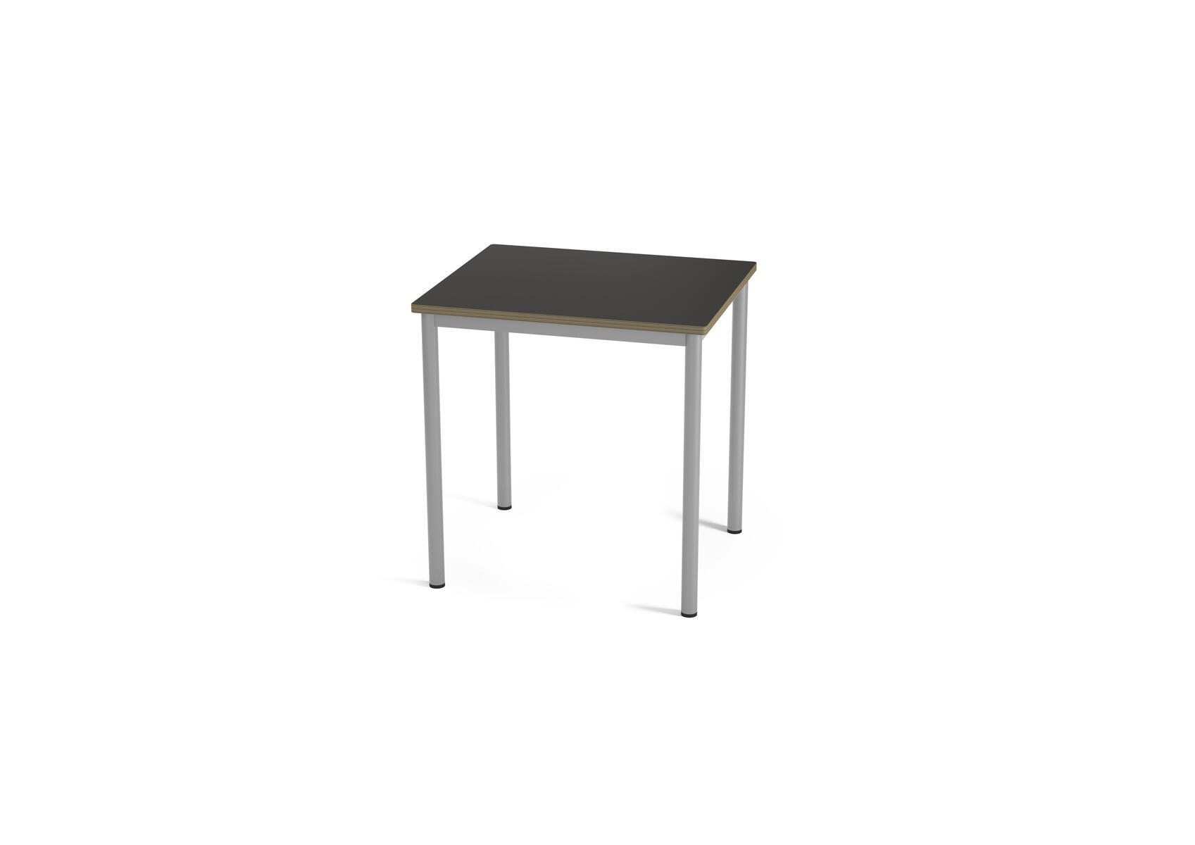 Skiva med högtryckslaminat. Bordets utformning gör det stapelbart utan att påverka möjligheten att sätta borden kloss i kloss. Fyra ställfötter. Helsvetsat stativ lackerat i RAL 9006. Det går att stapla max 6 bord.
