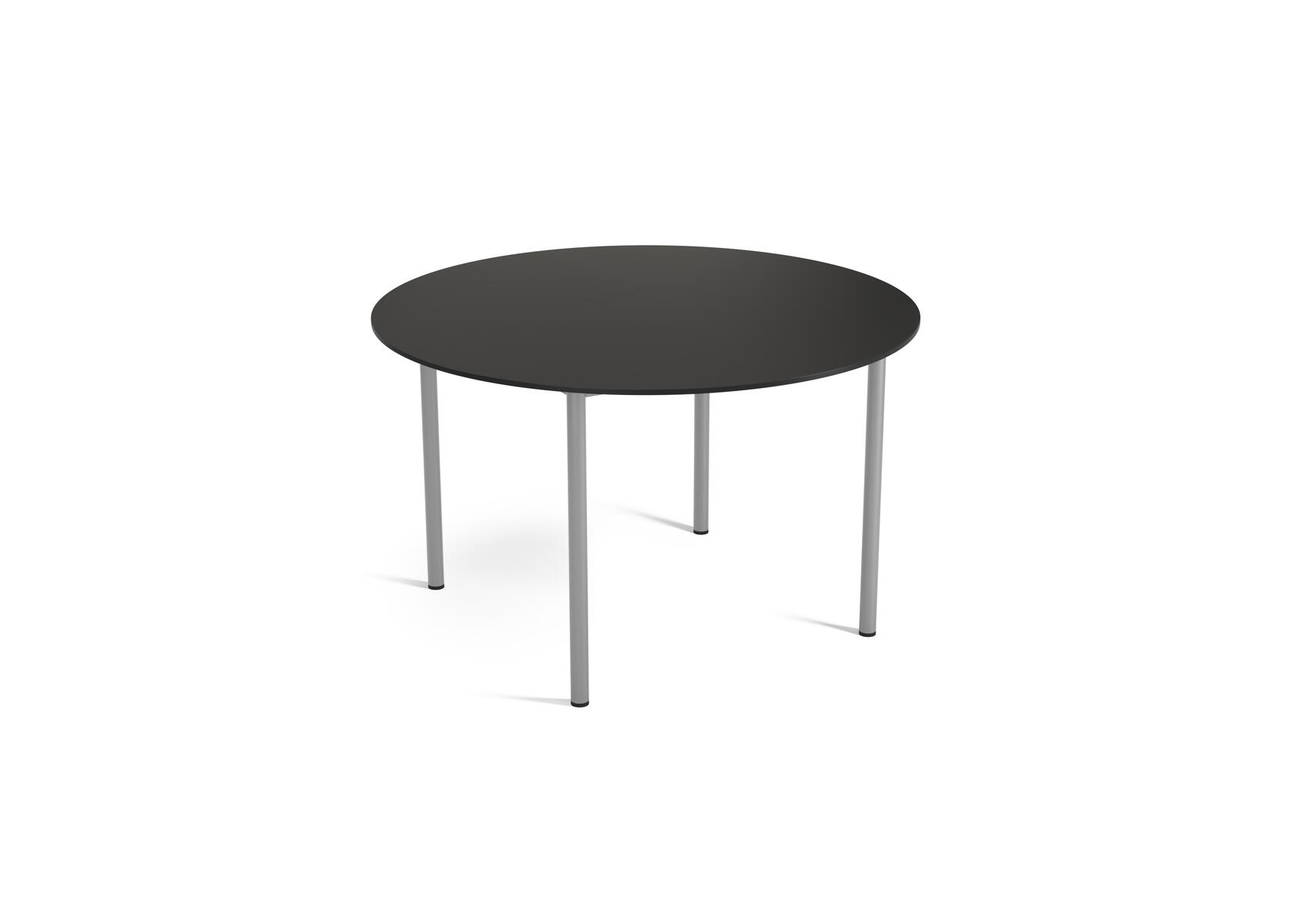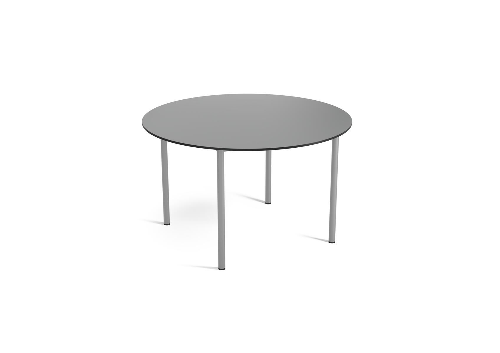 Skiva med högtryckslaminat. Bordets utformning gör det stapelbart utan att påverka möjligheten att sätta borden kloss i kloss. Fyra ställfötter. Helsvetsat stativ lackerat i RAL 9006. Det går att stapla max 6 bord.