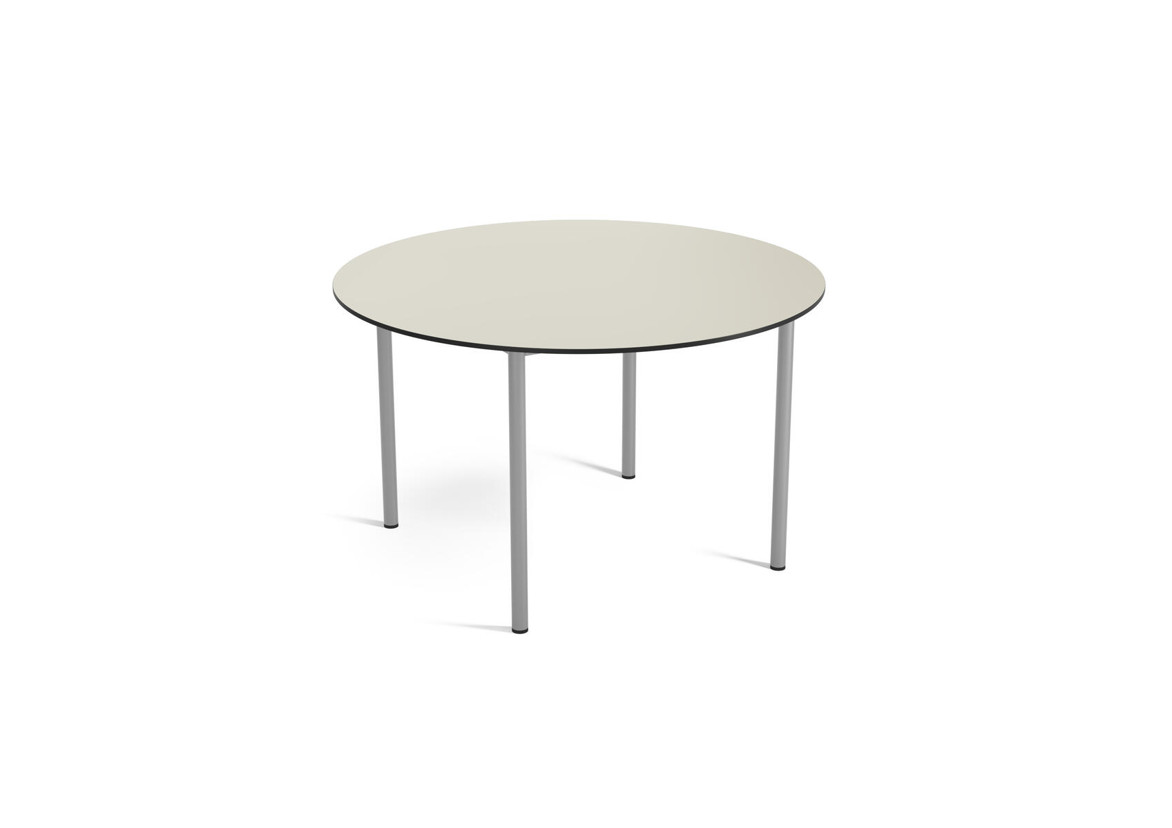 Skiva i plywood med högtryckslaminat. Helsvetsat stativ i RAL 9006. Välj antingen 2 ben med ställbar fot och 2 ben med hjul, eller alla ben med fast fot.