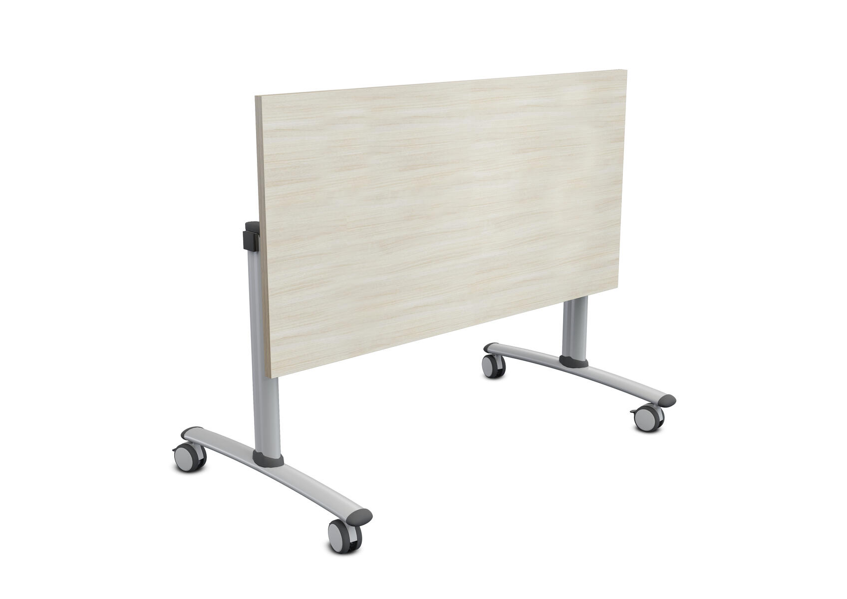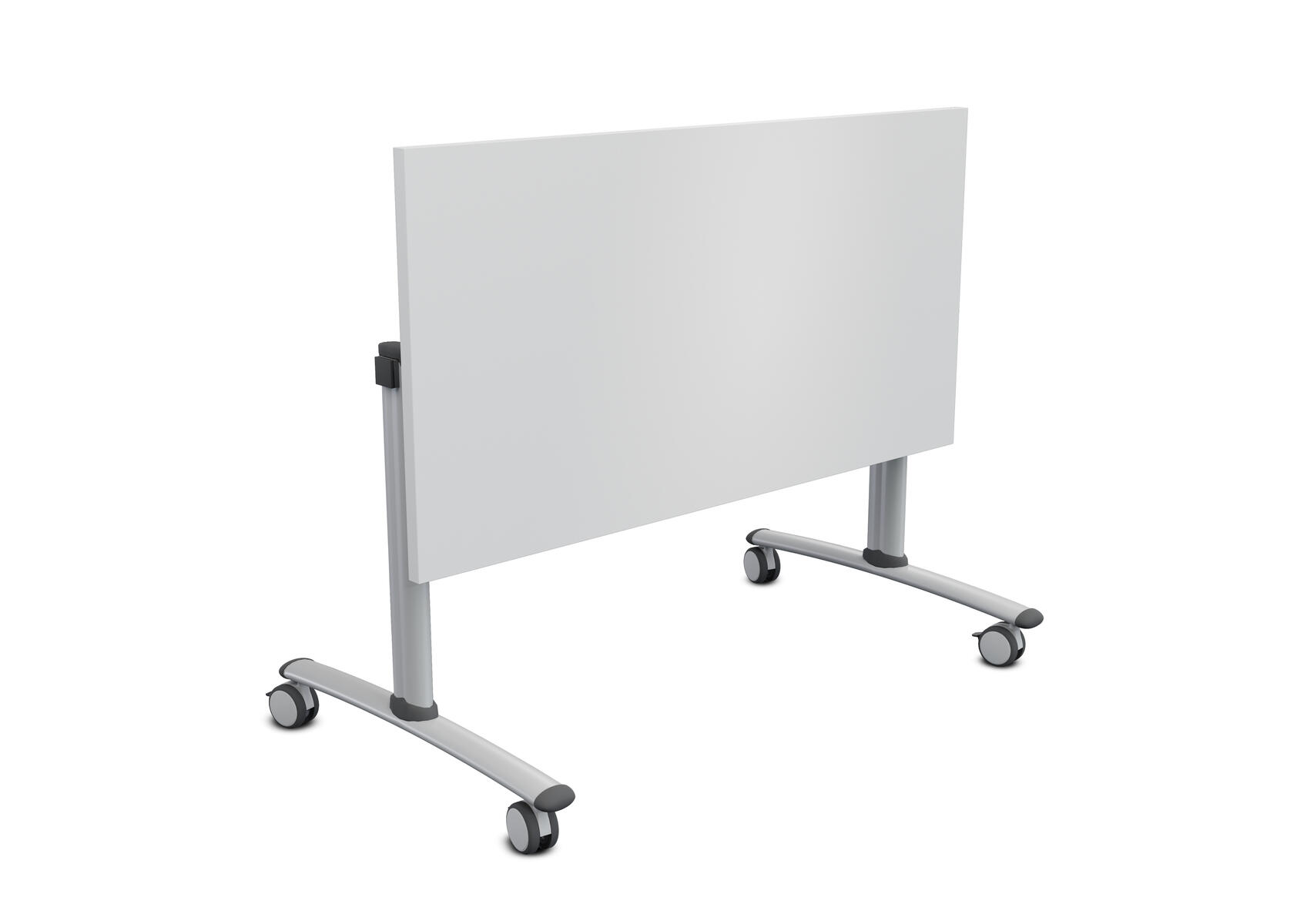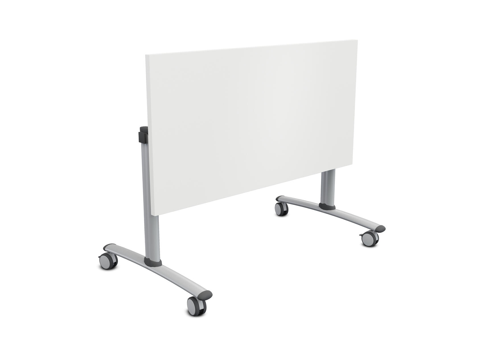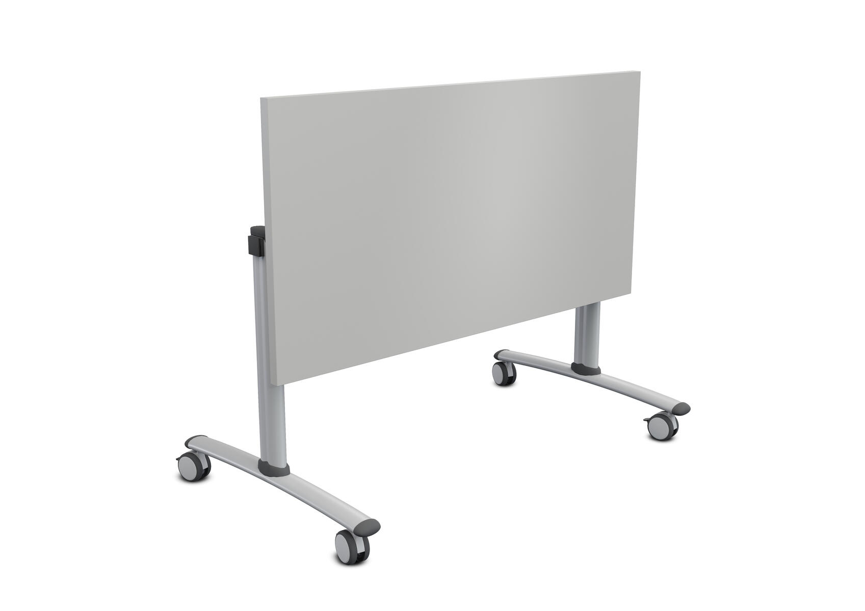 Bord med fällbar skiva som enkelt går att fälla upp eller ned genom att dra i två handtag på undersidan av bordsskivan. Skiva i akustiklaminat. Höjd 72 cm. Silverlackerat stativ i RAL 9006 med fyra låsbara hjul.