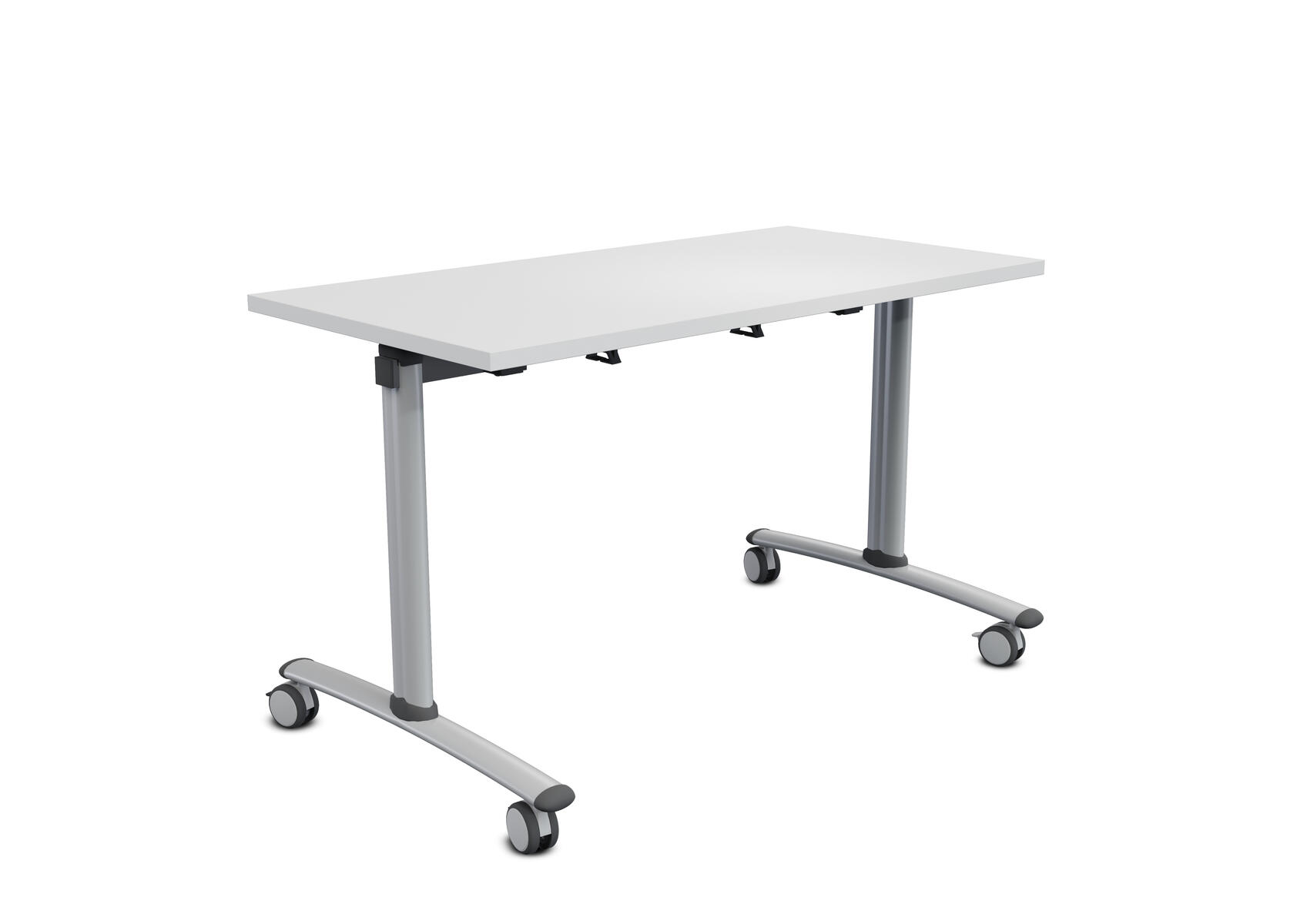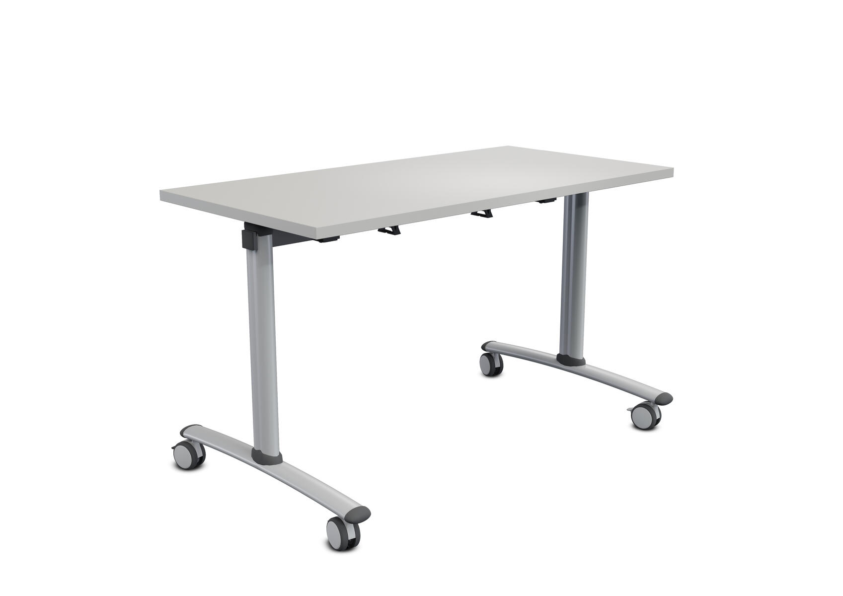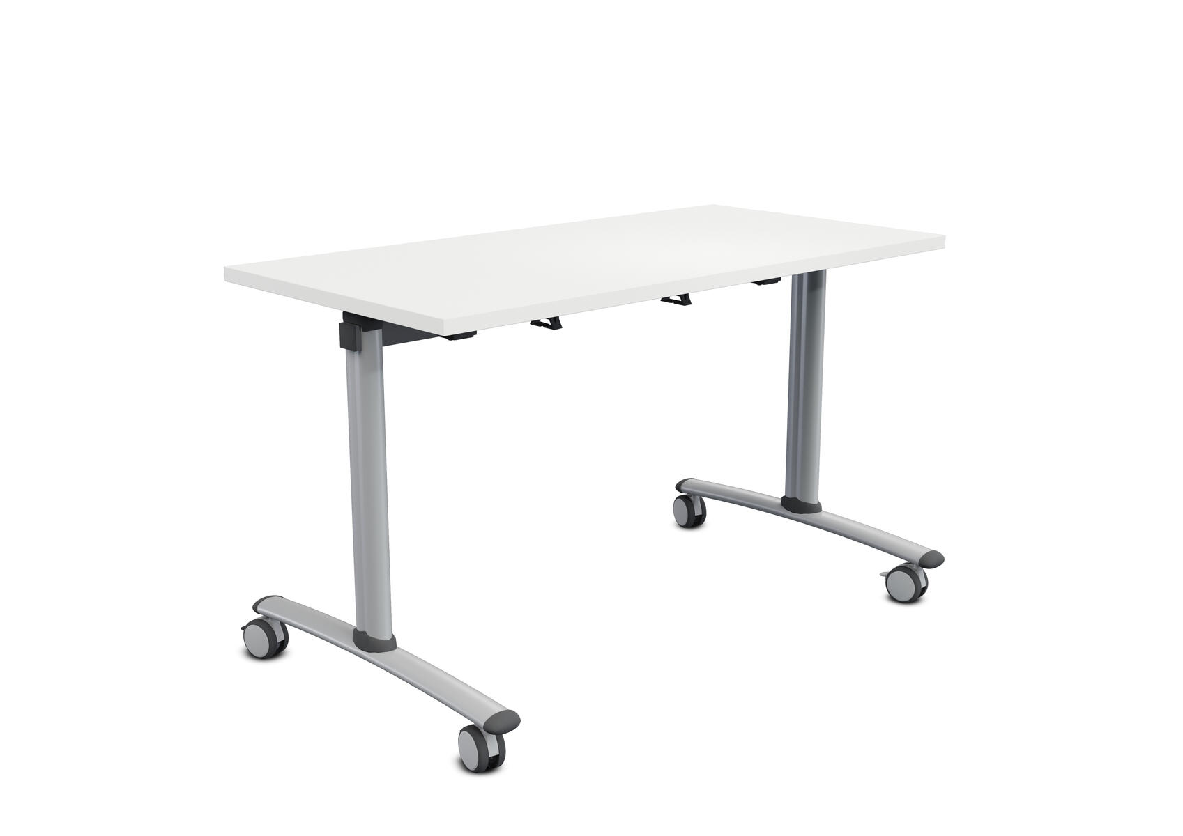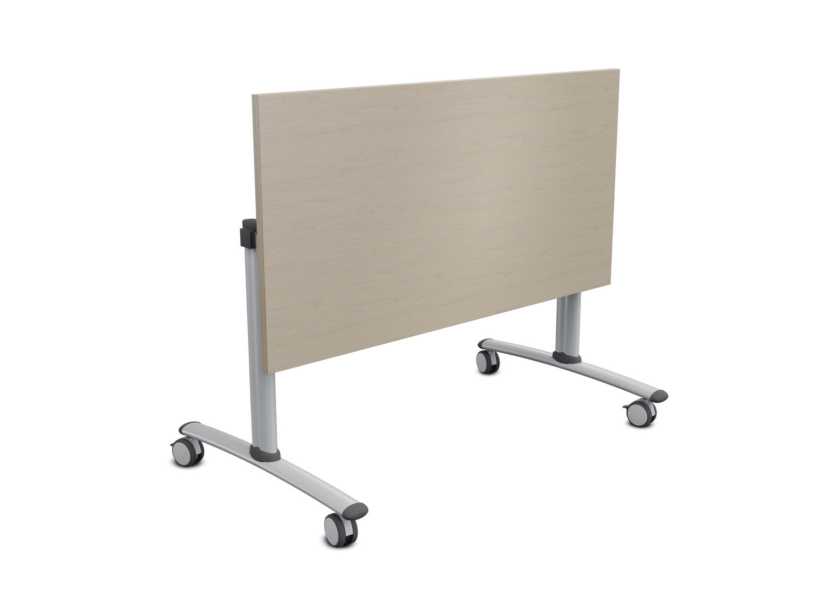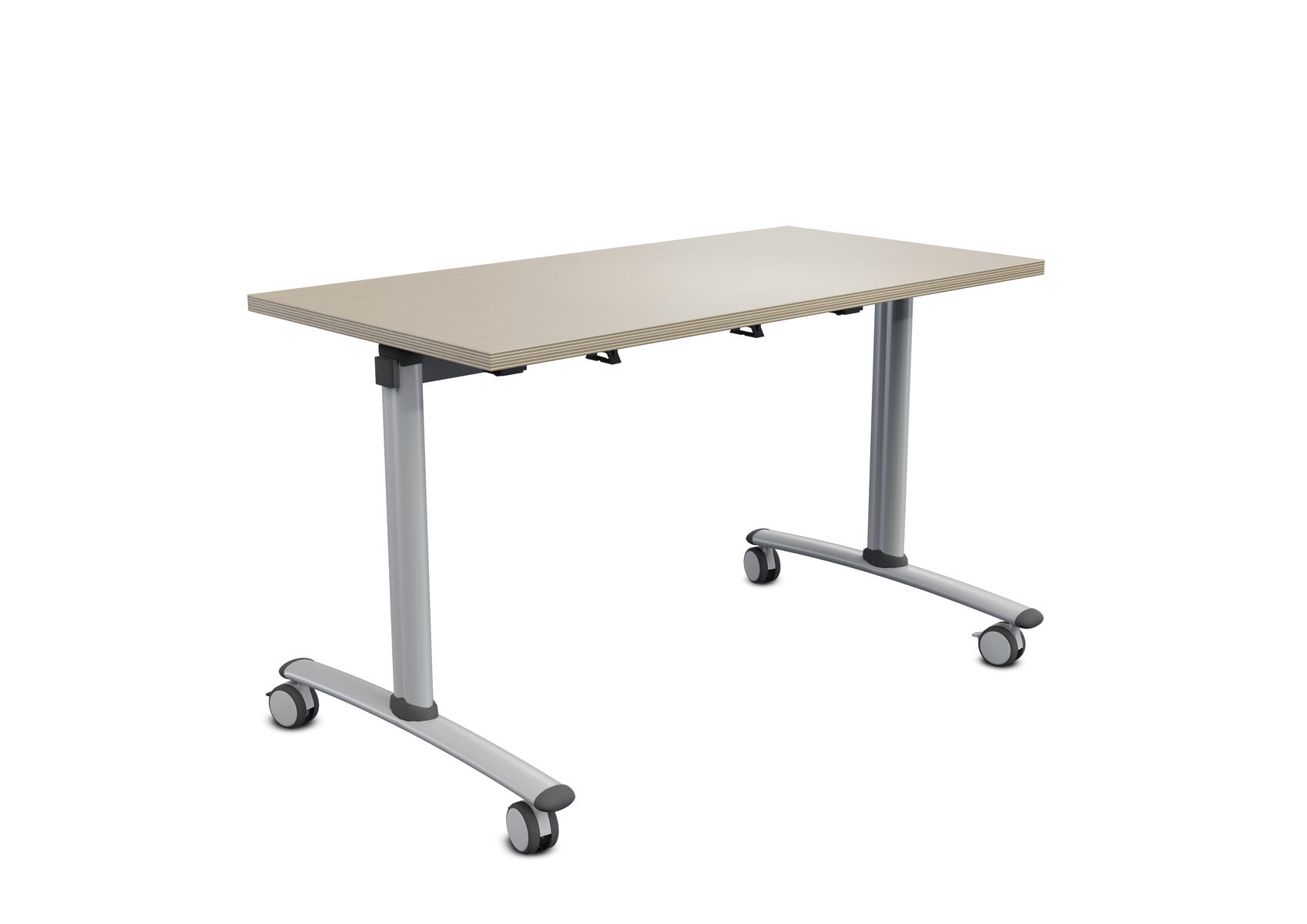 Bord med fällbar skiva som enkelt går att fälla upp eller ned genom att dra i två handtag på undersidan av bordsskivan. Skiva i akustiklaminat. Höjd 72 cm. Silverlackerat stativ i RAL 9006 med fyra låsbara hjul.