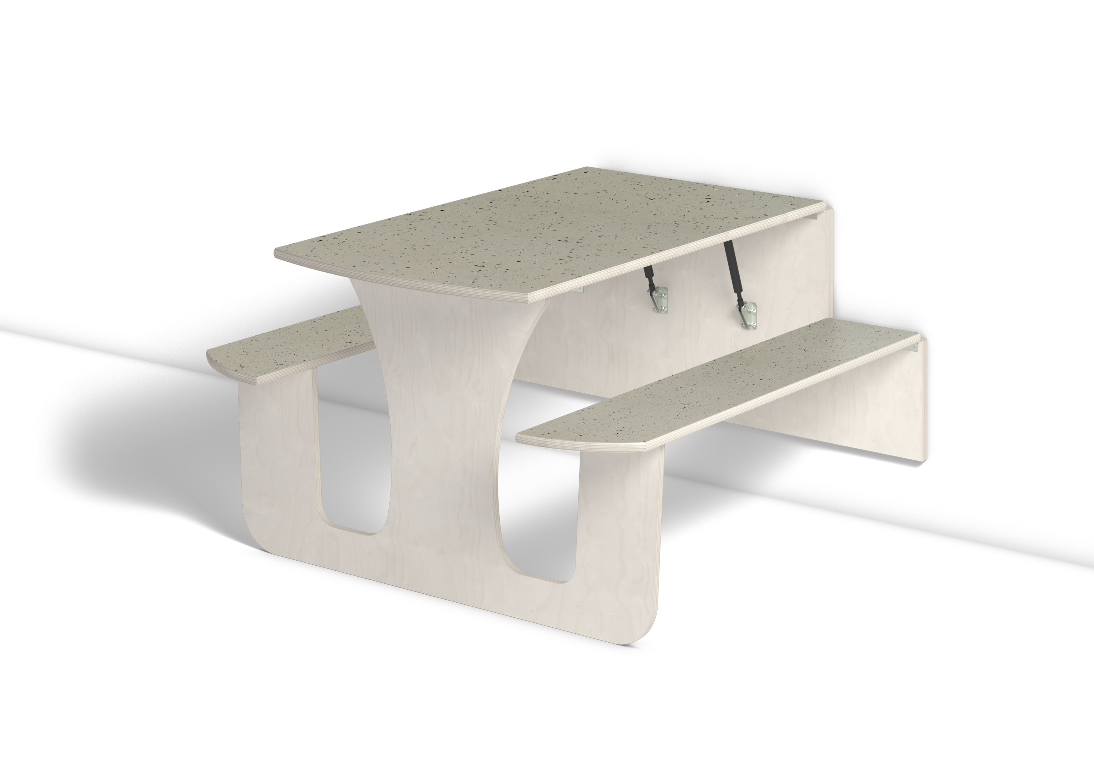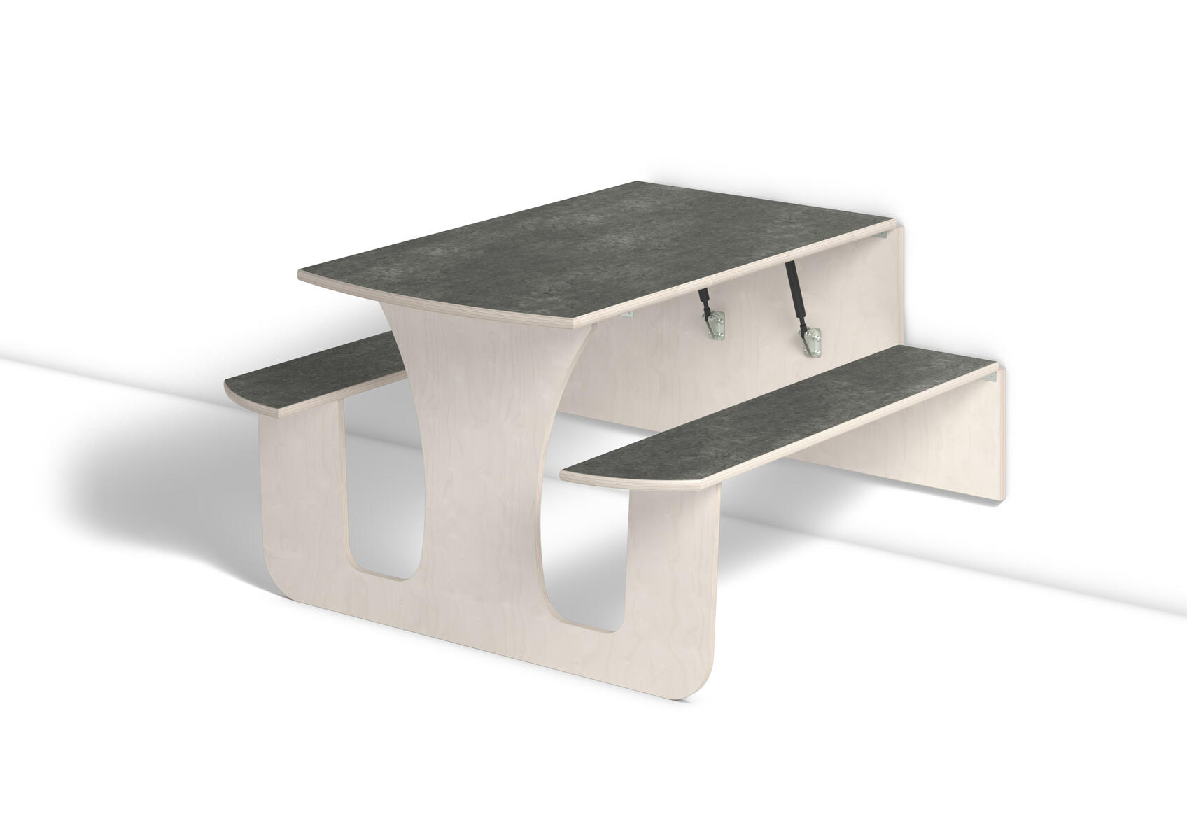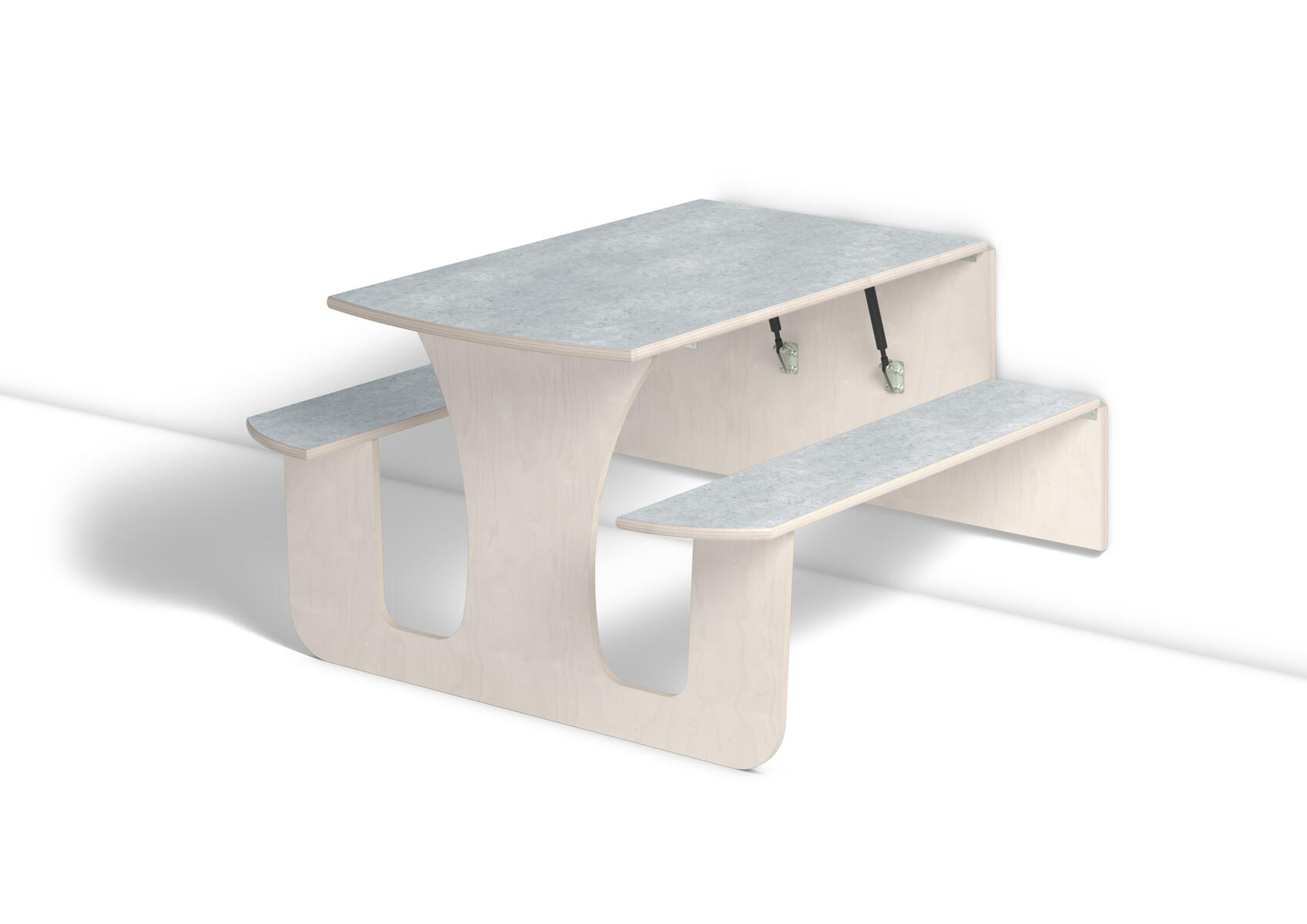 Vägghängande bord med låsanordning och dämpande gaskolvar, vilket ger ett säkert bord som fälls ned sakta och kontrollerat. Kräver montering. Vitpigmenterad björk. Bordsskiva med linoleum och lackad undersida. Integrerad sittbänk. Djup från vägg i uppfällt läge: 55 mm.