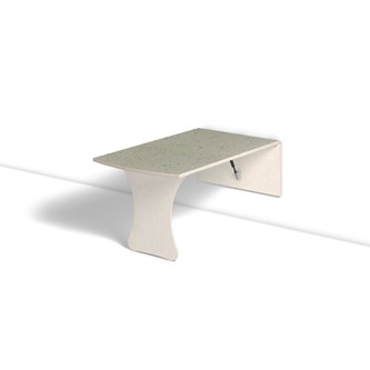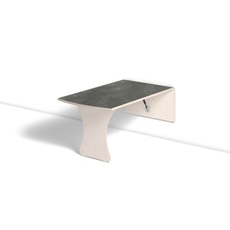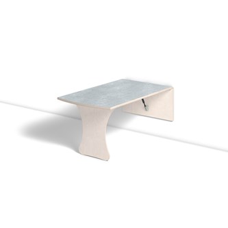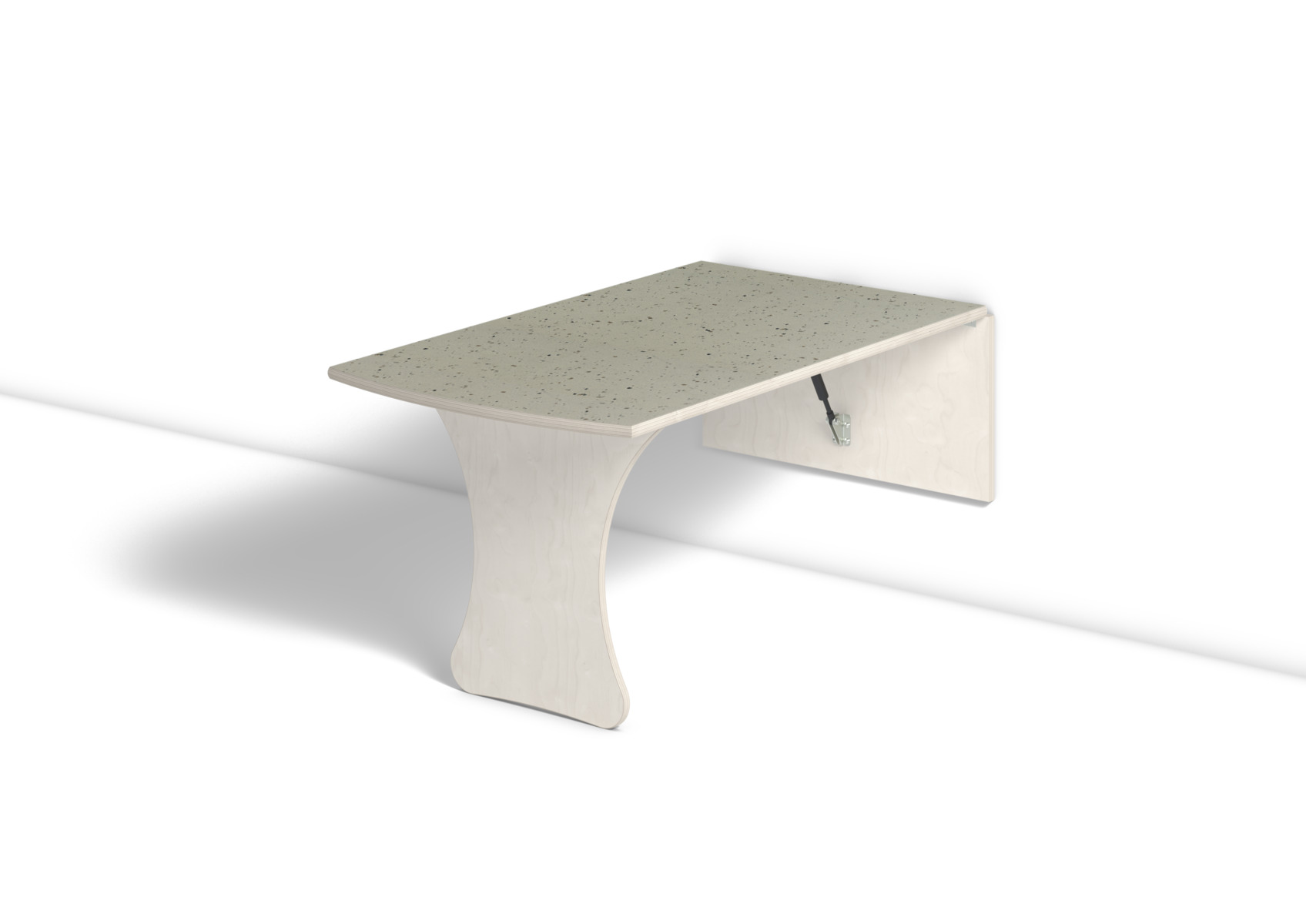 Vägghängande bord med låsanordning och dämpande gaskolvar, vilket ger ett säkert bord som fälls ned sakta och kontrollerat. Kräver montering. Vitpigmenterad björk. Bordsskiva med linoleum och lackad undersida. Integrerad sittbänk. Djup från vägg i uppfällt läge: 55 mm.