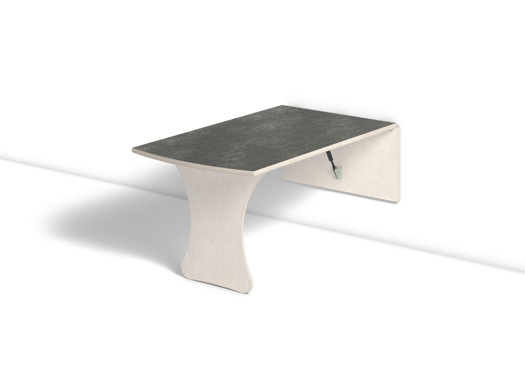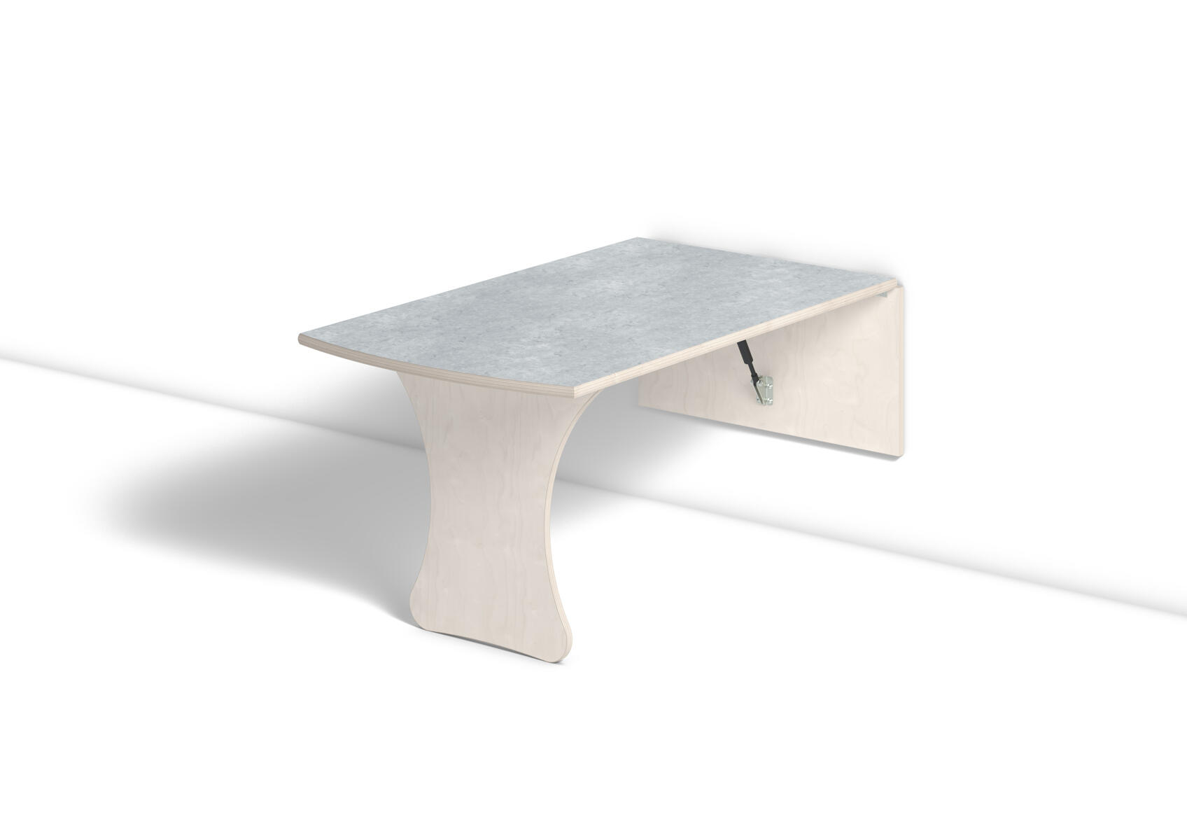 Vägghängande bord med låsanordning och dämpande gaskolvar, vilket ger ett säkert bord som fälls ned sakta och kontrollerat. Kräver montering. Vitpigmenterad björk. Bordsskiva med linoleum och lackad undersida. Djup från vägg i uppfällt läge: 55 mm.