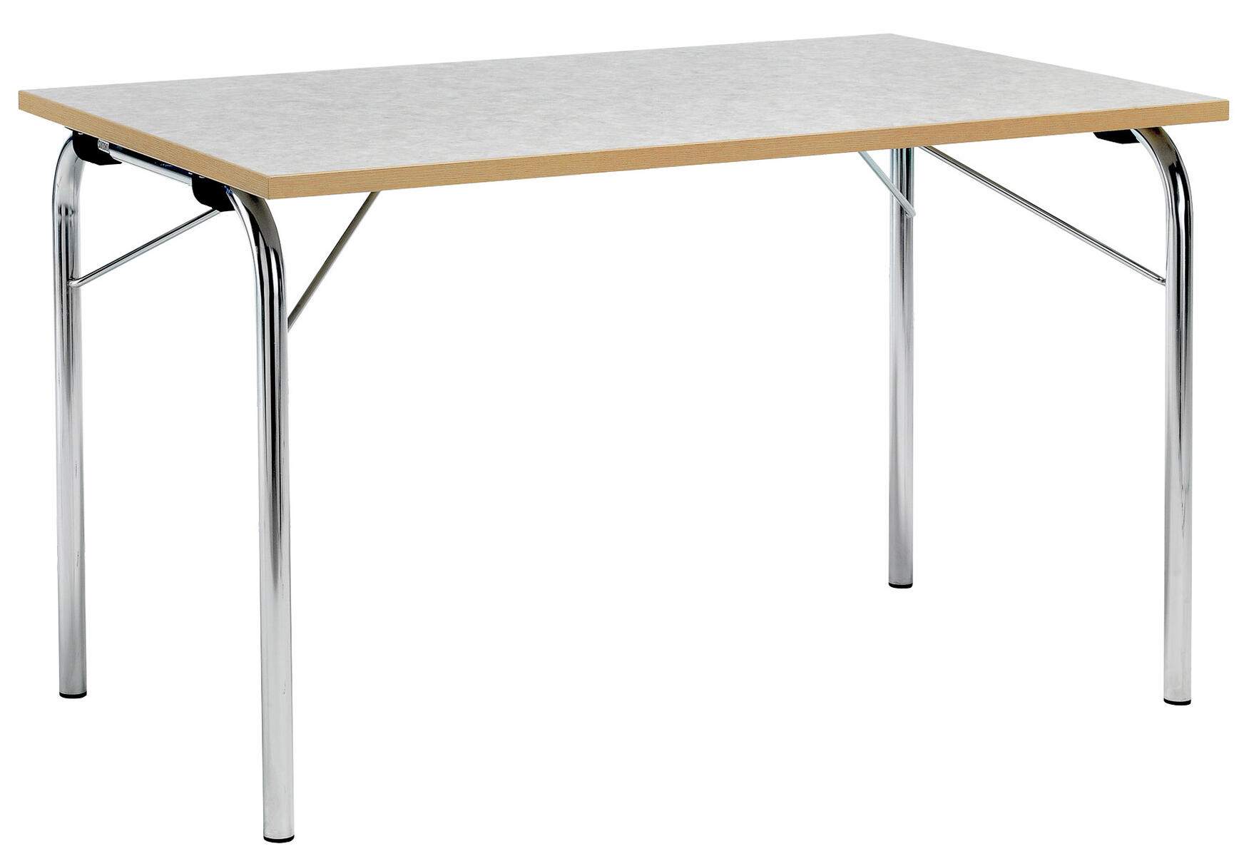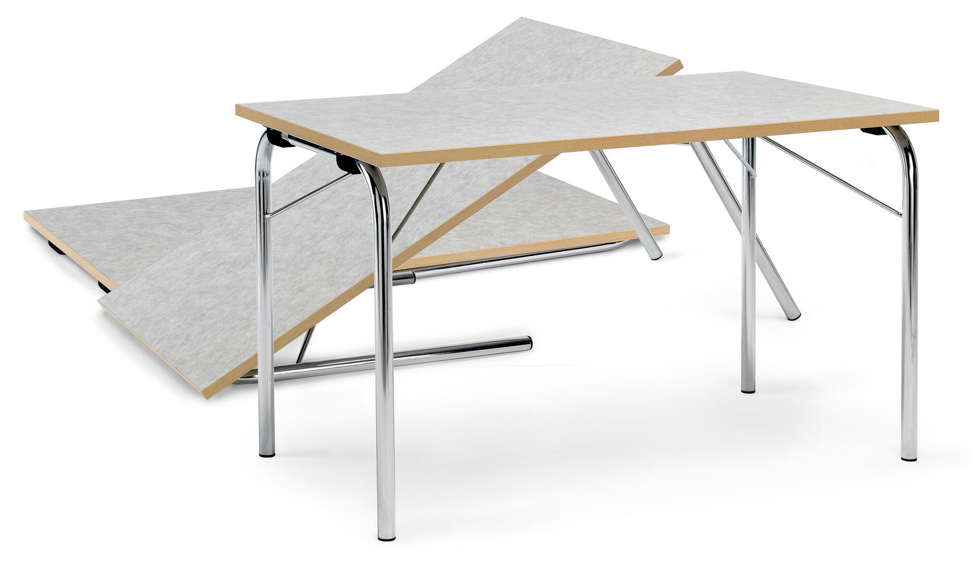 Bord med fällbara ben. Höjd 72 cm. Skiva i högtryckslaminat. Silverlackerat stativ RAL 9006. Stapelhöjd 7 cm.