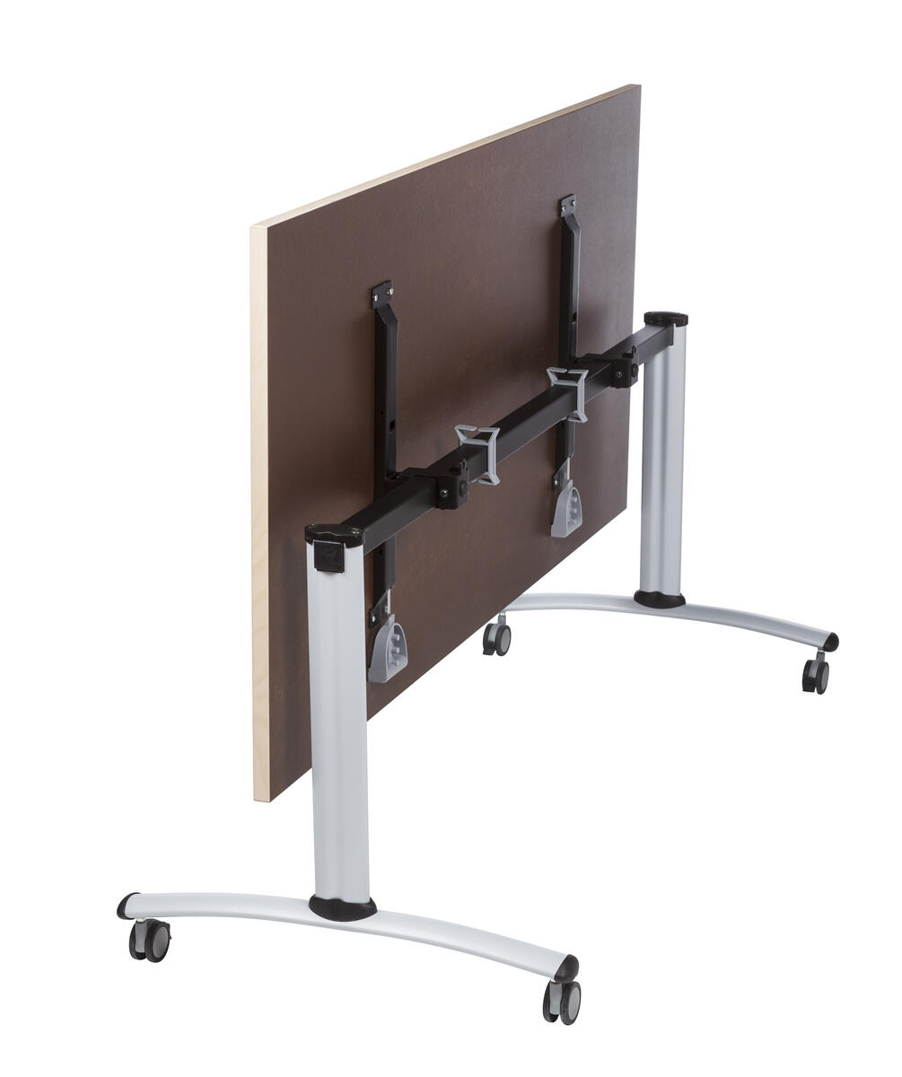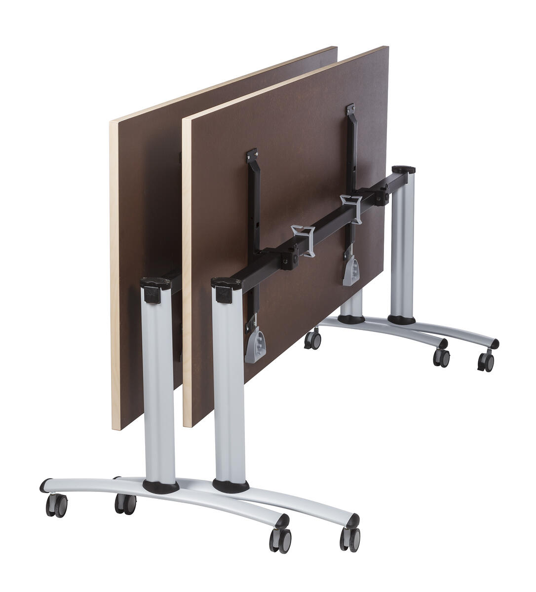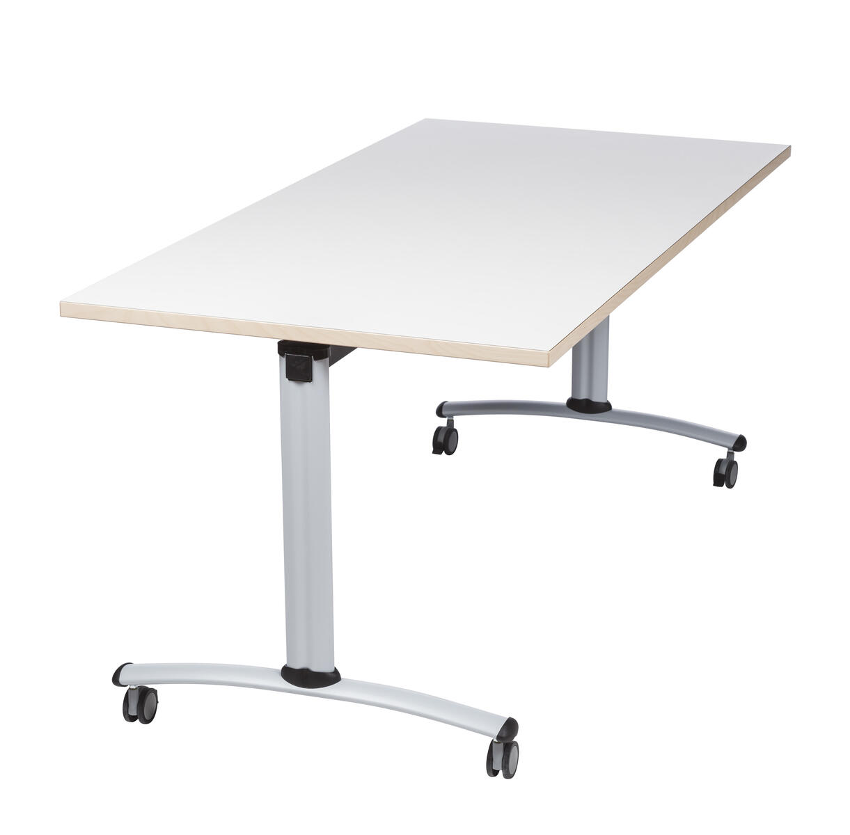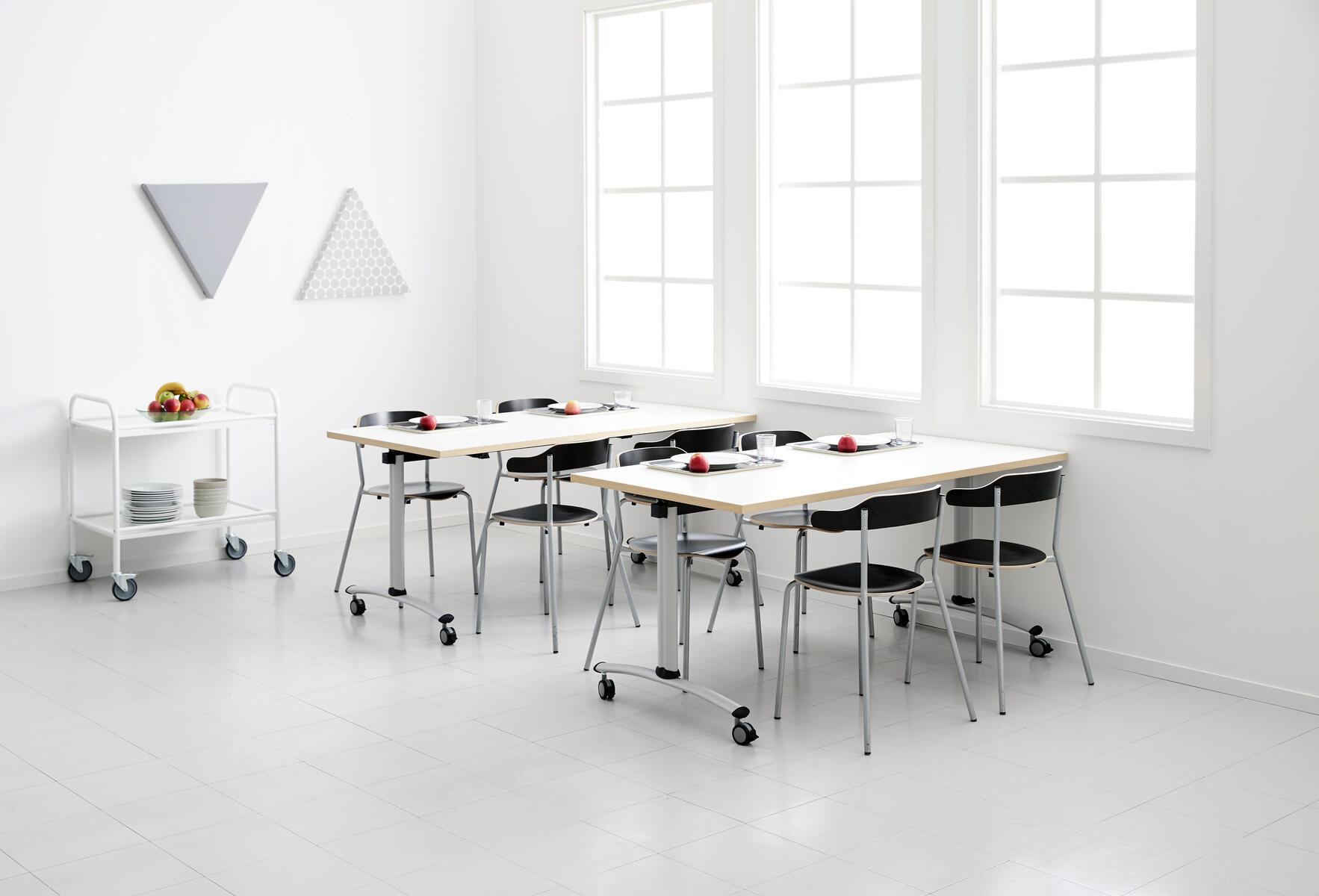 Bord med fällbar skiva som enkelt går att fälla upp eller ned genom att dra i två handtag på undersidan av bordsskivan. Skiva i akustik linoleum. Höjd 72 cm. Silverlackerat stativ i RAL 9006 med fyra låsbara hjul.
