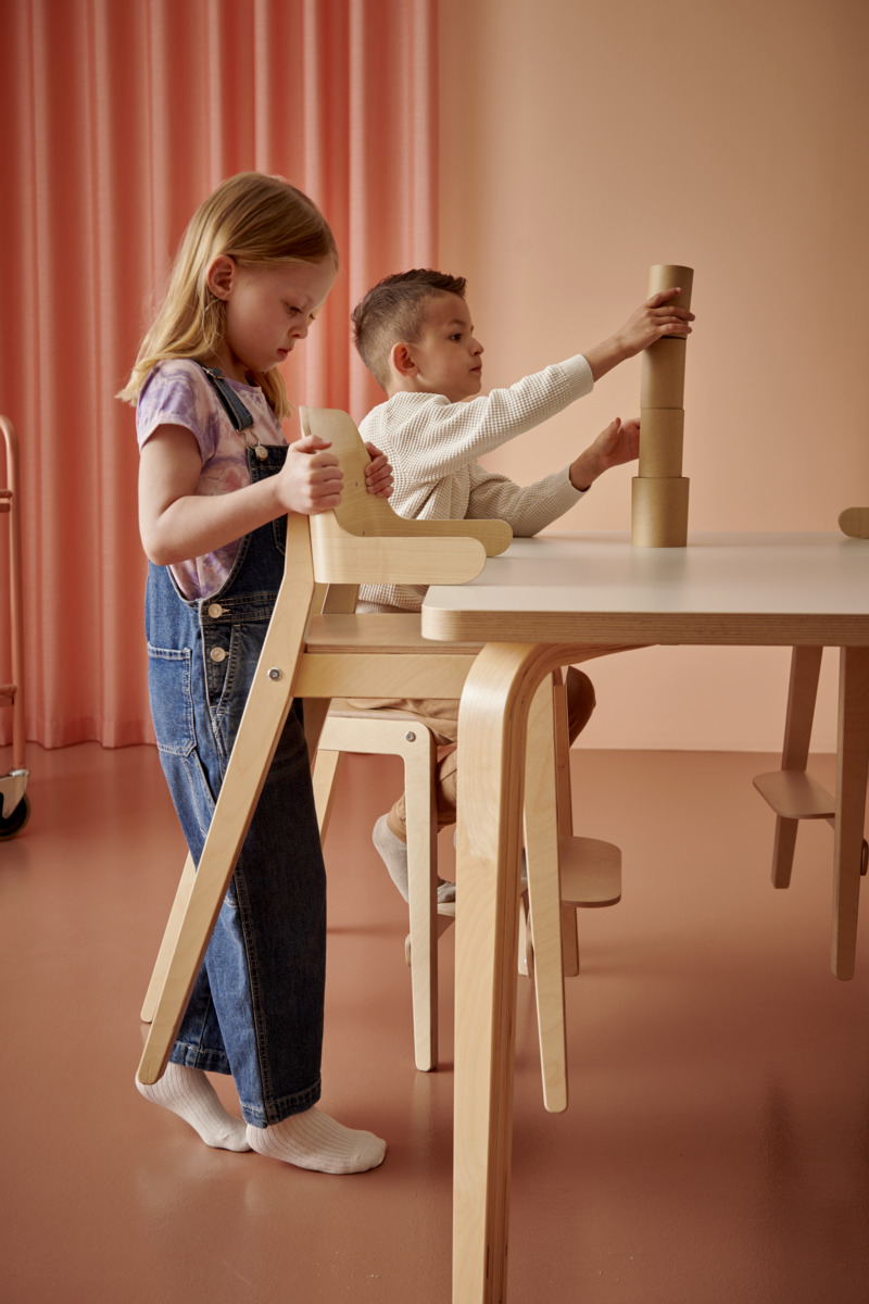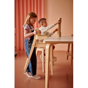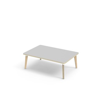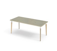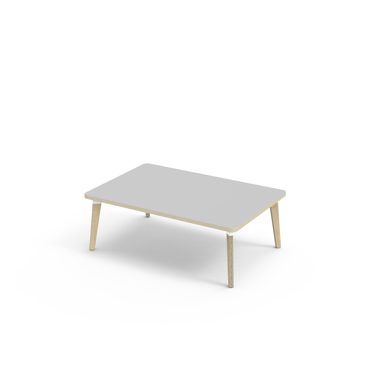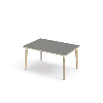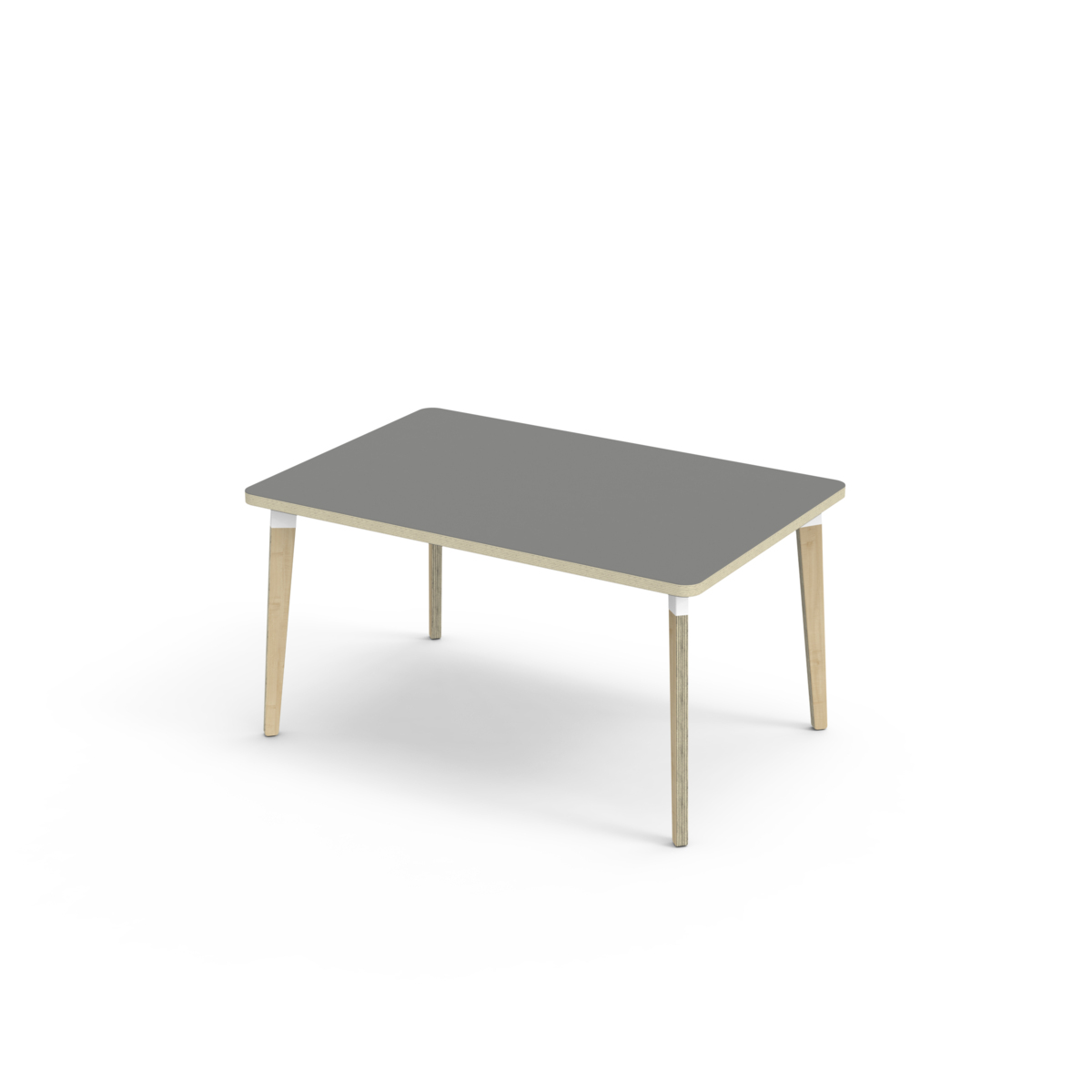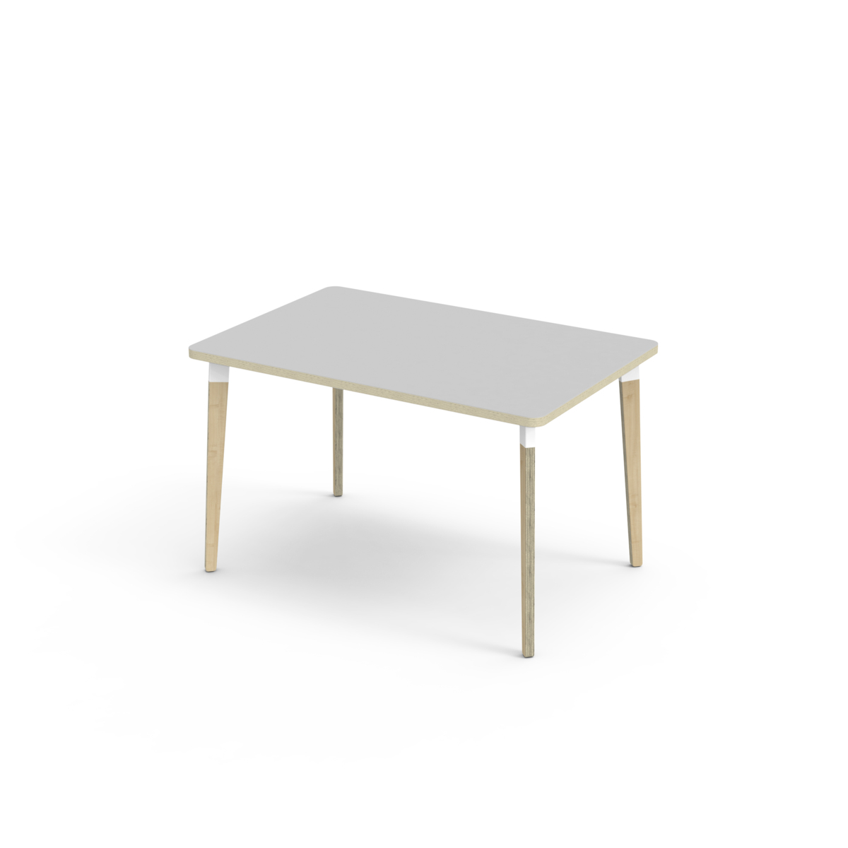 Bordsskiva belagd med akustik linoleum, vilket ger en mjuk och behaglig yta samtidigt som det bidrar till en bättre ljudmiljö. Med en hörnradie på 40 mm får bordet en modern och stilren design. Benen har en rektangulär form och är tillverkade av klarlackad björkplywood som är monterade i en robust vit metallhylsa. Denna konstruktion garanterar både stabilitet och hållbarhet. Benen är något snett vinklade ut mot bordsskivans hörn. Monteringen är enkel och smidig – du behöver bara fästa metallhylsorna i de förberedda fästpunkterna i bordsskivan.