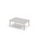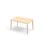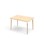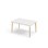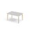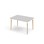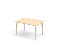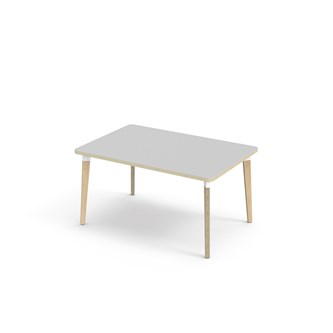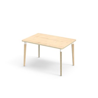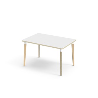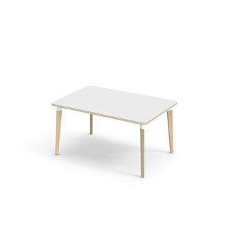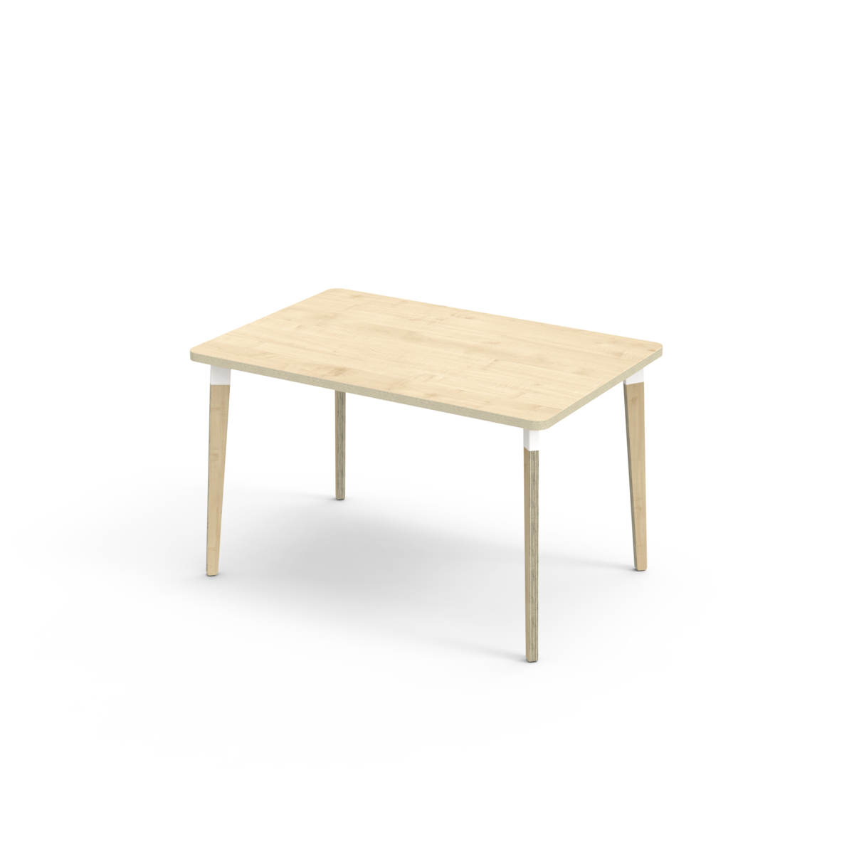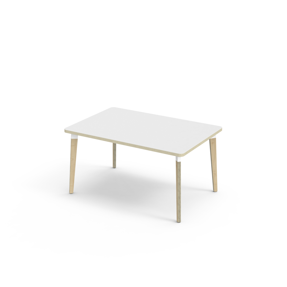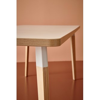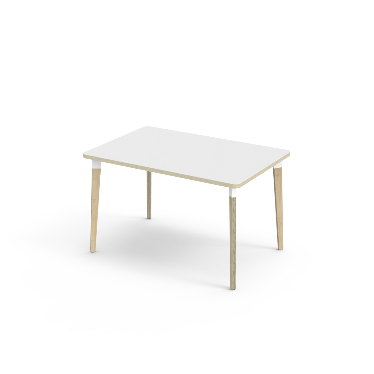 Bordsskiva belagd med laminat. Med en hörnradie på 40 mm får bordet en modern och stilren design. Benen har en rektangulär form och är tillverkade av klarlackad björkplywood som är monterade i en robust vit metallhylsa. Denna konstruktion garanterar både stabilitet och hållbarhet. Benen är något snett vinklade ut mot bordsskivans hörn. Monteringen är enkel och smidig – du behöver bara fästa metallhylsorna i de förberedda fästpunkterna i bordsskivan.