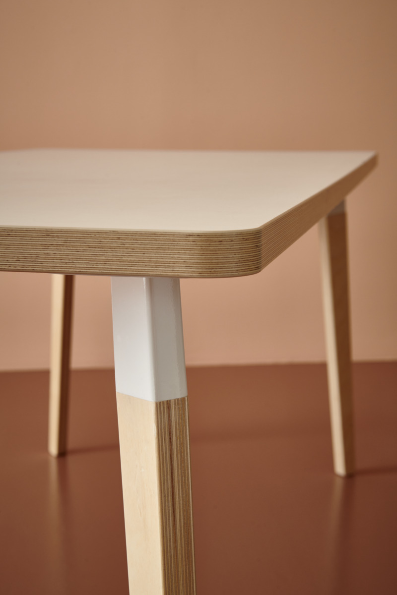 Bordsskiva belagd med högtryckslaminat, vilket ger en tålig yta. Med en hörnradie på 40 mm får bordet en modern och stilren design. Benen har en rektangulär form och är tillverkade av klarlackad björkplywood som är monterade i en robust vit metallhylsa. Denna konstruktion garanterar både stabilitet och hållbarhet. Benen är något snett vinklade ut mot bordsskivans hörn. Monteringen är enkel och smidig – du behöver bara fästa metallhylsorna i de förberedda fästpunkterna i bordsskivan.