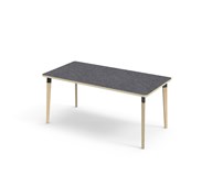 Bordsskiva belagd med akustik linoleum, vilket ger en mjuk och behaglig yta samtidigt som det bidrar till en bättre ljudmiljö. Med en hörnradie på 40 mm får bordet en modern och stilren design. Benen har en rektangulär form och är tillverkade av klarlackad björkplywood som är monterade i en robust svart metallhylsa. Denna konstruktion garanterar både stabilitet och hållbarhet. Benen är något snett vinklade ut mot bordsskivans hörn. Monteringen är enkel och smidig – du behöver bara fästa metallhylsorna i de förberedda fästpunkterna i bordsskivan.