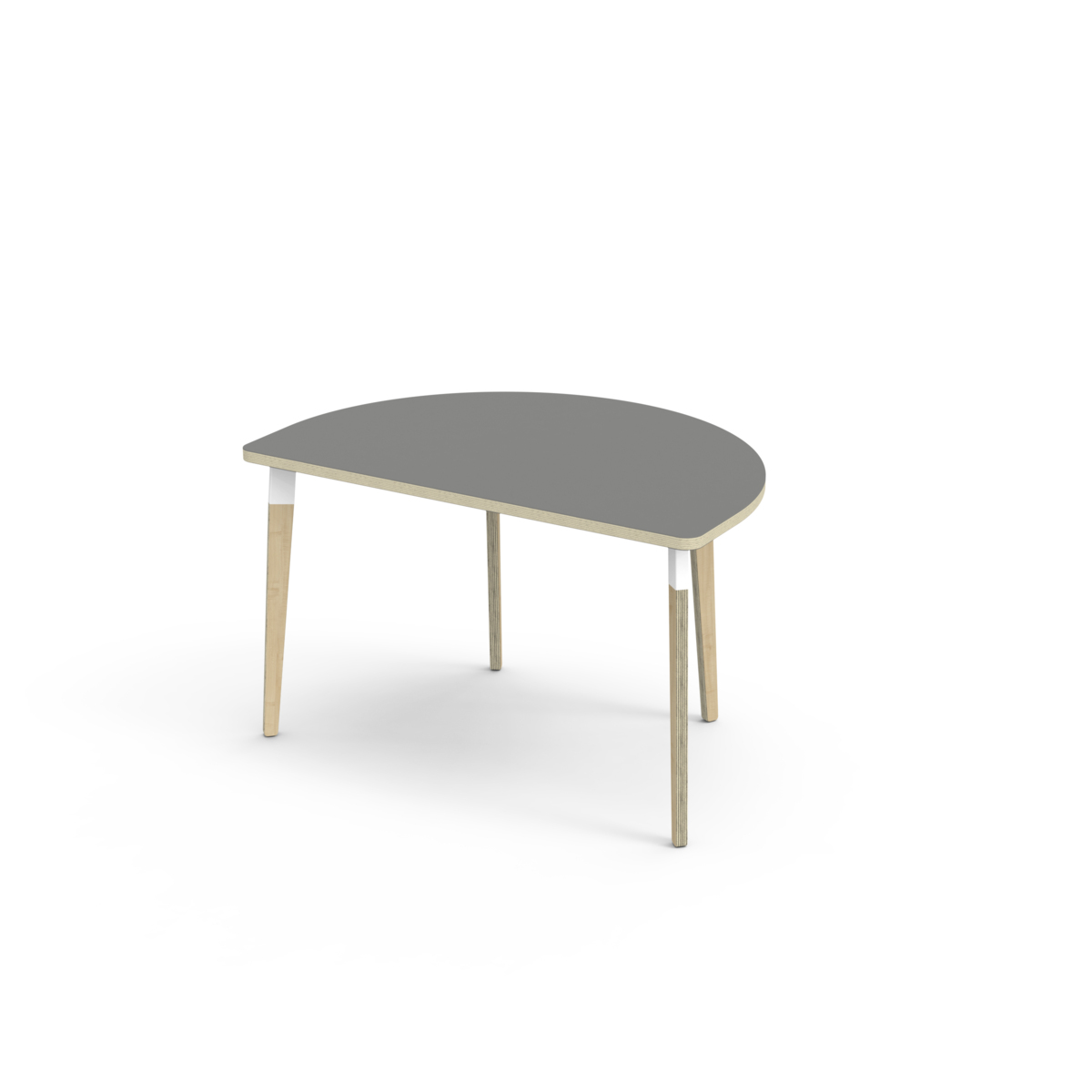 Bordsskiva belagd med akustik linoleum, vilket ger en mjuk och behaglig yta samtidigt som det bidrar till en bättre ljudmiljö. Med en hörnradie på 40 mm får bordet en modern och stilren design. Benen har en rektangulär form och är tillverkade av klarlackad björkplywood som är monterade i en robust vit metallhylsa. Denna konstruktion garanterar både stabilitet och hållbarhet. Benen är något snett vinklade ut mot bordsskivans hörn. Monteringen är enkel och smidig – du behöver bara fästa metallhylsorna i de förberedda fästpunkterna i bordsskivan.