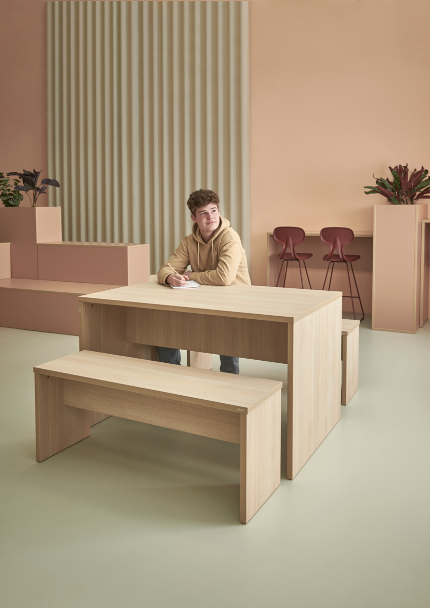 Scentrappa för en varierande lär- och kommunikationsmiljö. Material spånskiva med laminat. Kantlist i plywoodlook. Plastfötter.